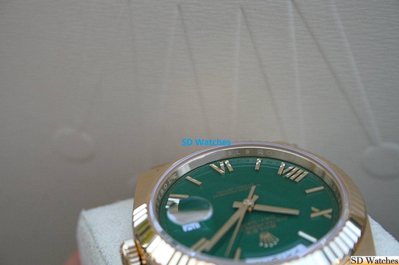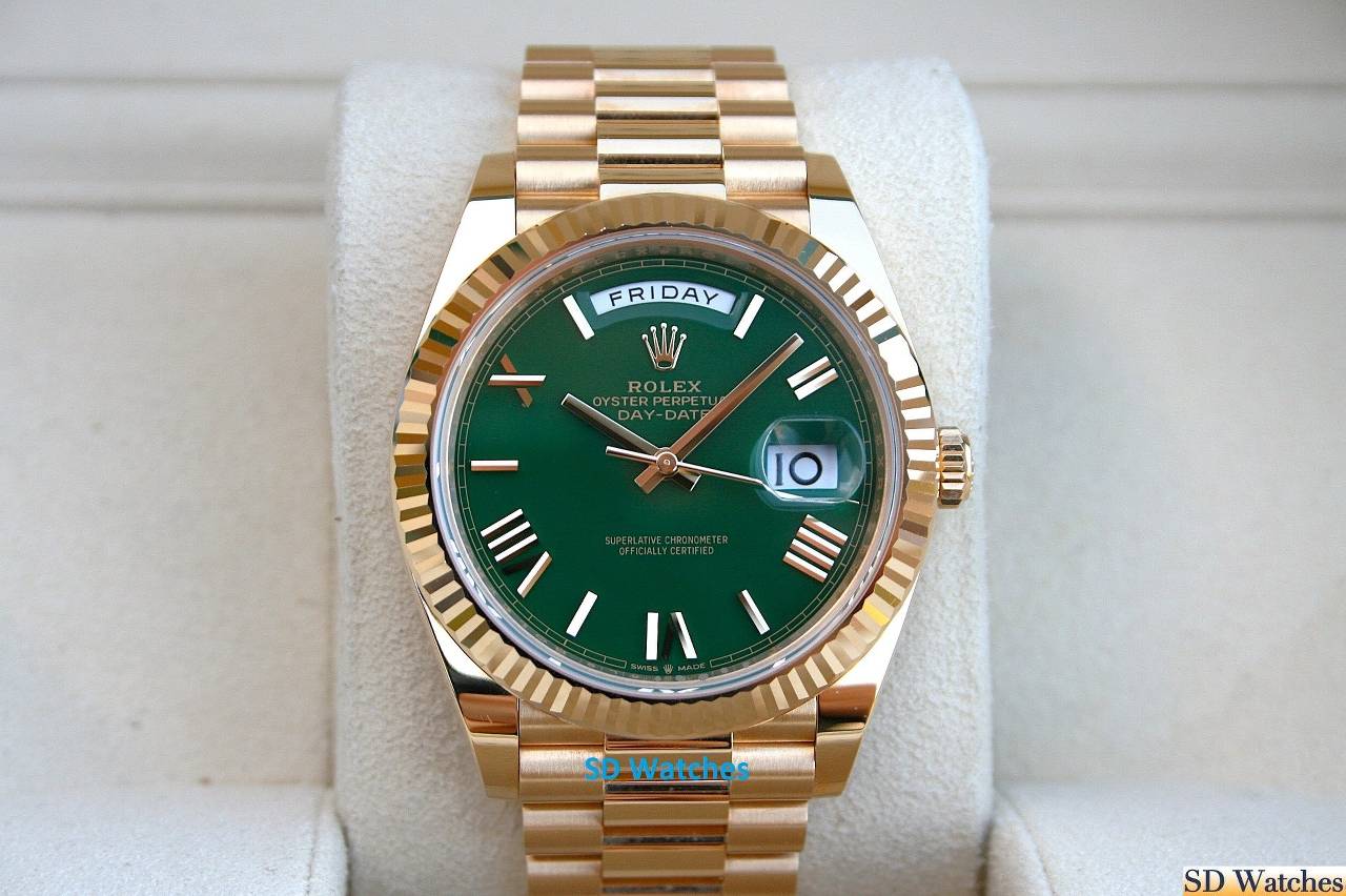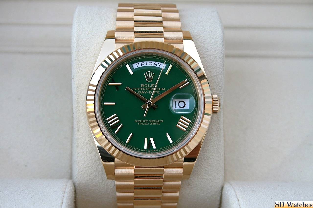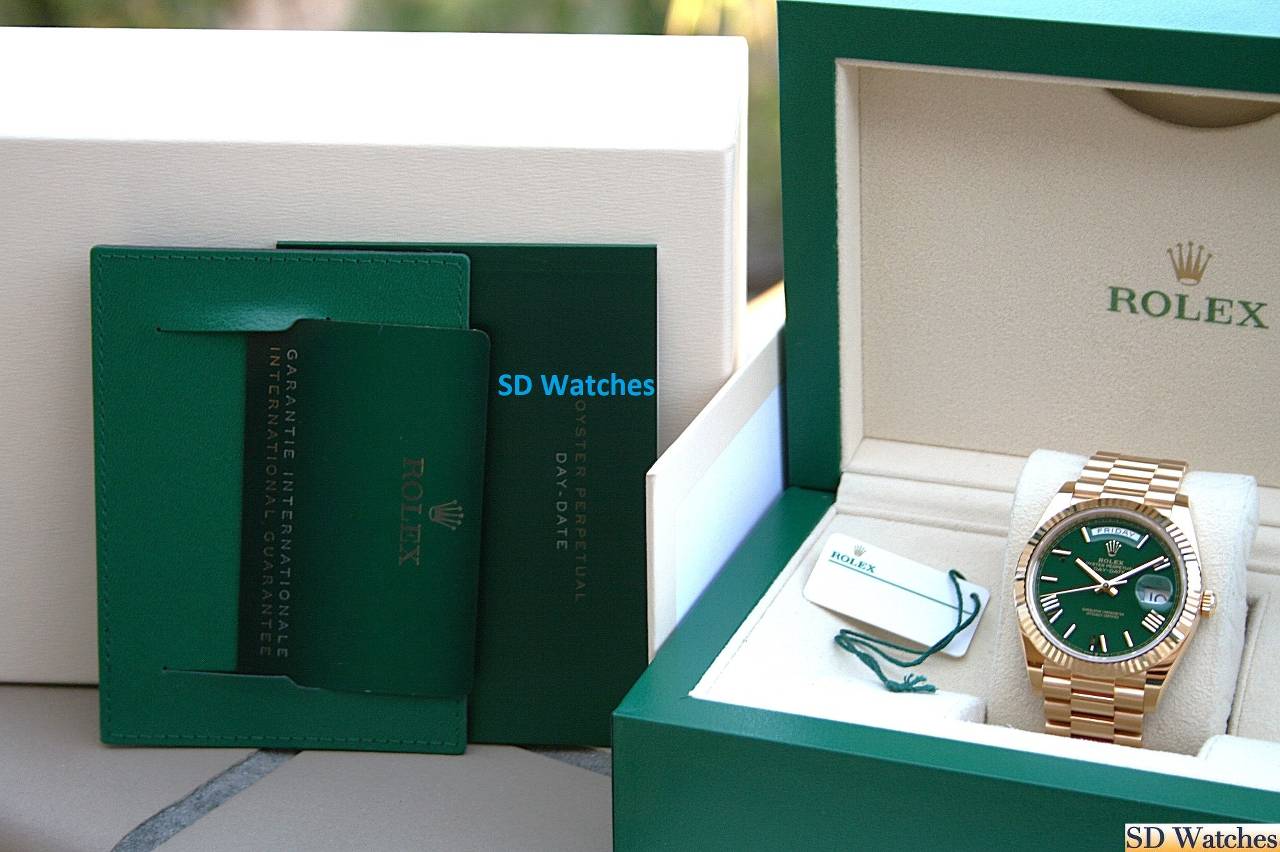 This watch comes in 18K Yellow gold, 40MM case with President band and Green Roman known as Green Money dial and a fluted bezel.