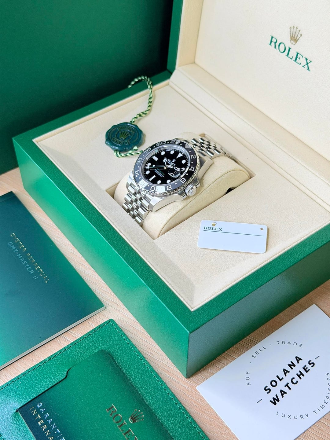 Selling this 40mm Rolex GMT Master II reference 126710GRNR /126710 on Oyster bracelet, aka the Bruce Wayne. **This GMT is in absolutely mint (unpolished) condition**. It still has most factory stickers on the case and clasp. **It** **comes as a full set**, including the Rolex green box, outer box, manual, warranty booklet, leather wallet, hangtag, serialized hangtag, and warranty card dated 2025. **Photos:** * [Album](https://imgur.com/a/bruce-wayne-april-november-2025-ahTWClO) * [Timestamp](https://i.imgur.com/ujWsOdf.jpeg) * [More on my Instagram @SolanaWatches](http://find%20me%20on%20Instagram%20@SolanaWatches) **Price is $20,500 delivered **in the US. **I am a full-time watch dealer, and I have completed many transactions here. **I can provide additional references upon request. **Feel free to contact me** via PM here so we can exchange numbers and get on the phone or do a video call. You can also [find me on Instagram @SolanaWatches](https://www.instagram.com/solanawatches/). _Private showroom located in San Diego, CA. Reach out to schedule an appointment._ _All my watches are guaranteed 100% authentic, and I will stand by their authenticity. _ _California buyers without a seller’s permit are subject to sales tax._