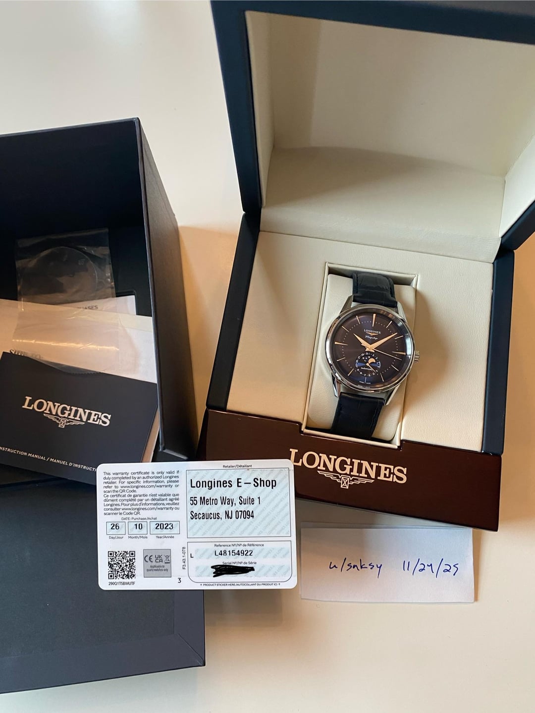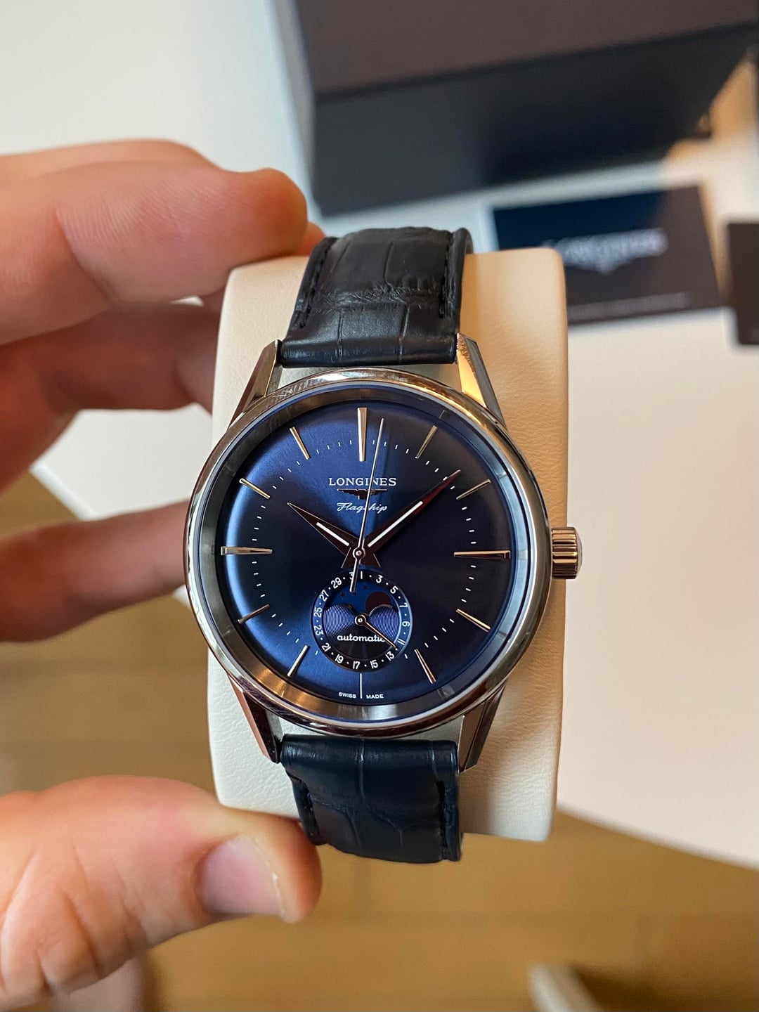 For sale today is the beautiful Longines Flagship Heritage Moonphase with the blue sunray dial. The caseback includes an 18k gold medallion painted with blue enamel. Model number L4.815.4.92.2. 38.5mm case, 46.5mm lug-to-lug, 12.4mm thin, 19mm lug width. I am the original owner, purchased directly from Longines in October 2023. Running well within spec + see pictures for the mint condition. Comes with original everything. Only selling due to the acquisition of a watch for my upcoming wedding. Asking $2200 shipped within the CONUS. Will send insured via USPS. Payment via Zelle, Venmo, or PayPal F&F (add 3.5% for G&S). This is the first example of this watch I’ve seen for sale on Reddit and well over $1k off retail. Please don’t hesitate to reach out with any questions. Hoping someone else can enjoy this beautiful watch as much as I have!