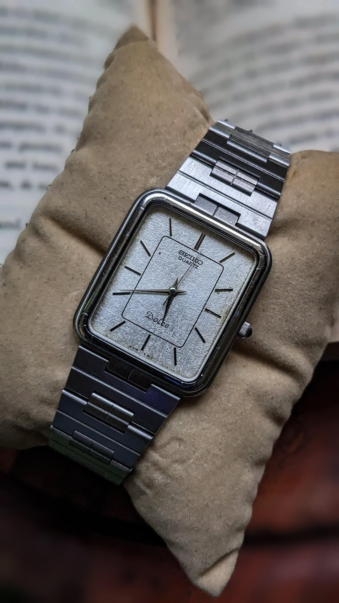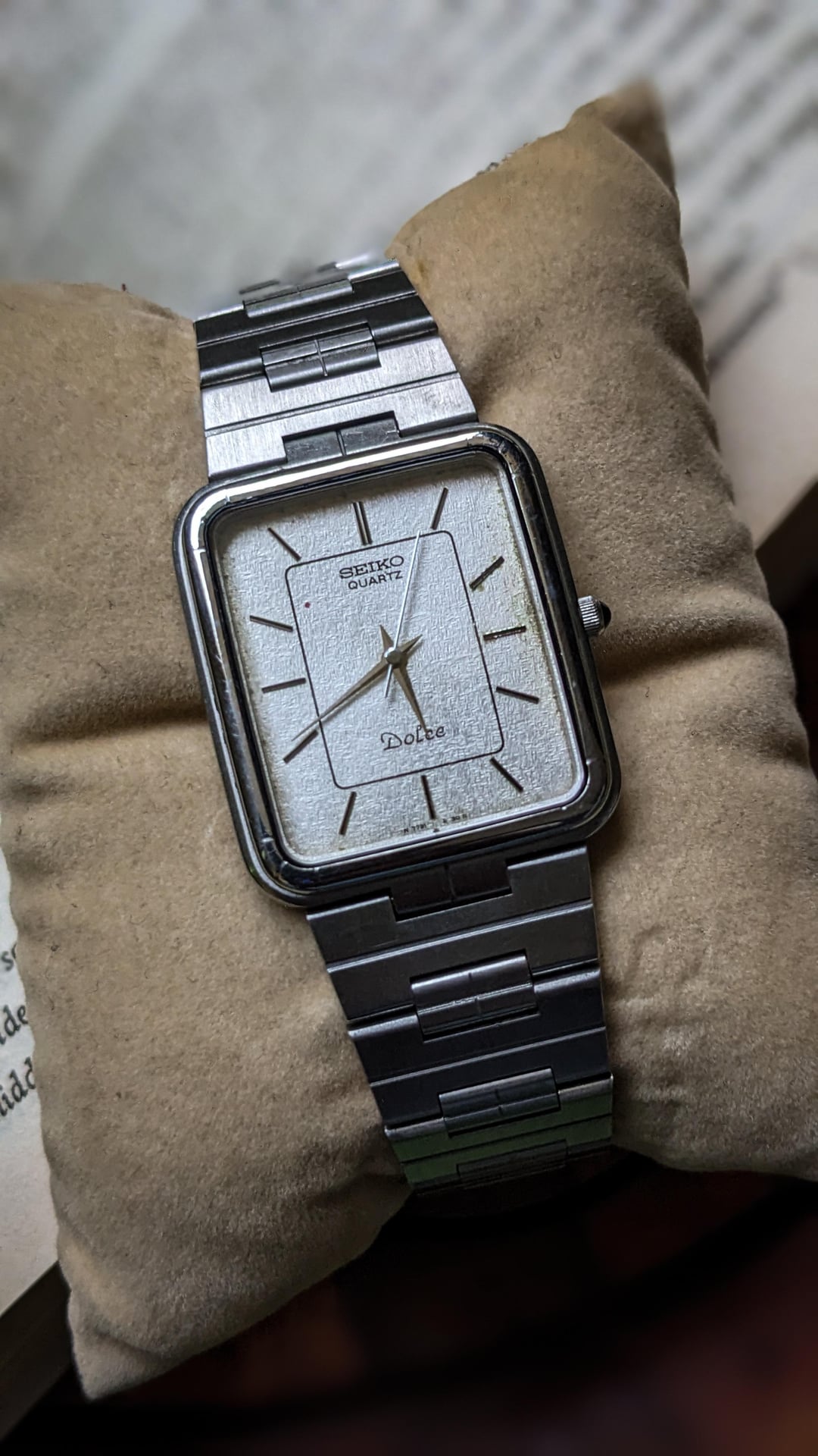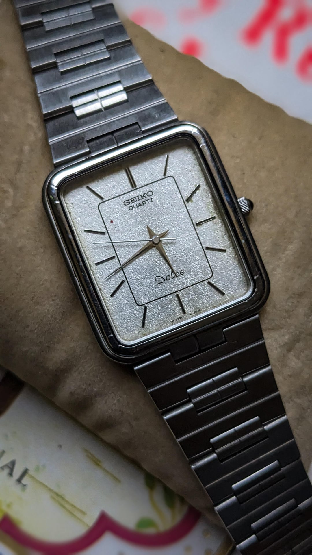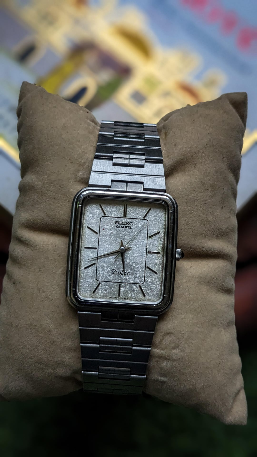 Hello everyone, Up for sale is a refined Seiko Dolce Ref. 7731-5030, elegant vintage dress watch known for its slim profile and understated styling. A perfect minimalist piece for daily wear or formal occasions. ⏱ Model: Seiko Dolce 📇 Reference: 7731-5030 💎 Movement: Seiko Quartz - running well and keeping good time 📐 Case Size: • 27mm width • 30mm height 🎨 Dial: Classic Dolce styling simple, elegant, and timeless 💪 Case Material: Stainless steel ⚙ Condition: refer to pictures 🧯 Accessories: Watch only A beautiful and hard-to-find vintage Seiko Dolce with a compact, classy dress-watch presence. 💵 Price: 145$ 📸 Timestamp: [https://imgur.com/a/cecm2sc](https://imgur.com/a/cecm2sc) 📩 Please comment here before sending a PM. Thanks for looking!