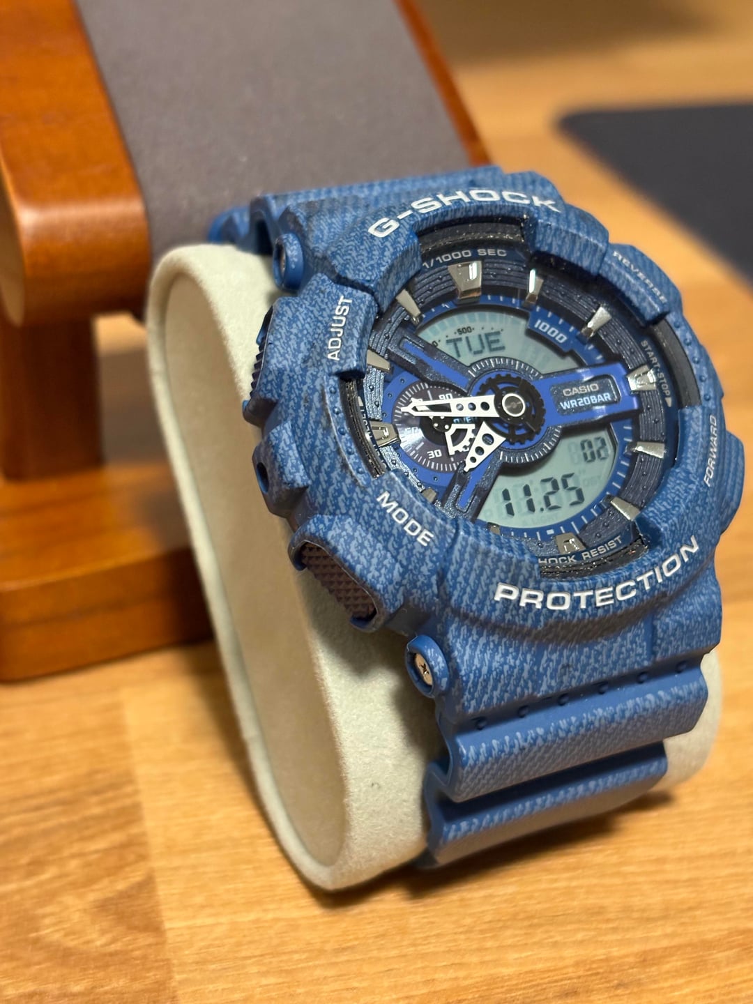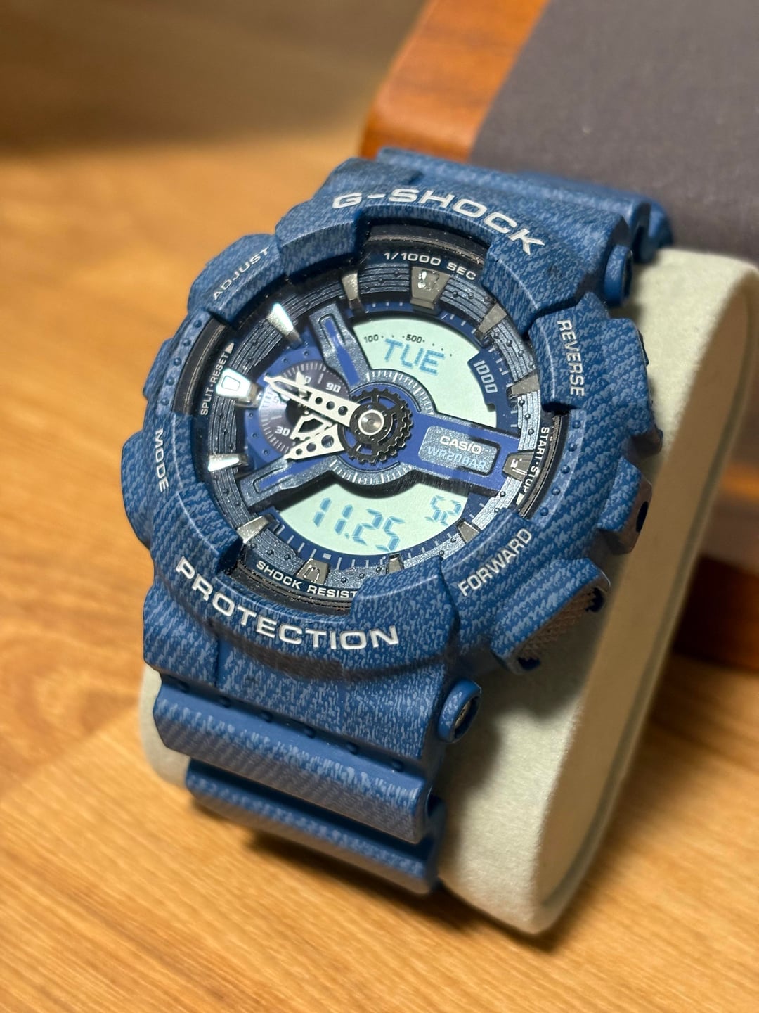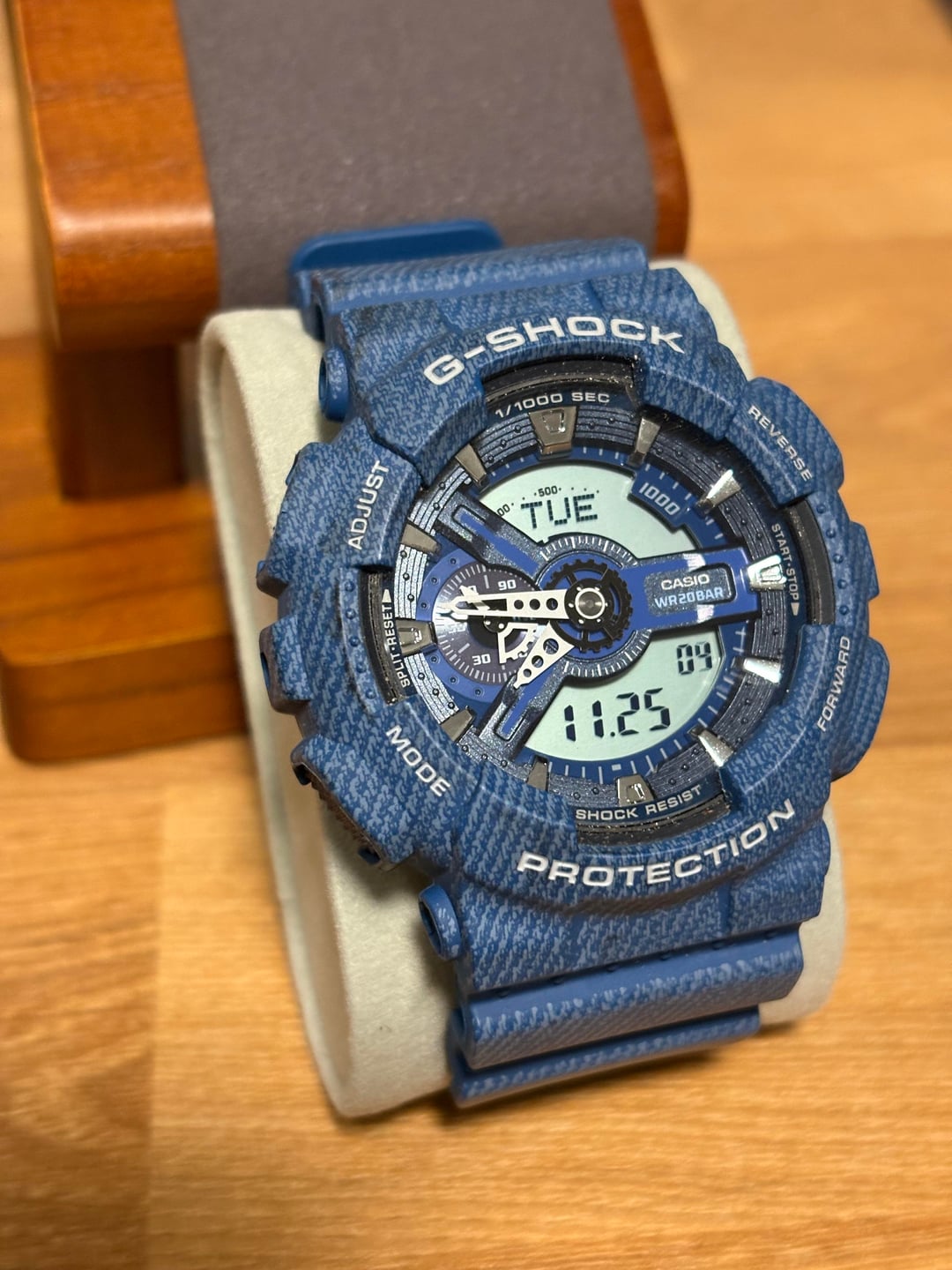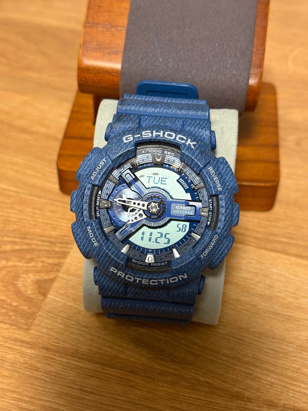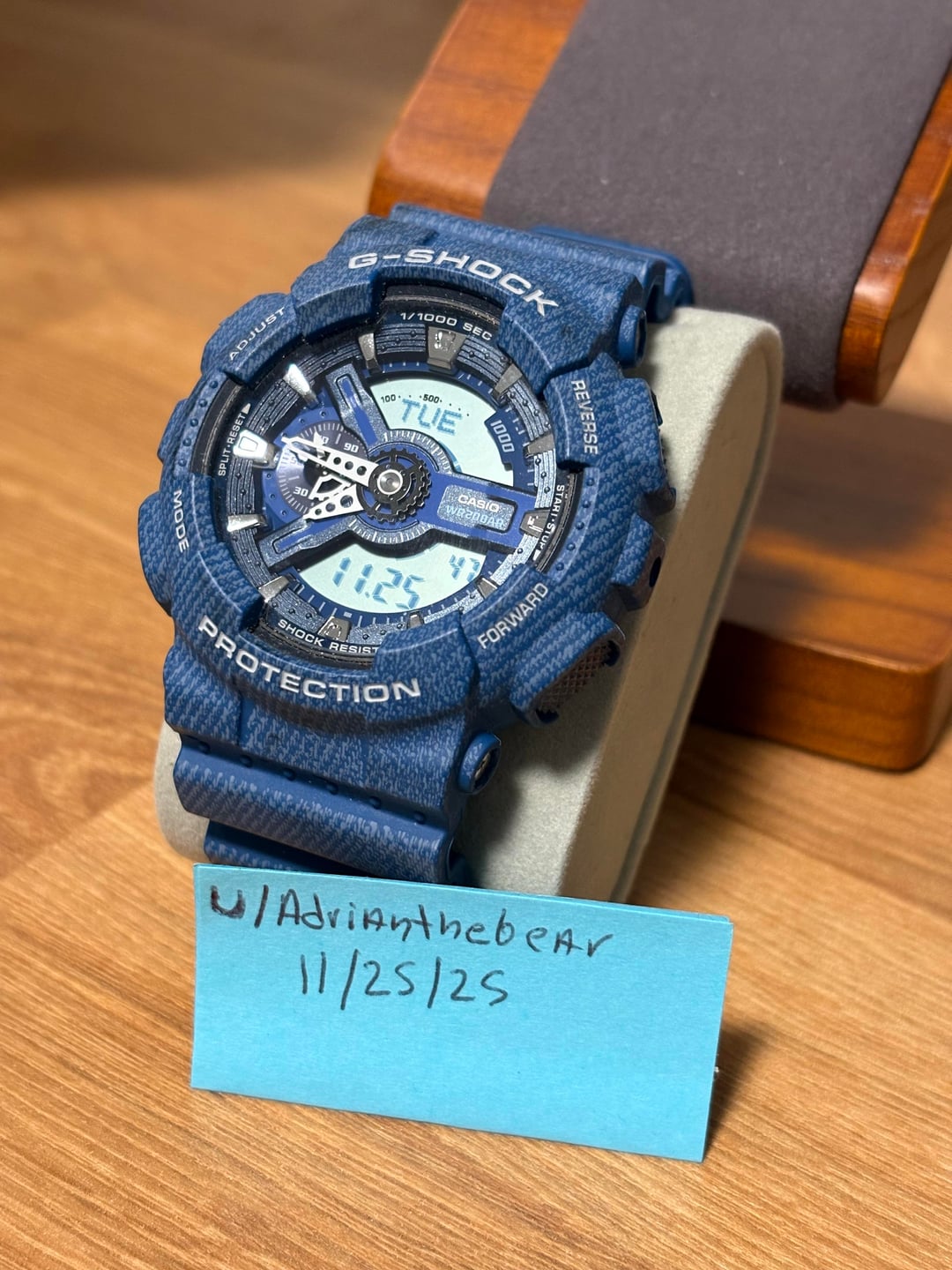 Hi Watch Ex, For Sale: Casio G-Shock “Blue Denim” GA-110DC Selling my Casio G-Shock GA-110DC “Blue Denim” edition in excellent condition with some normal wear. This model features the iconic oversized GA-110 case with a unique denim-patterned resin bezel and strap. The watch is clean, crystal is scratch-free, and all functions operate perfectly. Great mix of durability, style, and everyday reliability. Specs: • Model: Casio G-Shock GA-110DC (Blue Denim Series) • Case & Strap: Resin with denim-texture pattern • Movement: Quartz (Analog + Digital) • Functions: • World time • 1/1000-sec stopwatch • Countdown timer • 5 daily alarms • LED light • 12/24-hour formats • Water Resistance: 200m (20 BAR) • Shock Resistant: Yes • Crystal: Mineral • Condition: Excellent – clean crystal, strong strap, fully functional Price: $85 shipped within CONUS