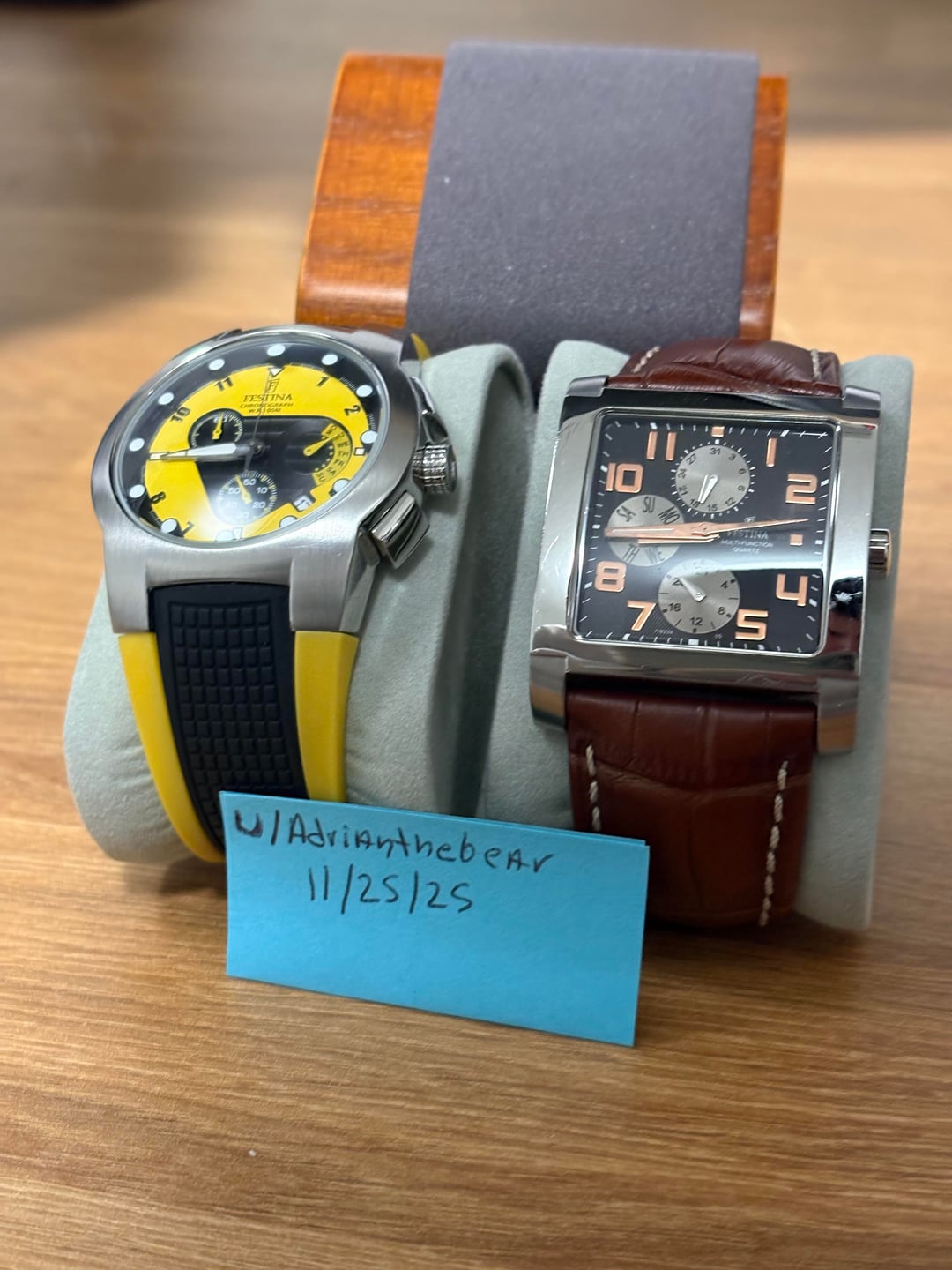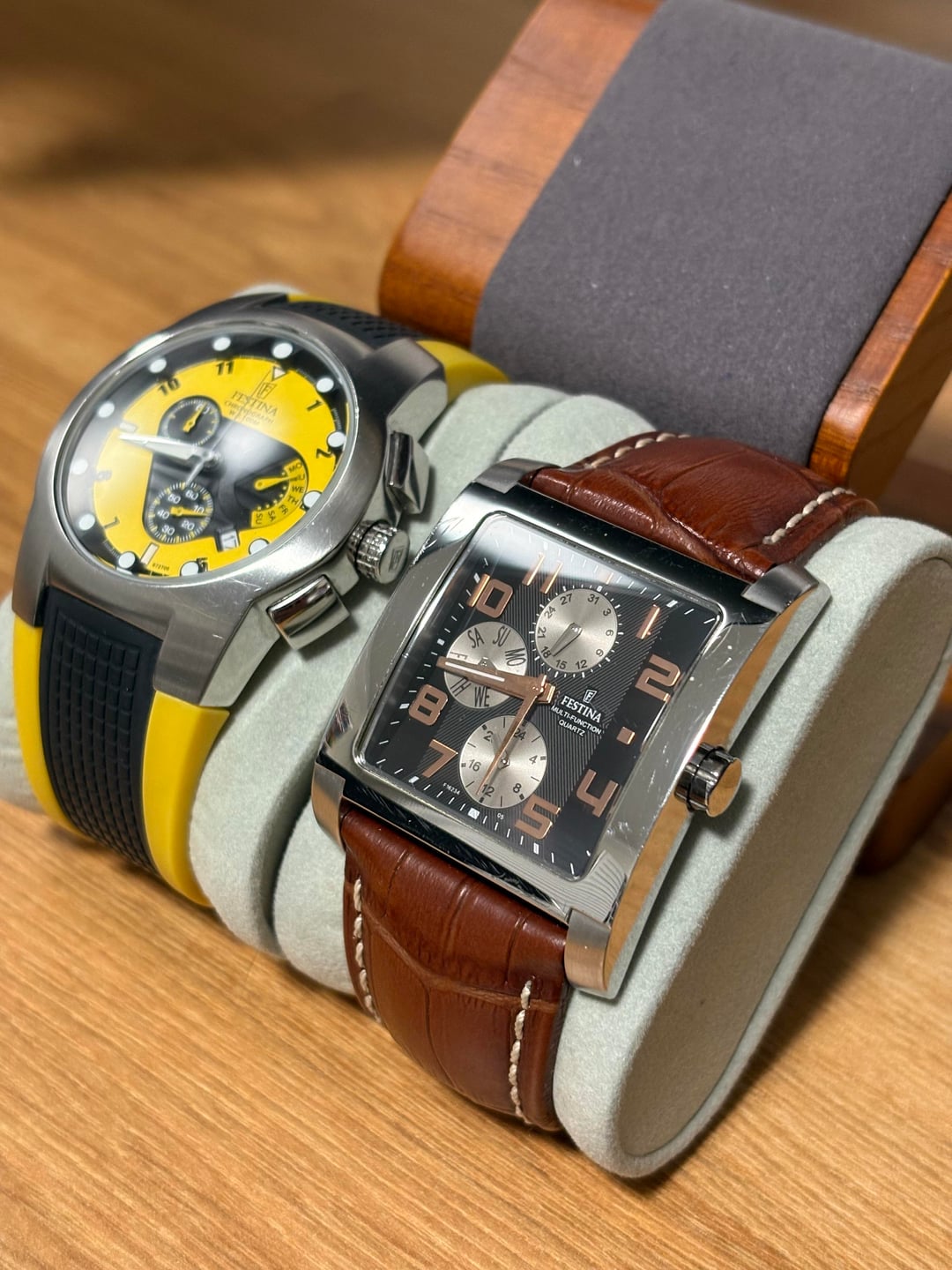 Hi WatchEx, Selling two Festina watches from my collection. Both watches are in great cosmetic and functional condition, with clean crystals, fully working chronograph functions, and well-kept cases. Perfect for someone who wants a reliable pair of everyday quartz chronographs with two completely different looks. Watch only but will include a watch travel pouch for each. ⸻ 1. Festina Yellow Dial Chronograph (Rubber Strap) Bright and sporty design with a striking yellow dial. Minimal wear on the case, crystal is clean, and the black/yellow rubber strap is in excellent shape. Runs perfectly. Specs: • Movement: Quartz chronograph • Case: Stainless steel • Dial: Yellow with black sub-dials • Functions: Chronograph, 24-hour subdial, running seconds, date window • Strap: Black/yellow rubber • Crystal: Mineral • Condition: Excellent ⸻ 2. Festina Rectangular Black Dial Chronograph (Leather Strap) A classy rectangular design with a black dial and silver chronograph sub-dials. Crystal is clean, case shows light wear, and the brown leather strap has light but normal use. Specs: • Movement: Quartz multi-function • Case: Polished stainless steel (rectangular) • Dial: Black with silver sub-dials • Functions: Chronograph, 24-hour subdial, running seconds • Strap: Brown leather with white stitching • Crystal: Mineral • Condition: Very good ⸻ Price: $99 for both watches + $10 for shipping.