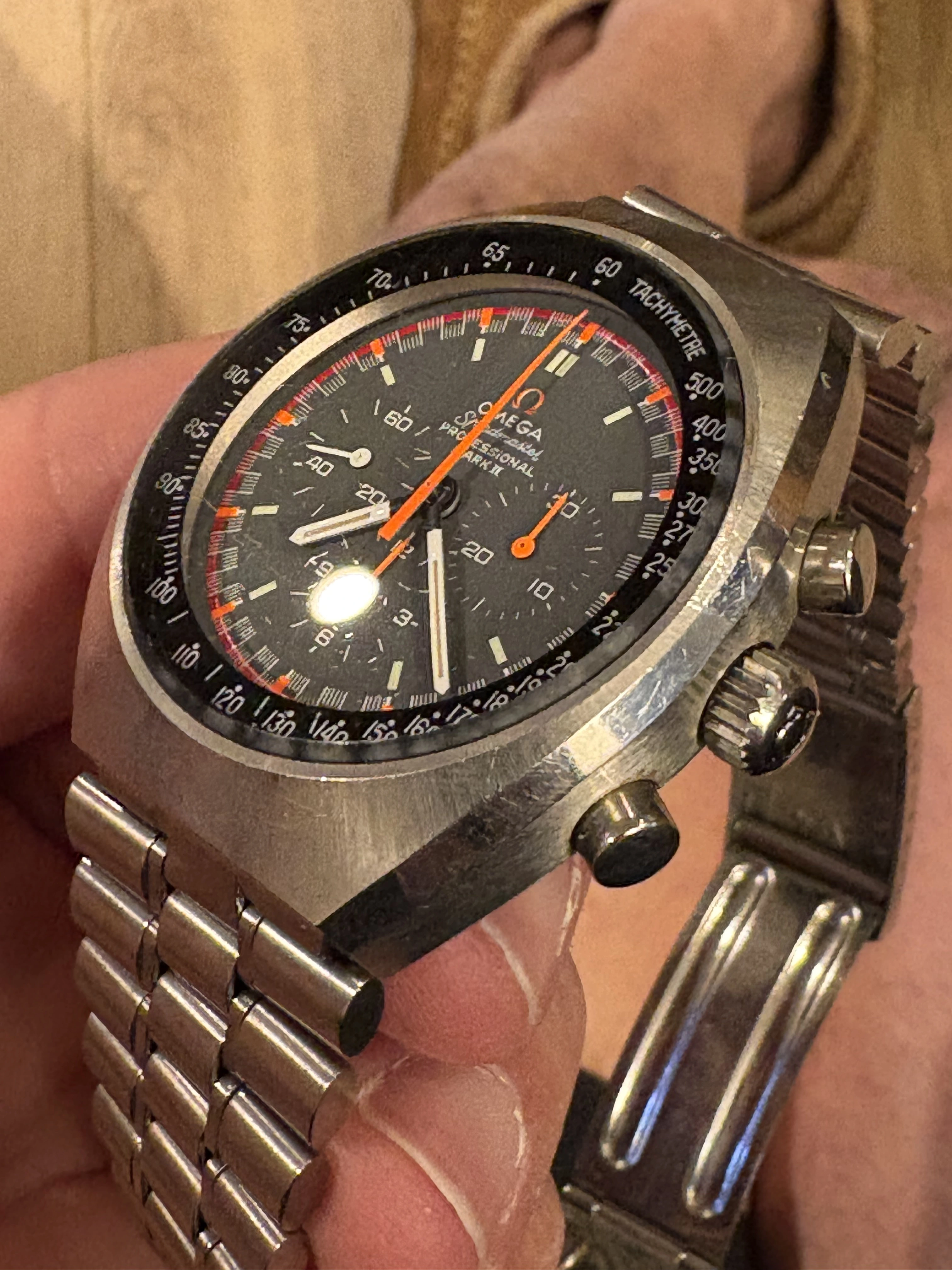 If sold here, 5% of the sale price will be donated to Omegaforums in appreciation for the platform.Nice honest Mk II Speedmaster 145.014 with racing dial. Notably, the dial and handset retain their vivid colors. The case shows some wear, but exhibits original finishes and sharp edges. Comes with original 21-link 1159 bracelet. This is a catch and release from a lot that I purchased locally from someone who had inherited a collection from a friend, and the condition of all the watches were similar - the owner clearly wore his watches, but maintained them and did not tamper with or polish them.