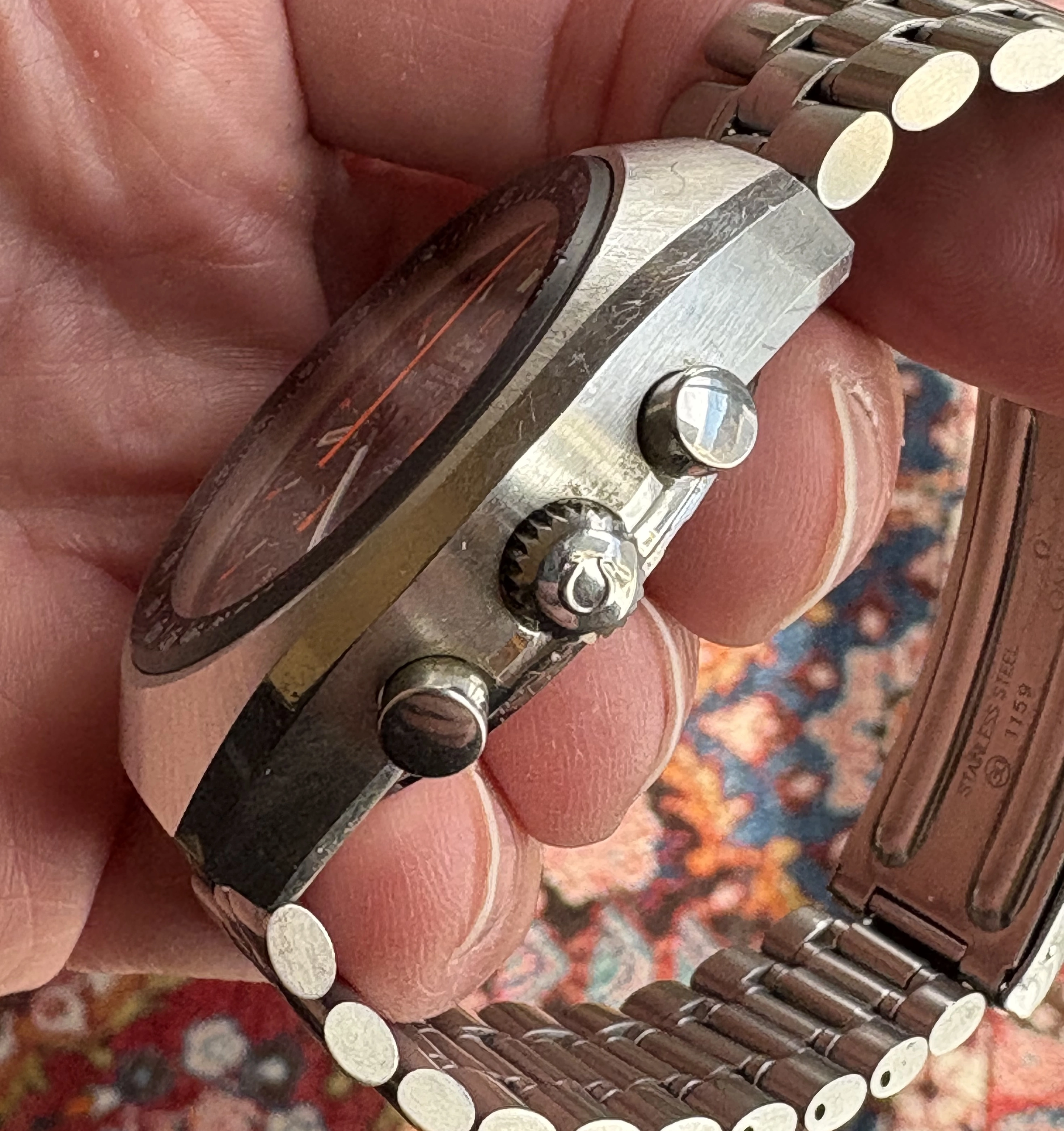 The watch has not been serviced in my possession, but is winding, setting, and running properly, including chronograph functions. As shown in the timegrapher photos, it is keeping good time but the amplitude is low, so a service is recommended for regular use.