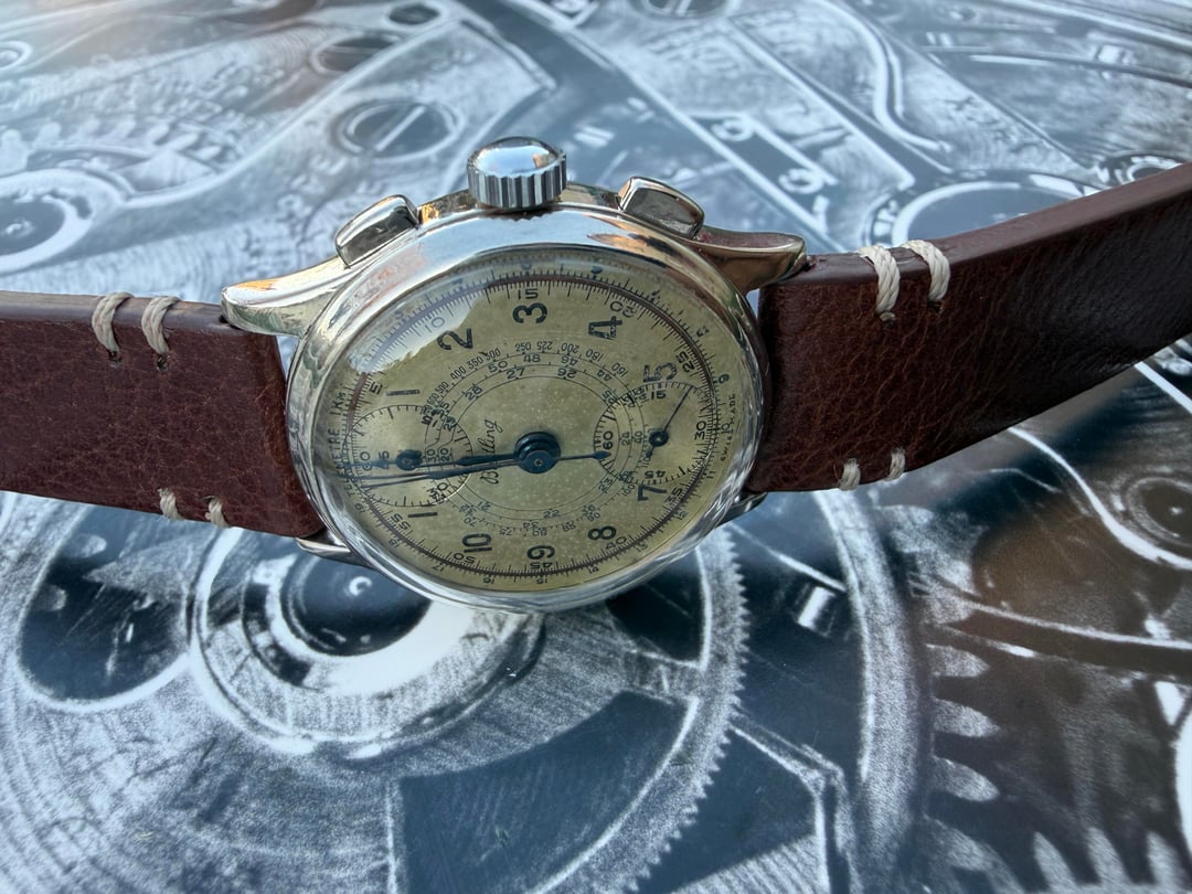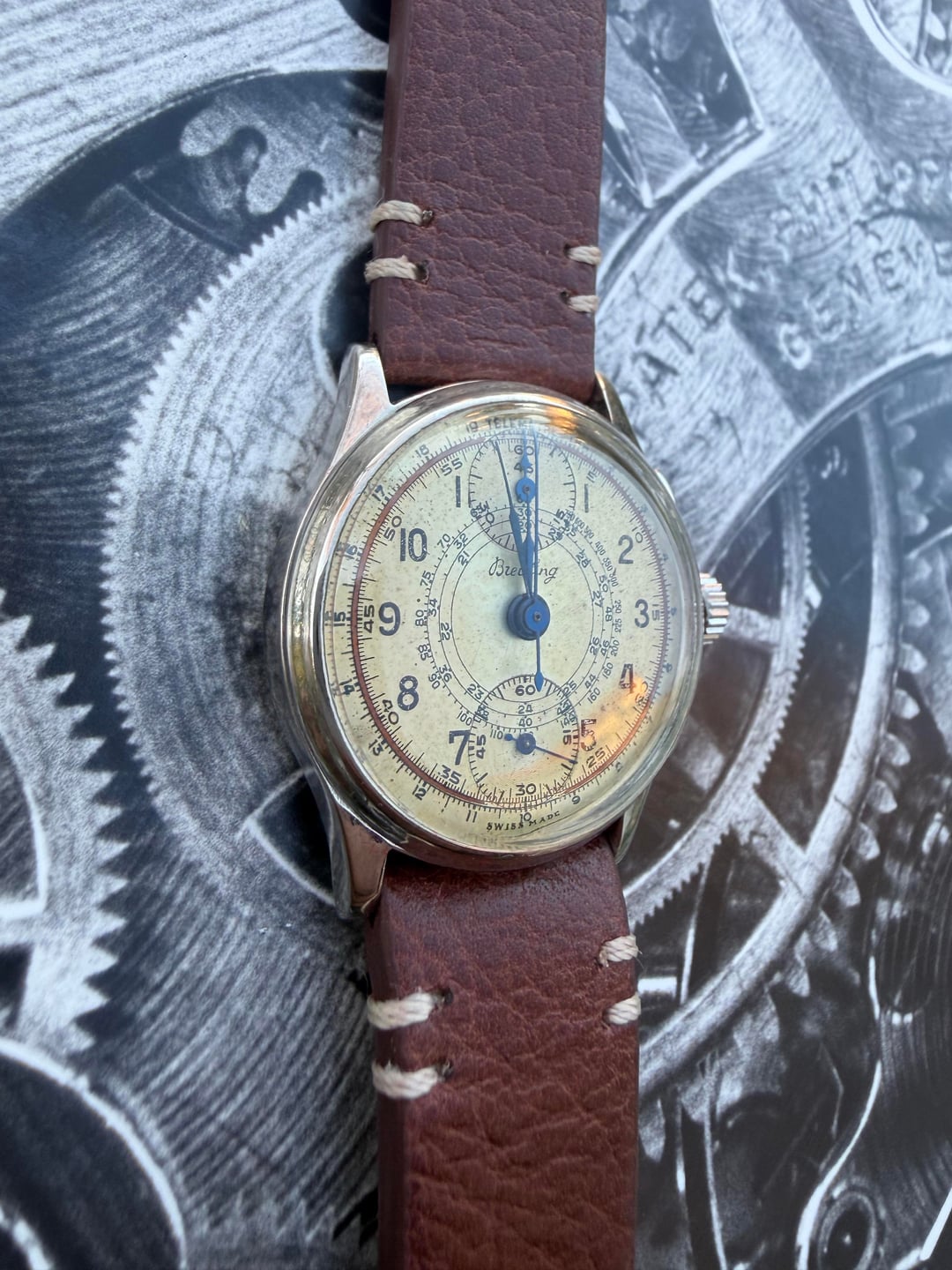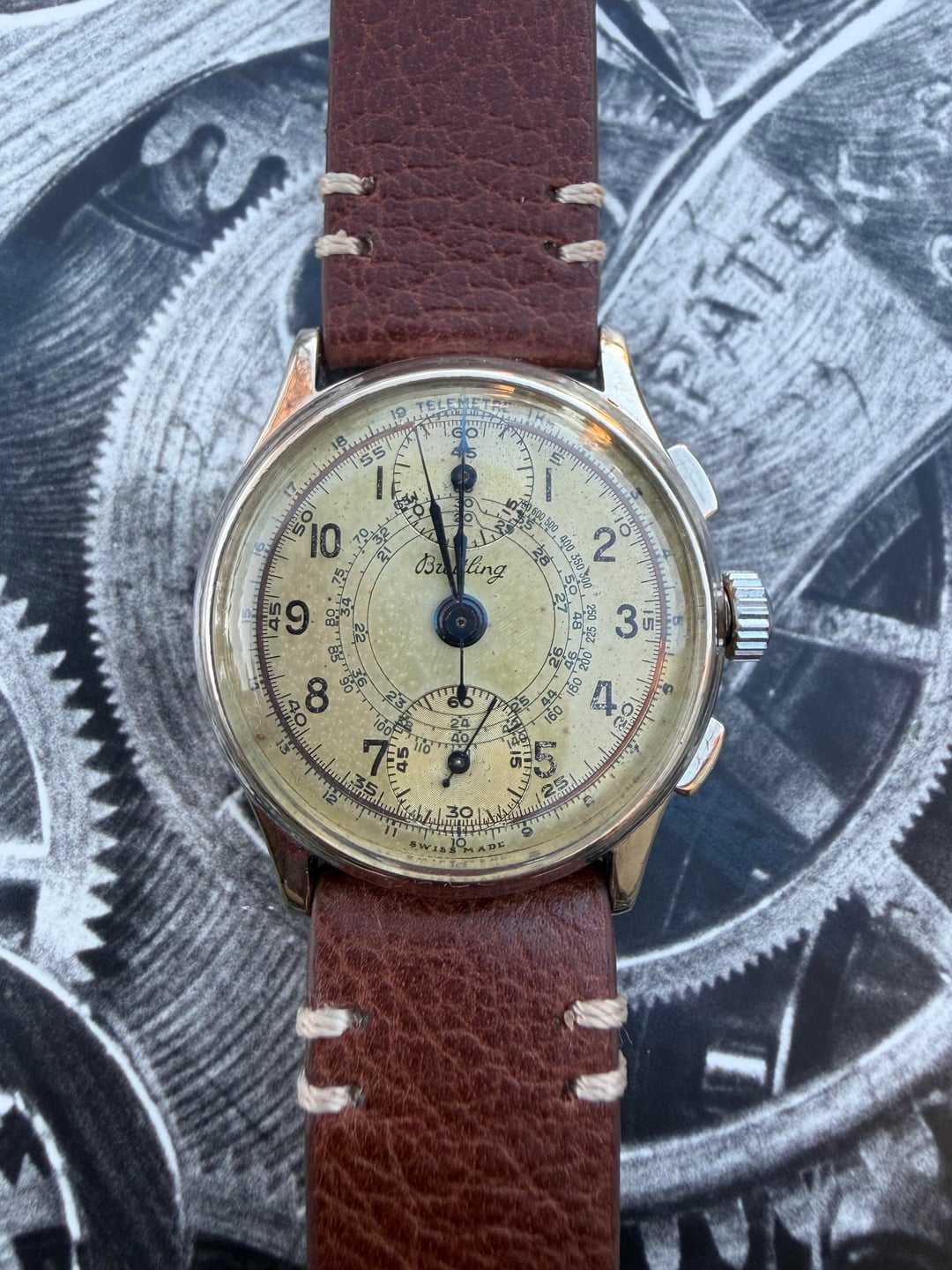 Rare 1940s Breitling Chronograph (Ref. 178) featuring the original Venus 170 column-wheel movement and untouched dial. Watch is in good condition overall. The stainless steel case shows almost no wear and no damage. The dial is all original with visible patina, and striking blue steel hands. The Venus 170 movement runs perfectly and the chronograph starts, stops, and resets as intended. Just back from service. Strap is nice brown leather. Refer to close-up photos for detailed condition. Case Measurements: • Case without crown: 33mm • Case with crown: 35mm • Lug to lug: 37mm • Lug width: 18mm Wears slightly larger due to long lugs and pump pushers — classic vintage proportions. Price: $1,400 via Paypal, Venmo, Cashapp, Applepay Shipping: Free FedEx Ground or UPS Ground. Expedited shipping available upon request. Sorry no international shipping. Watch is located in California and only shipping within USA. Timestamp: Included in the album — additional wrist shots or verification photos and videos available upon request. Album and Timestamp: https://imgur.com/a/me8A0y5