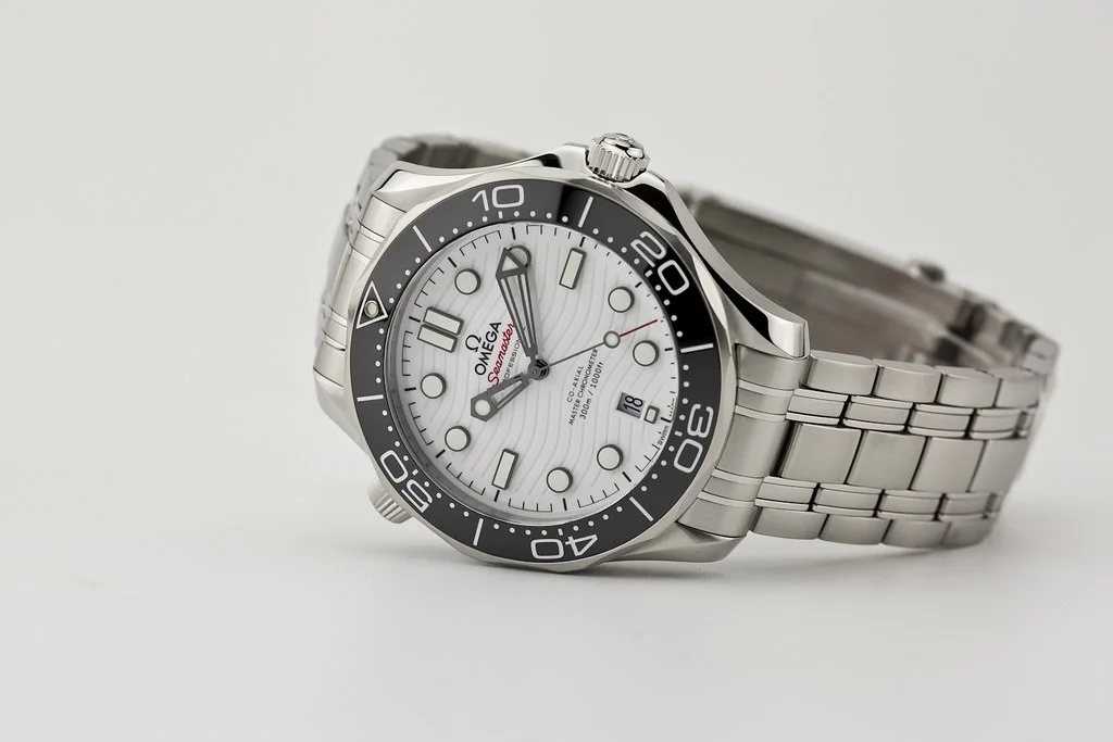 Up for sale is a brand new Omega Seamaster 300 42mm 8800, White Dial / Black Bezel on Bracelet, reference # 210.30.42.20.04.001 It comes complete with all boxes, papers, booklet, hang tag and Omega Warranty Card dated November 2025.