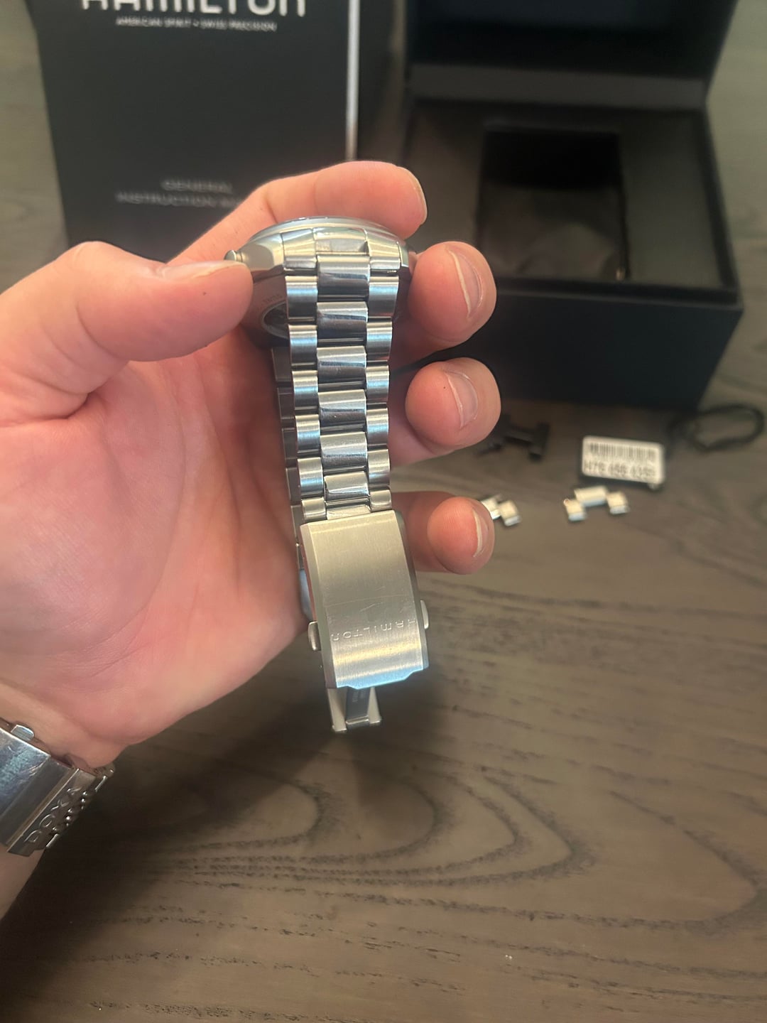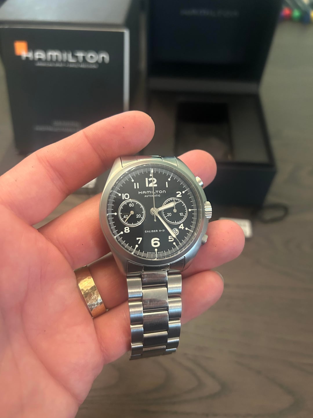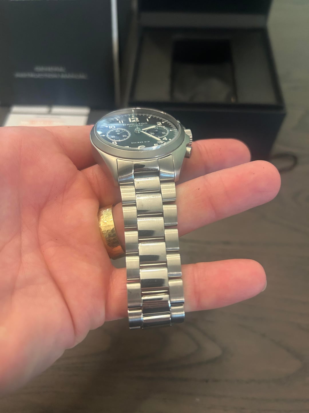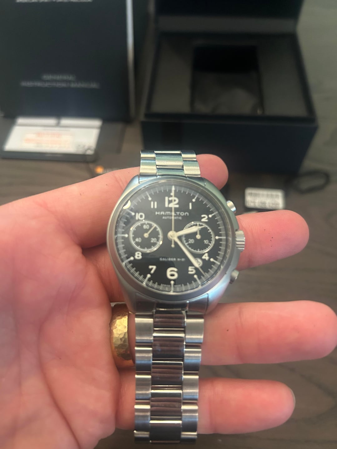 Hello all, Sorry for the struggles with imgur earlier. I'm not entirely sure what's going on there, but it looks like we're in the clear now. I deleted the other posts, so here's a re-upload with the pictures on the post itself. Anyways: I'm selling my Hamilton Khaki Pilot Pioneer chronograph - ref. no. H76 456 435. Picked up this watch in a trade on here a couple years ago, and I've moved away from chronographs. More of a Doxa Sub300T kind of guy now. The watch and bracelet are free of any major scratches, scuffs, or dings, and the watch functions flawlessly. Accurate timekeeping, and the flyback is nice and snappy on the chrono seconds hand. The bracelet is a tiny bit snug on my ~7.5" wrist, and comes with 2 extra links, but only one has the pin and collar. I'm sure any jewelry or watch store would carry appropriate replacements. Asking $875 OBO shipped to any of the 50 states. International shipping is available, but it would cost extra. Please PM me if you have any more questions/need any more pictures. Thanks for looking!