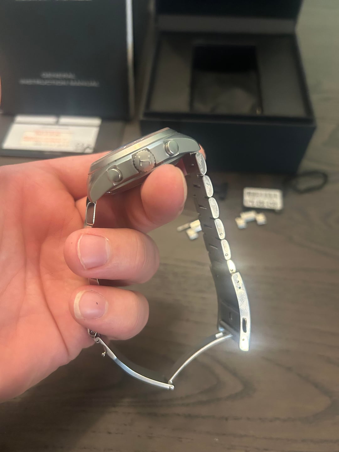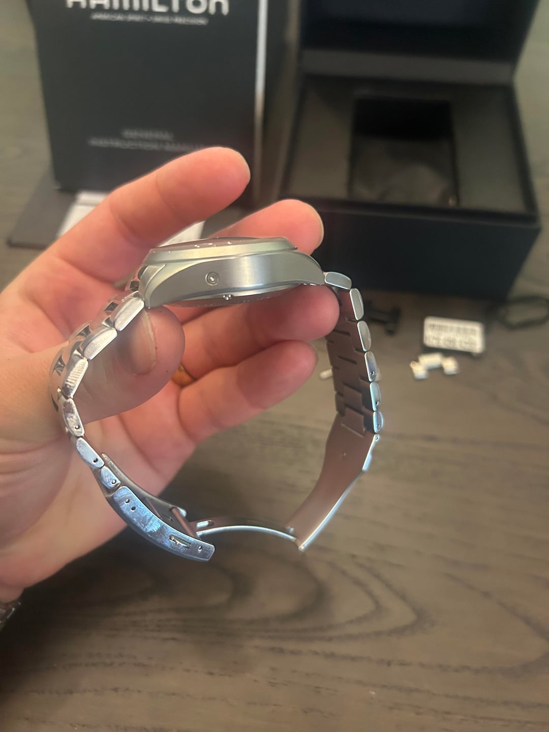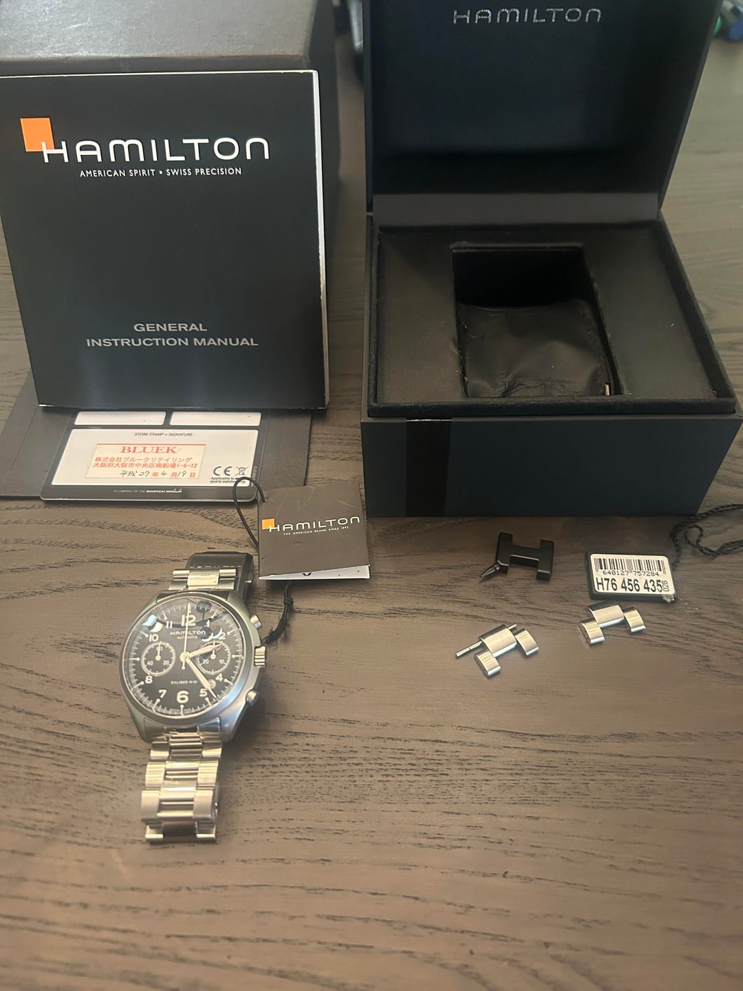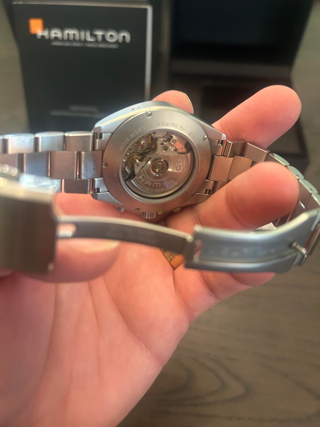 Hello all, Sorry for the struggles with imgur earlier. I'm not entirely sure what's going on there, but it looks like we're in the clear now. I deleted the other posts, so here's a re-upload with the pictures on the post itself. Anyways: I'm selling my Hamilton Khaki Pilot Pioneer chronograph - ref. no. H76 456 435. Picked up this watch in a trade on here a couple years ago, and I've moved away from chronographs. More of a Doxa Sub300T kind of guy now. The watch and bracelet are free of any major scratches, scuffs, or dings, and the watch functions flawlessly. Accurate timekeeping, and the flyback is nice and snappy on the chrono seconds hand. The bracelet is a tiny bit snug on my ~7.5" wrist, and comes with 2 extra links, but only one has the pin and collar. I'm sure any jewelry or watch store would carry appropriate replacements. Asking $875 OBO shipped to any of the 50 states. International shipping is available, but it would cost extra. Please PM me if you have any more questions/need any more pictures. Thanks for looking!