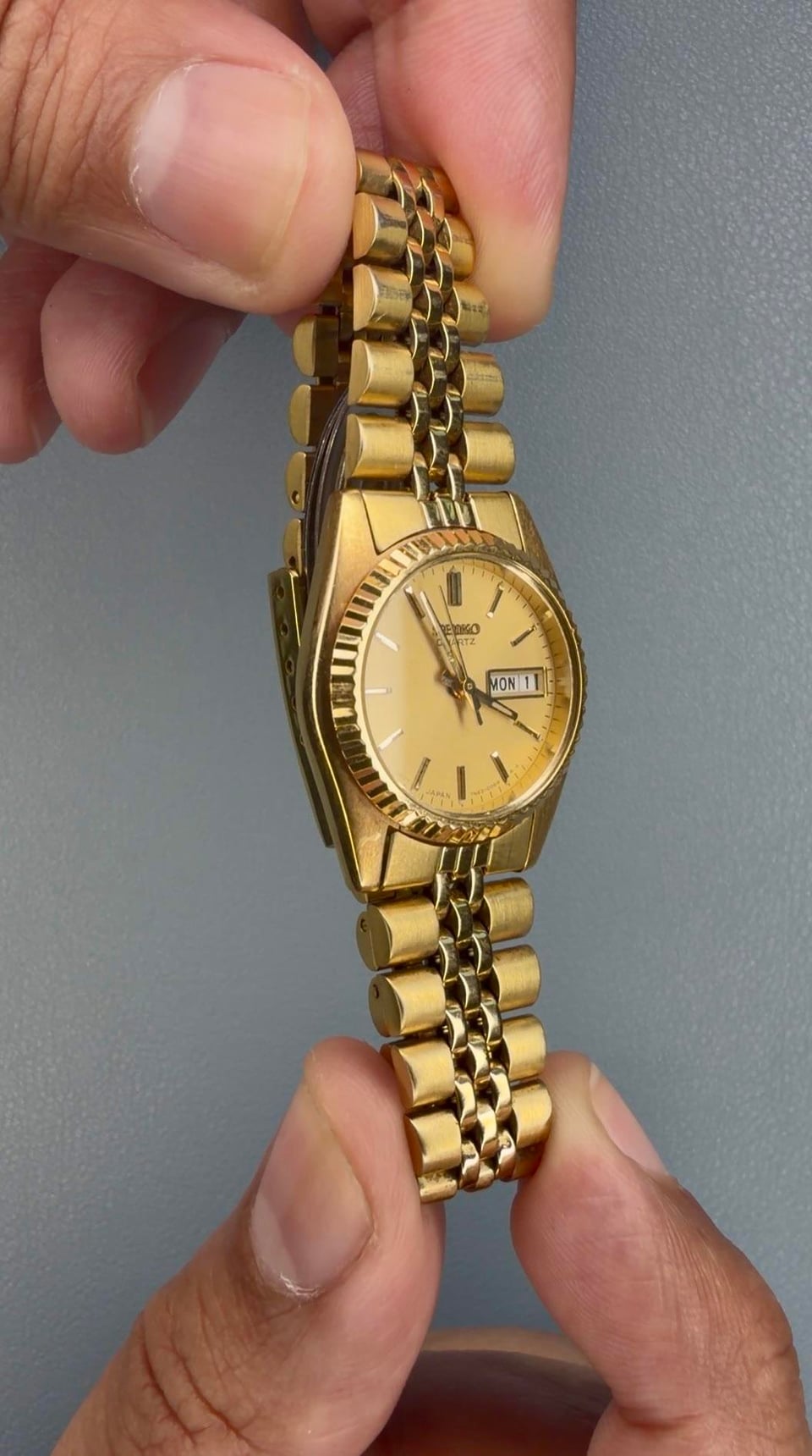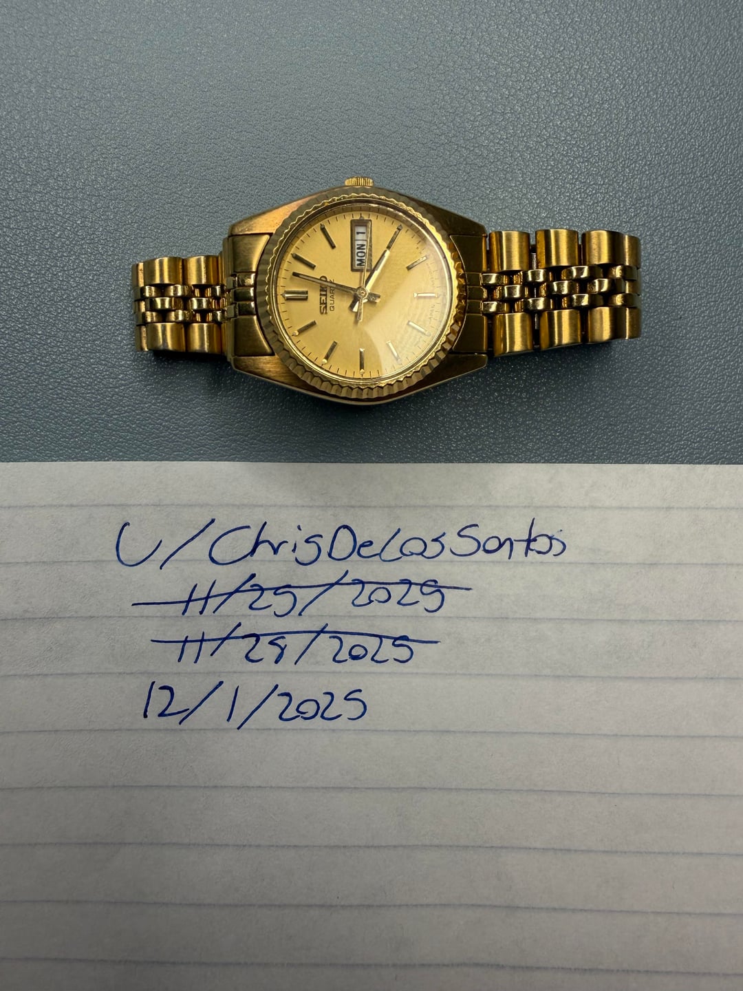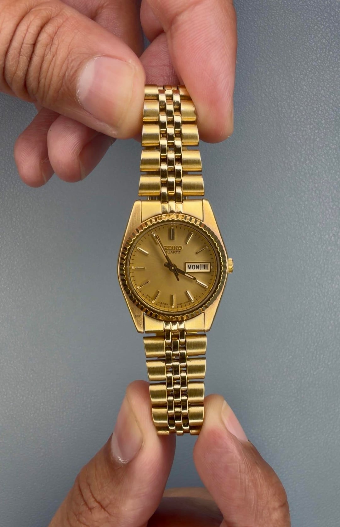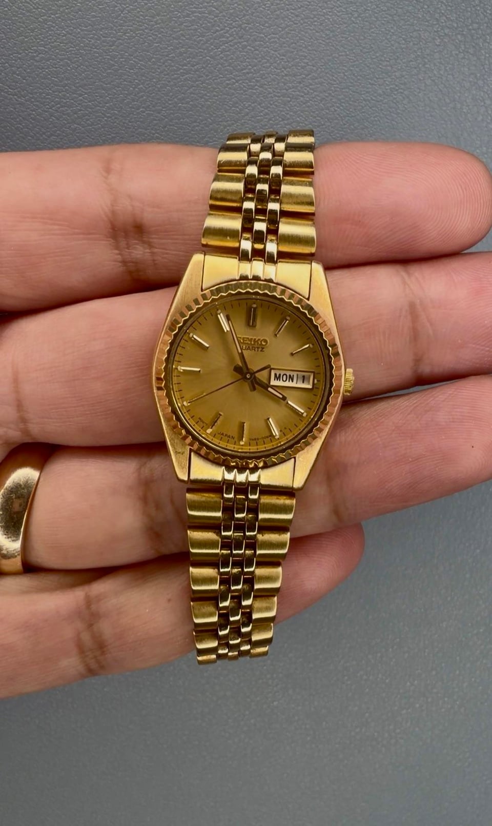 Ladies Seiko 7N83 in Gold -Details: A beautiful gold watch with a day and date function in good condition! Has light wear on the bracelet, but see for yourself in the photos! A perfect gift for your wife, gf, or any other important woman in your life! A watch that will elevate any lady’s wardrobe! Watch only. -$99 Shipped -I accept Venmo, CashApp, Zelle, and PayPal (+4% if using G&S) -Movement: Quartz -Case size: 23mm -Timestamp: https://imgur.com/a/HGE1YYp -Location: Downtown Los Angeles -IG: ColeccionDeLosSantos -TikTok: Chris.DeLosSantos