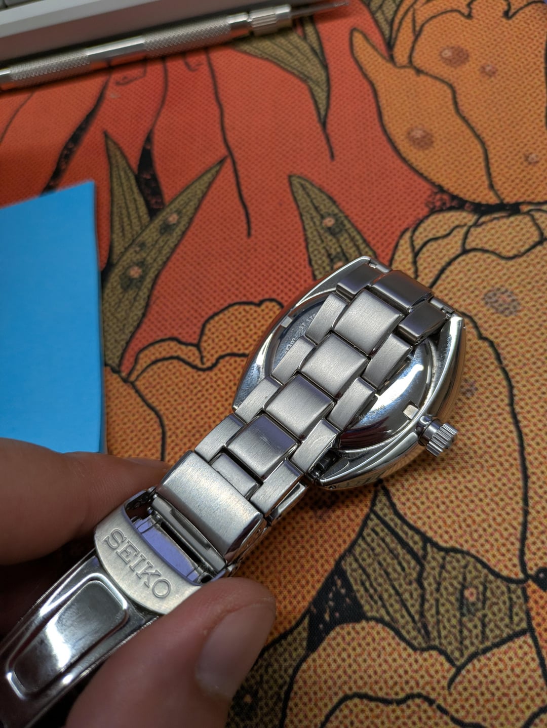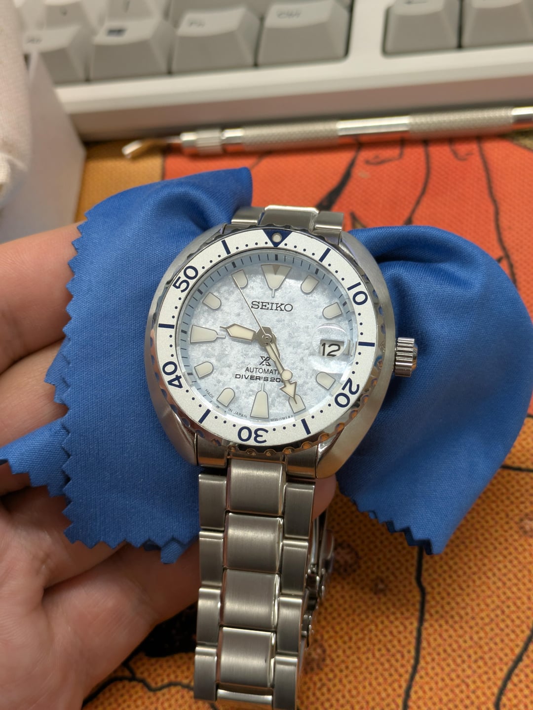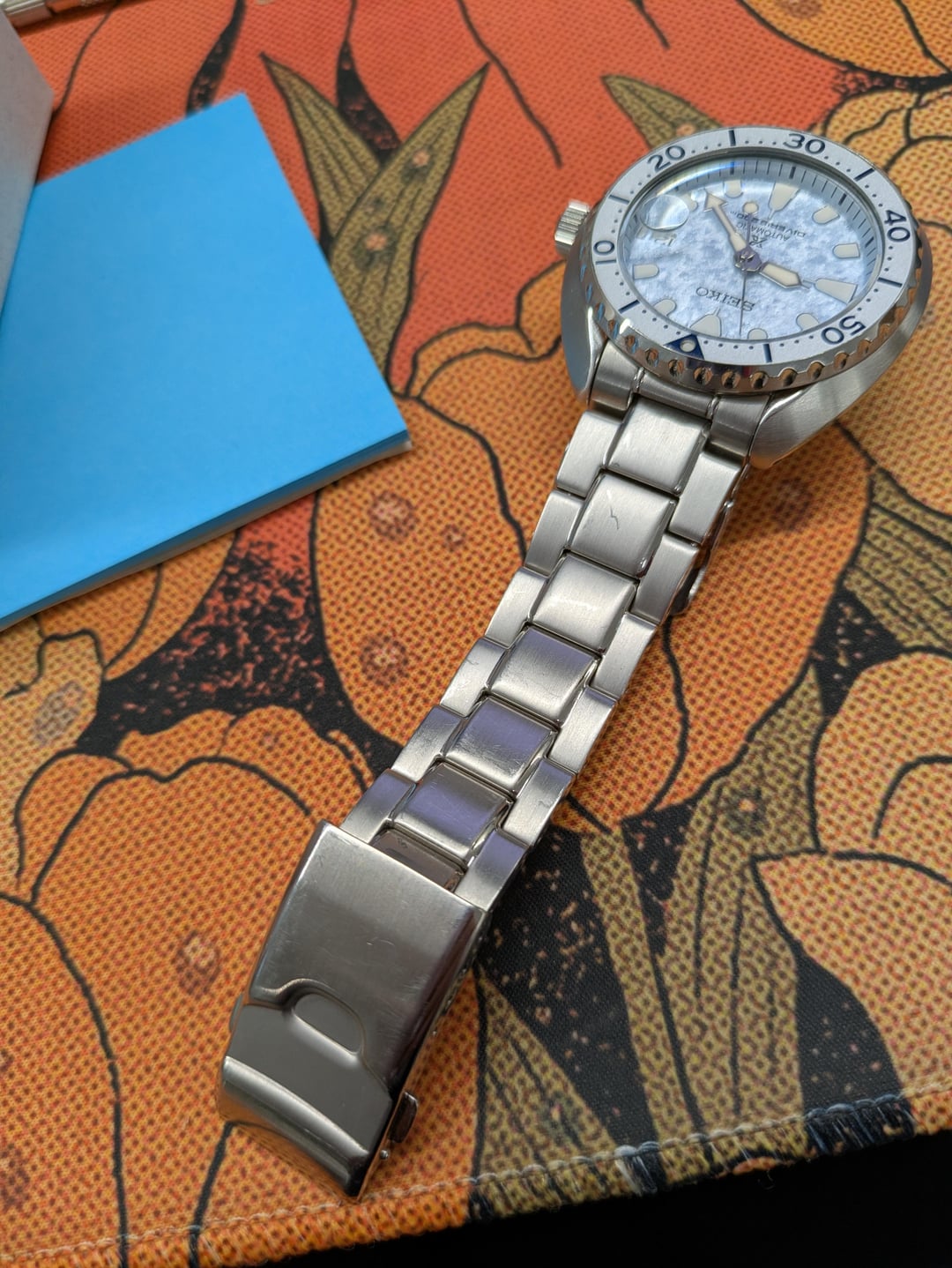 Seiko SBDY109 Mini Turtle, JDM. "Ice frost" dial. 42.3mm case width (excluding crown) x 43 lug to lug x 13mm height. 20mm lug width. Hardlex crystal with date cyclops Movement: 4R35, keeps time within Seiko's specs, my experience is < -/+ 10s Watchhead is in good condition, small hairlines on the left-side. Crown-side has a little discoloration on the crown. Bracelet has the usual desk-diving scratches. Bezel alignment is perfect. All damage can be seen in pictures, but feel free to request any closeups or a WhatsApp video call if you'd like more detail. Comes with full kit\*: box, hangtag, pillow, Japan-only guarantee booklet and extra links (3). \*The only thing that's missing is one pin collar. Bracelet currently sized for 7.5in wrist, clasp has 3 microadjustments available, and three links are included (again, one pin needs a collar). Looking for $330 OBO shipped via USPS, can take Zelle, PayPal, Venmo. CONUS only, apologies out of continent friends.