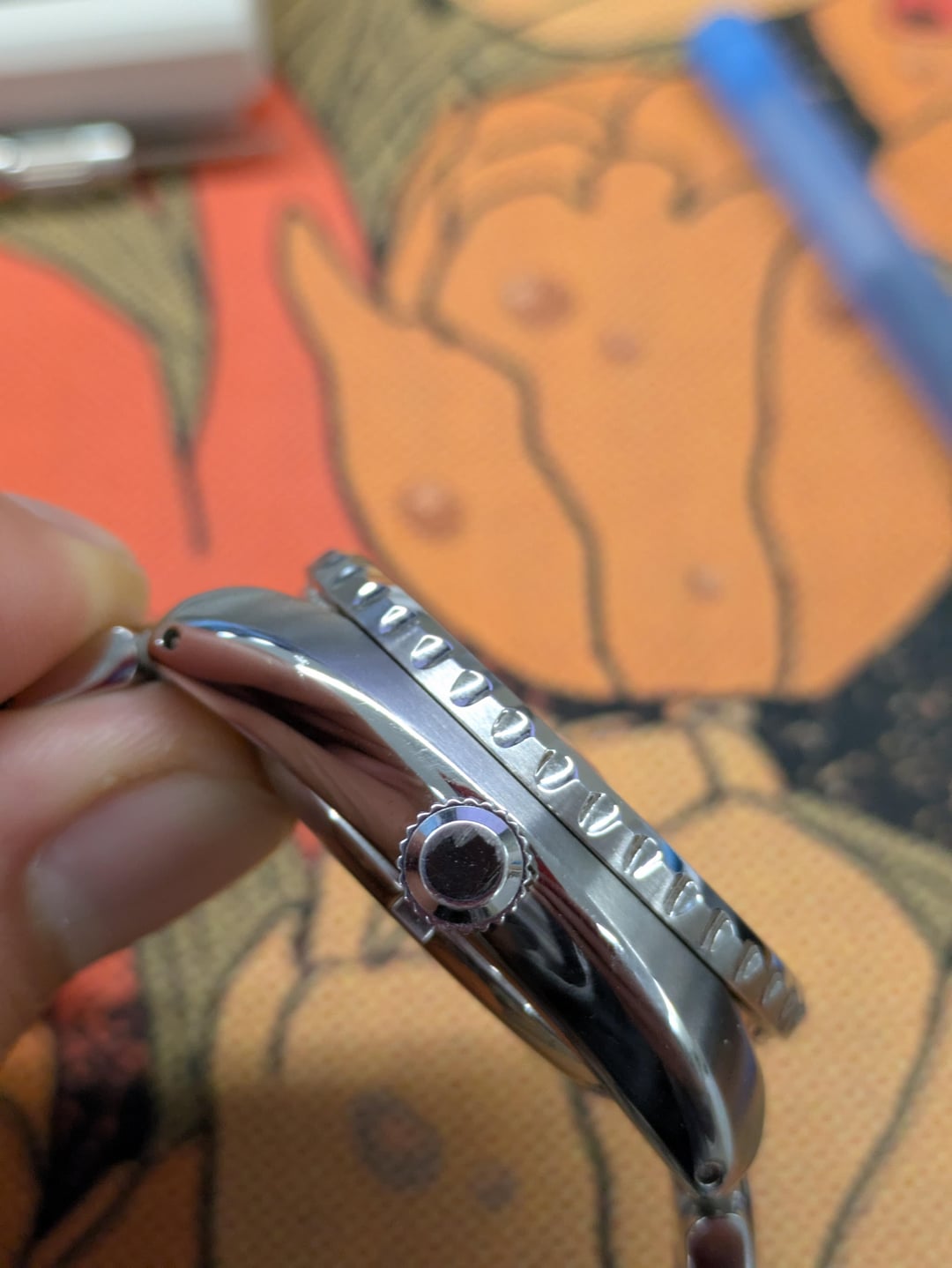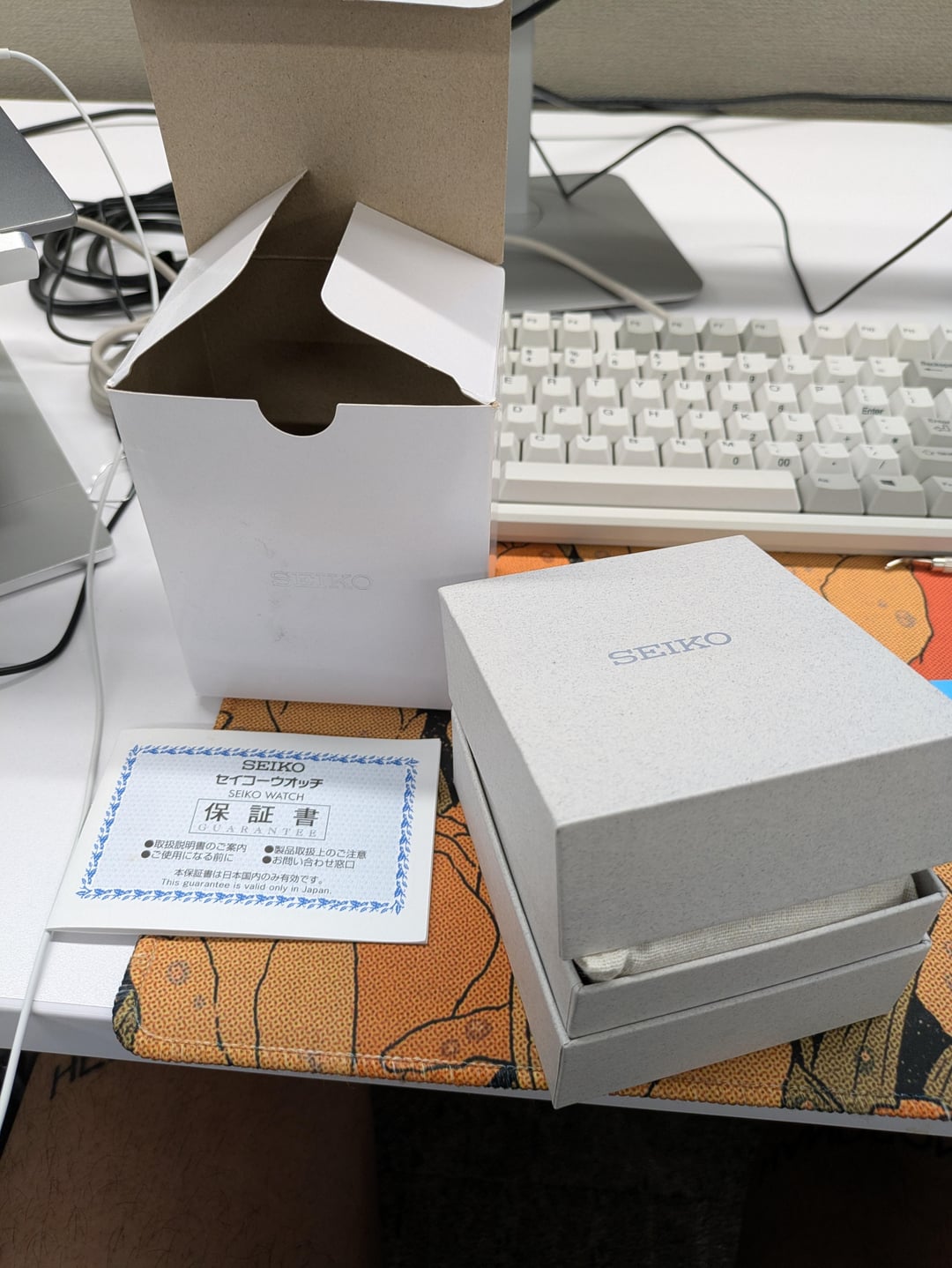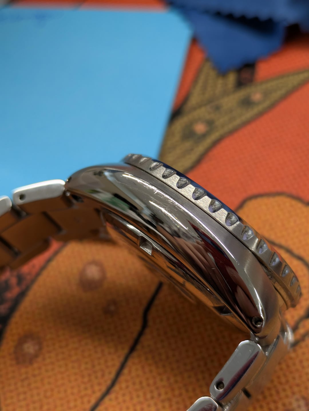 Seiko SBDY109 Mini Turtle, JDM. "Ice frost" dial. 42.3mm case width (excluding crown) x 43 lug to lug x 13mm height. 20mm lug width. Hardlex crystal with date cyclops Movement: 4R35, keeps time within Seiko's specs, my experience is < -/+ 10s Watchhead is in good condition, small hairlines on the left-side. Crown-side has a little discoloration on the crown. Bracelet has the usual desk-diving scratches. Bezel alignment is perfect. All damage can be seen in pictures, but feel free to request any closeups or a WhatsApp video call if you'd like more detail. Comes with full kit\*: box, hangtag, pillow, Japan-only guarantee booklet and extra links (3). \*The only thing that's missing is one pin collar. Bracelet currently sized for 7.5in wrist, clasp has 3 microadjustments available, and three links are included (again, one pin needs a collar). Looking for $330 OBO shipped via USPS, can take Zelle, PayPal, Venmo. CONUS only, apologies out of continent friends.