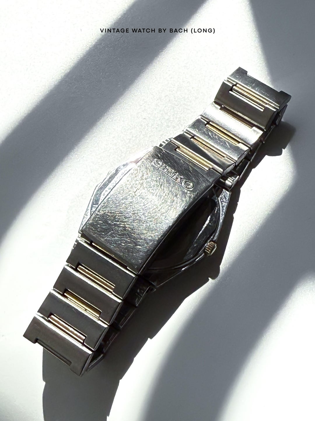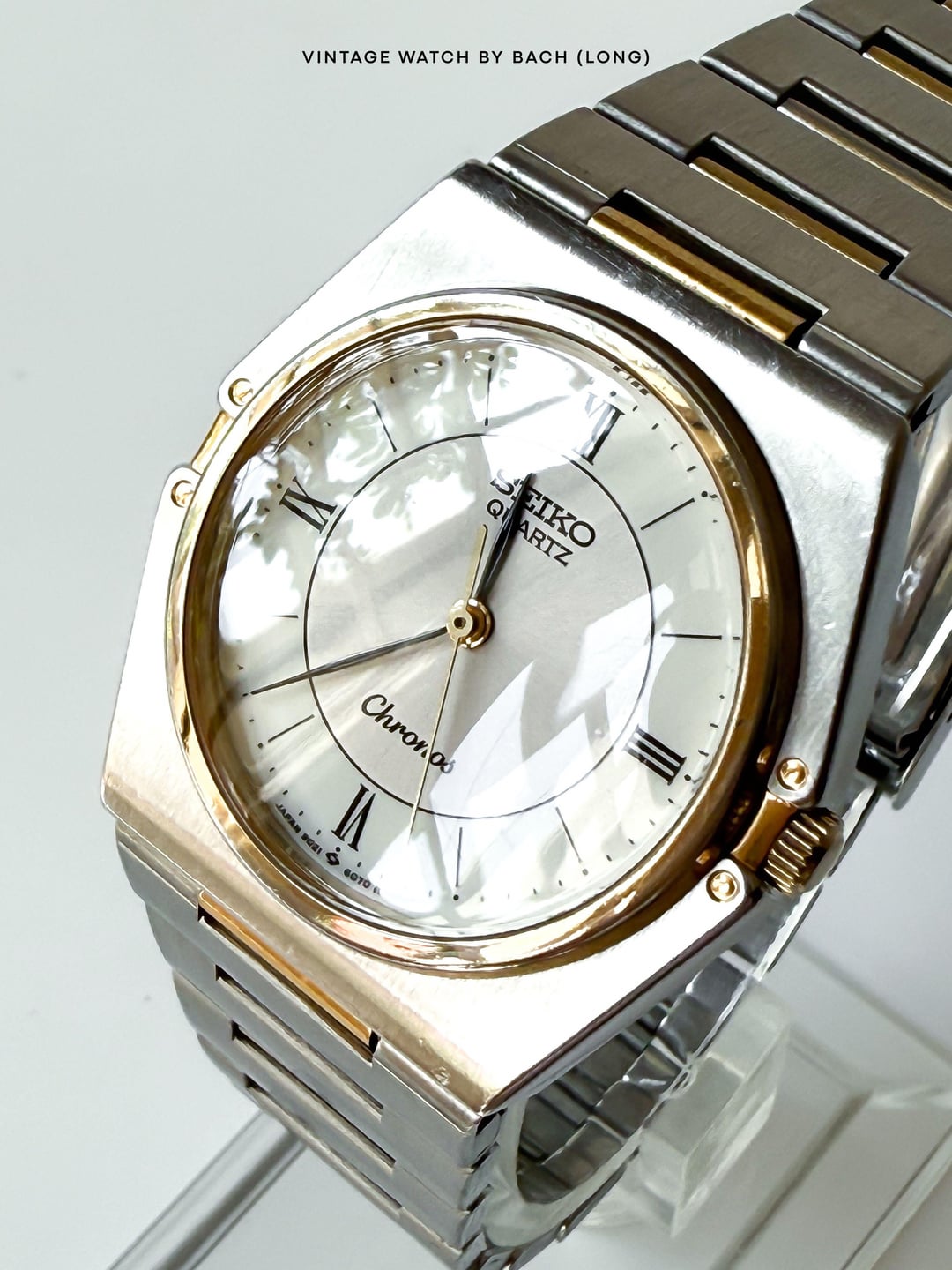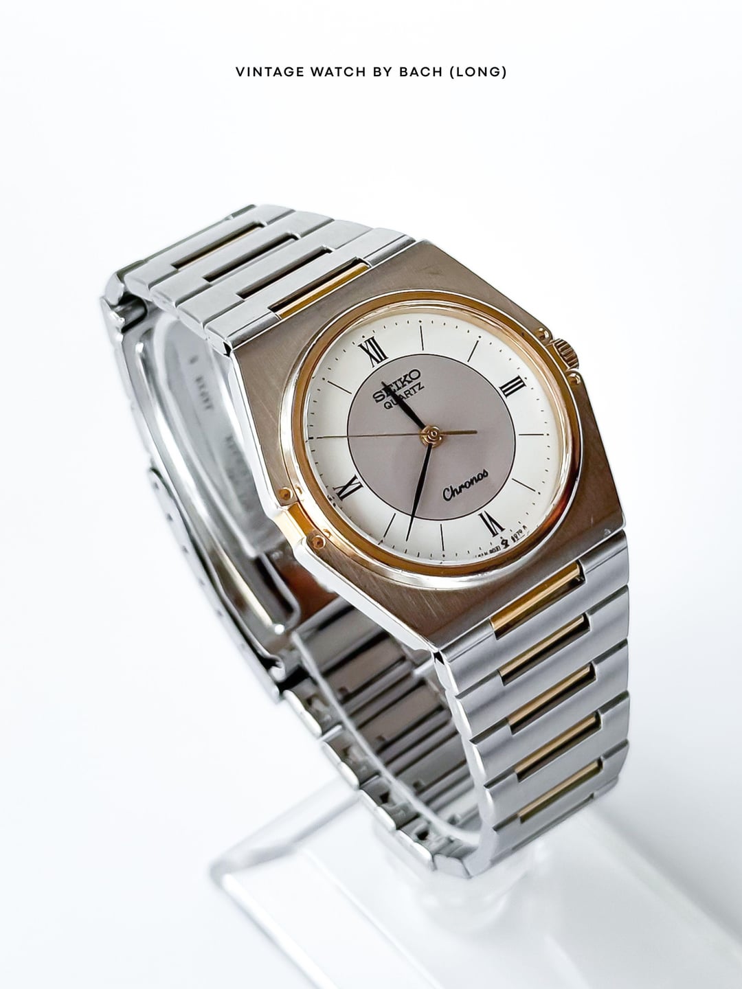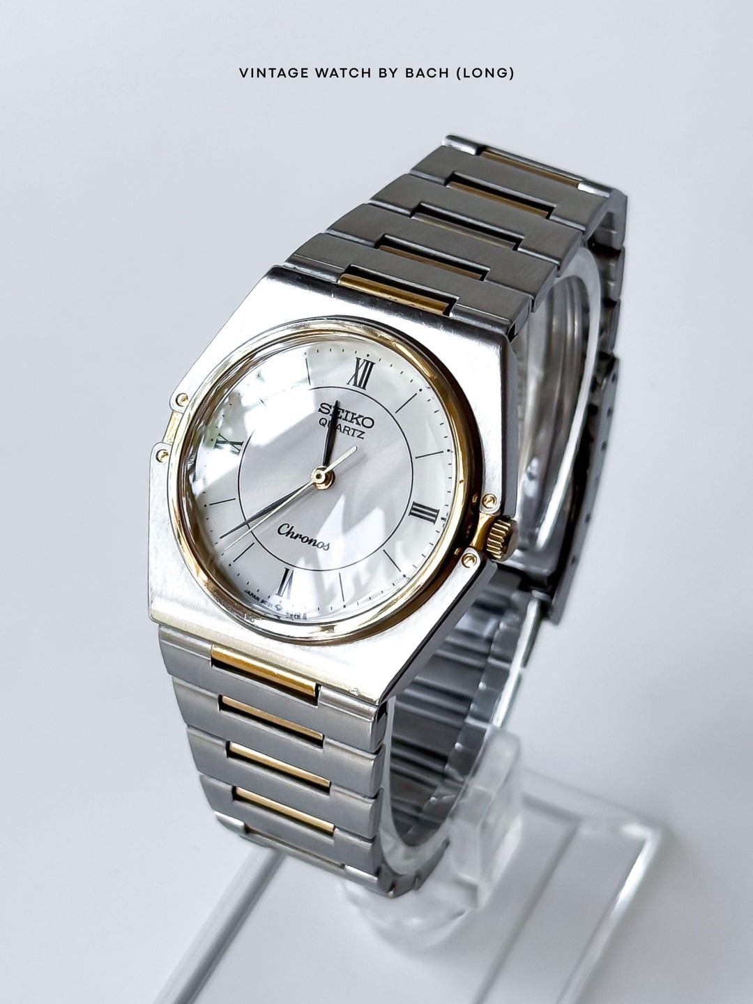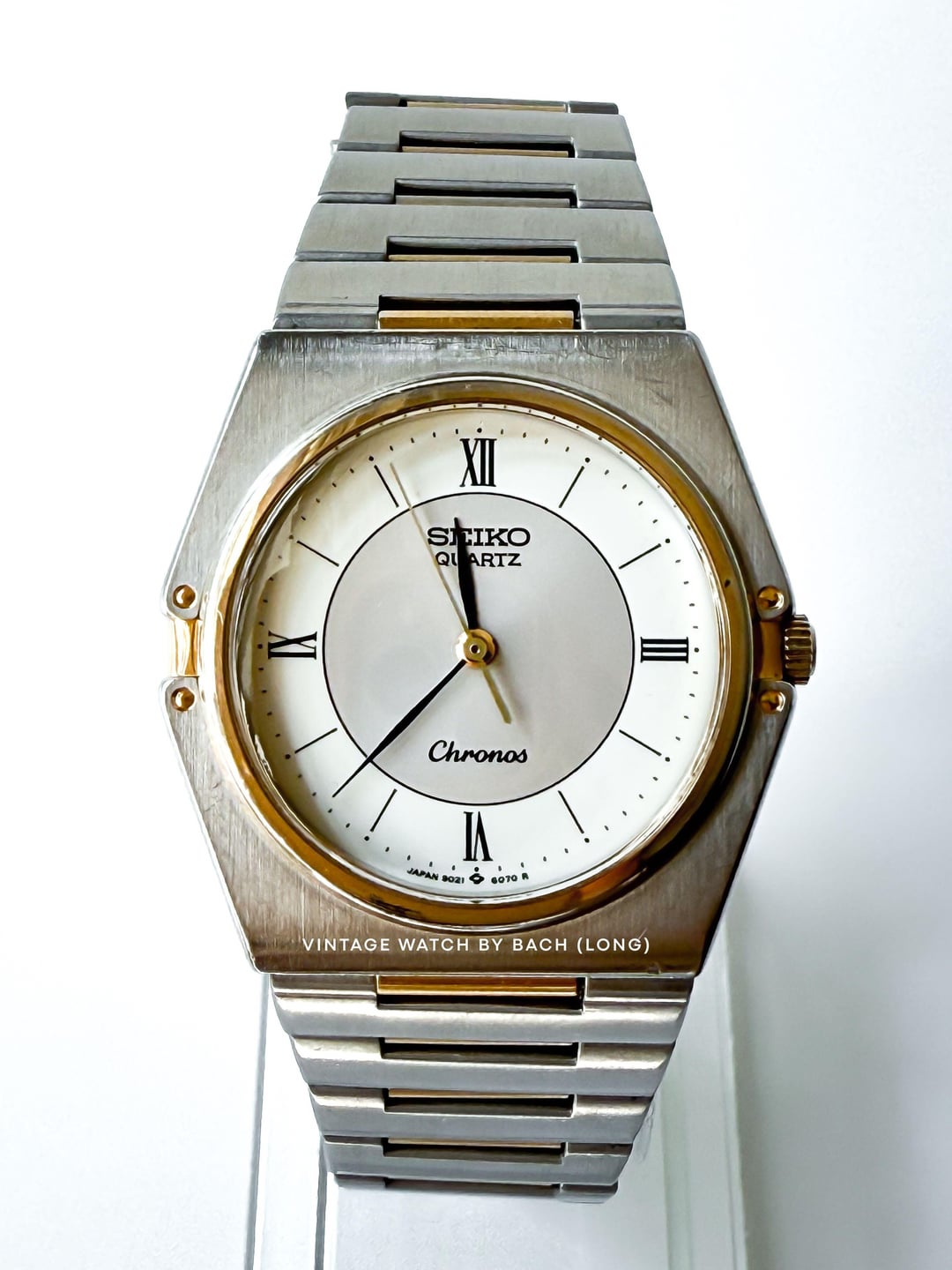 Seiko Chronos 9021-6060 Two-Toned Hexagon Watch SPECIFICATIONS: \- Japanese Seiko Chronos with good condition from April 1985. \- Original Seiko integrated stainless steel bracelet. Fit wrist size up to 18.5cm. \- Stainless steel case size 31mm (without crown), Lug to Lug: 32mm, Lug Width: 20mm, Thickness: 7 mm. Suitable with all wrist size. \- Beautiful clean white dial, minute and hour hand designed as elegant black leaf. Minimal and clean design. \- Curved crystal add more interesting and eye-catching effect to the watch. CONDITION: The watch is very well preserved for its age (See Photos). No obvious signs of wear. Just some inevitable hairline scratches and tiny dent on the case. The original movement works well. Serviced and replaced with new battery. It’s recommended to only setting the date in 6-7 o’clock (safe time), should not change it in 9PM-4AM or that might damage the movement. Recommend to avoid getting wet for vintage watch. The watch has been tested for more than 1 month and operate stably before selling. SHIPPING AND PAYMENT: \- Worldwide shipping via UPS (cost me 60-80 USD) with tracking number. 6-8 business days. \- Price 230 USD (free shipping). \- Import duties, taxes and charges are not included in the item price. These charges are the buyer’s responsibility. Please check this prior to buying. These charges are normally collected by shipping company (UPS). For more beautiful watches, visit: Etsy: [https://vintagewatchbybach.etsy.com](https://vintagewatchbybach.etsy.com) Ebay: [https://www.ebay.com/usr/vintagewatch\_bybach](https://www.ebay.com/usr/vintagewatch_bybach) Grailed: [https://www.grailed.com/VintageWatch\_ByBach](https://www.grailed.com/VintageWatch_ByBach) Instagram: [https://www.instagram.com/vintagewatch\_bybach](https://www.instagram.com/vintagewatch_bybach)