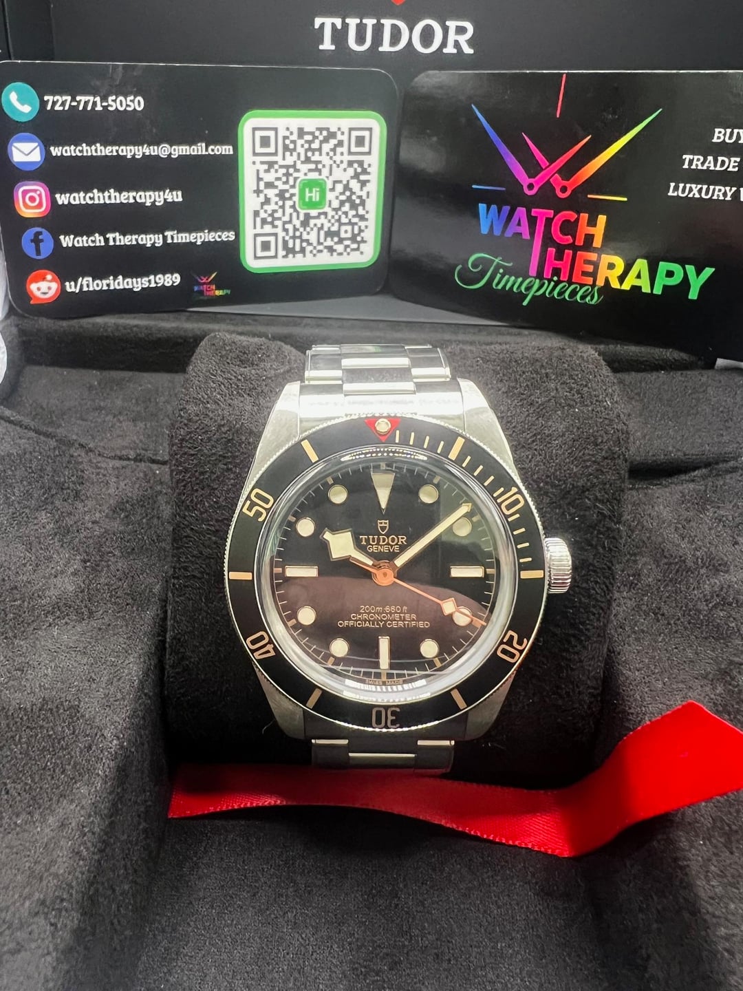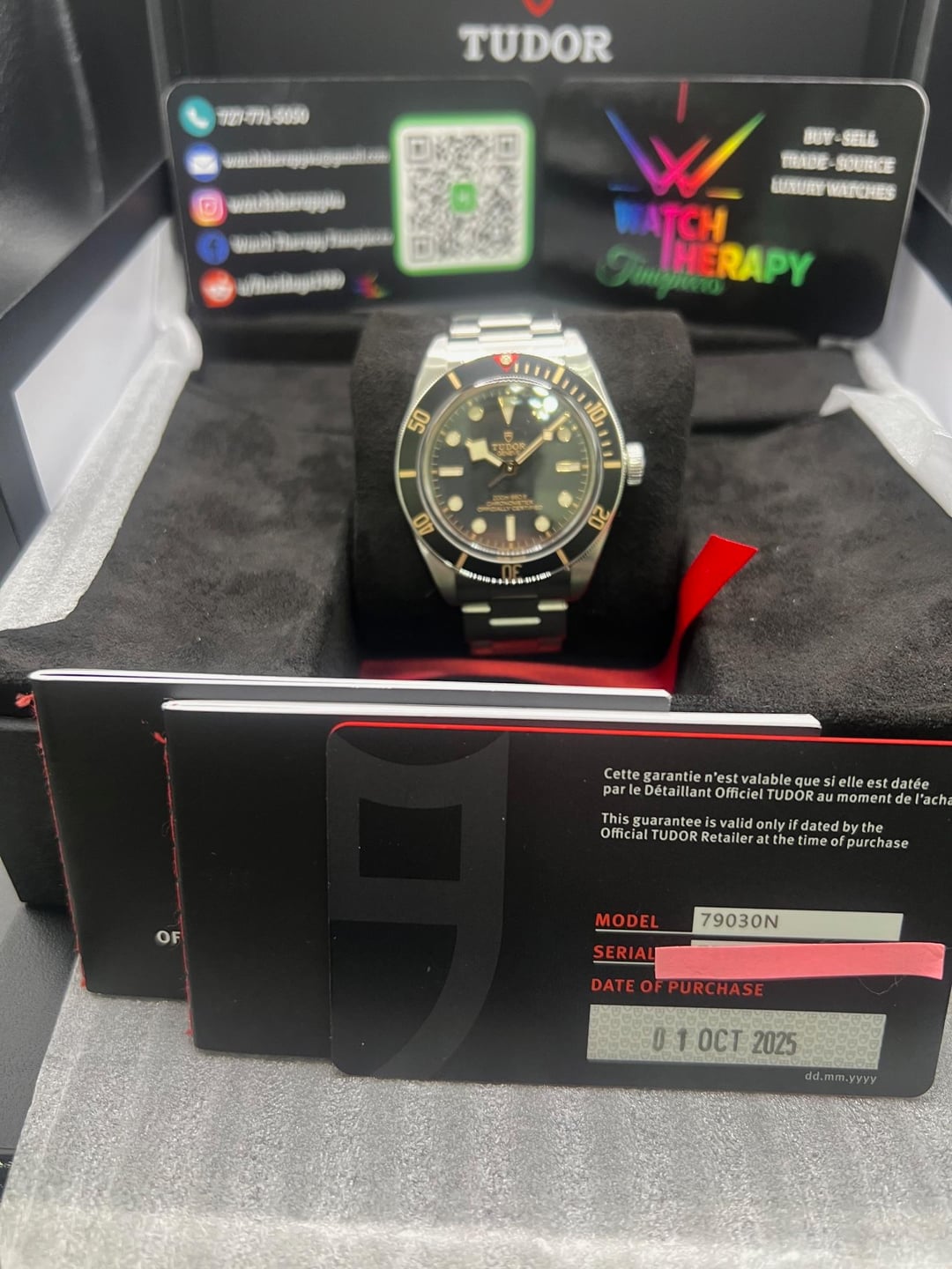 **F/S: New Tudor Black Bay 58 Black 10/25 Ref# 79030N** **Shipping from Florida!** **Specs:** \* Beautiful black domed dial \* Automatic self-winding \* 39mm \* SS Riveted Bracelet \* 200M Water Resistance \* 70-hour power reserve \* MT5602 (COSC) movement **Includes**:  Warranty card 10/25, double boxed, booklets and full links. **Condition:**  10/10 Unworn **Price:  $3400.00 + Insured shipping to your local FedEx for pick-up in Con US**. I am also open to a face-to-face public transaction in or around the Tampa Florida Region, within reason. I have many strong and viable references within Reddit and from Buy/Sell/Trade Watch Facebook groups. Always willing to jump on a call or meeting link to show you the watch. Thank you and please reach out if you have any questions or concerns.  Florida residents may be subject to sales tax w/o a valid reseller cert. ***No Trades, TY*** **Location**: Tampa Florida **Payment:**  Zelle or Wire Timestamp:   [https://imgur.com/a/3ug27HY](https://imgur.com/a/3ug27HY) FB: Watch Therapy Timepieces IG: [@watchtherapy4u](https://www.reddit.com/u/watchtherapy4u/)
