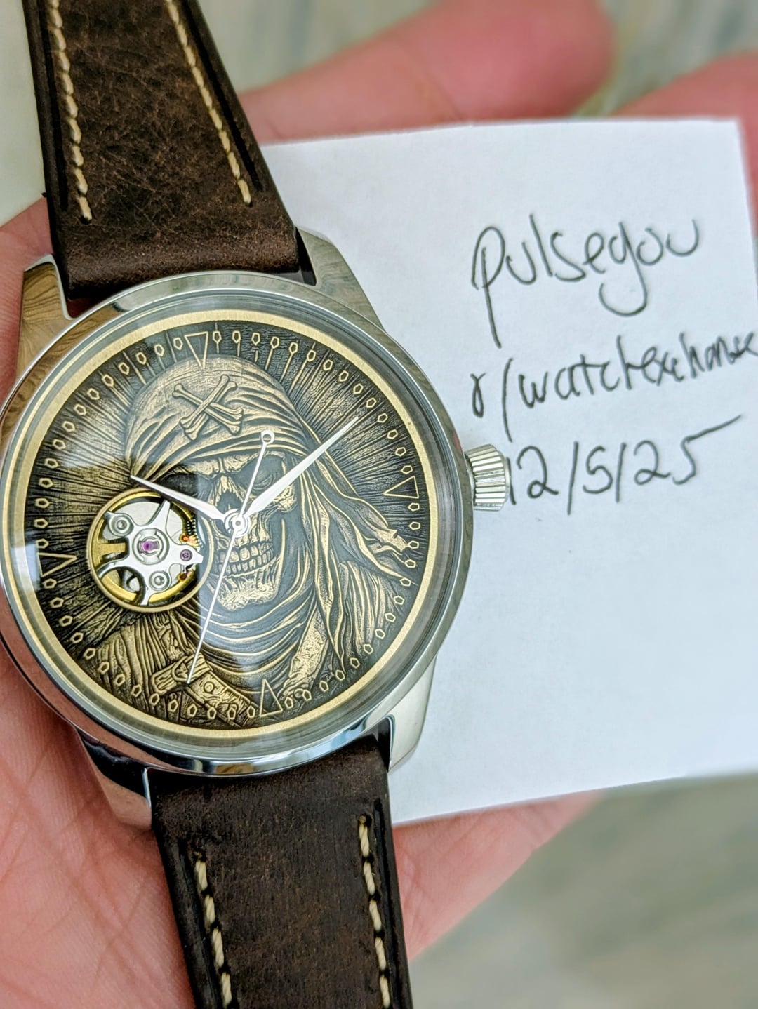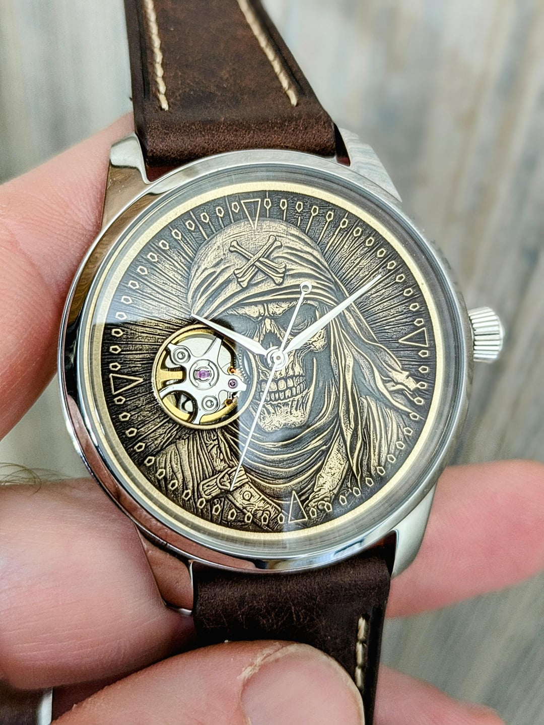 Sunday holidays fam! For sale today we brand new CCW Model, "Deadman's Heart." This dial was designed and made by me on my 50w fiber laser. It has 256 layers to create a 3d effect on the dial, cut out of a 0.5mm sheet of jeweler's bronze, and then hand finished with a Brass Black, polish, and wax. The dial is a beautiful 35mm size and I have housed it in a 39mm dress watch case. Powering the watch is the NH38 automatic movement, an absolute workhorse. The watch features an open caseback with a gold adorned rotor. I have a brown, tan, black, or green leather straps available, and this watch can come in a stainless steel, two tone, or yellow gold case. **I have both the open heart and non open heart versions available.** *All of my watches are completely customizable so if you would like to change anything about the watch please shoot me a message and would be happy to create something custom to fit your needs, or customize this dial further.* **Specs** Case Size: 39mm stainless steel dress case w/ open caseback and 20mm lugs. Dial: Custom designed, lasered, and hand finished 35mm dial featuring the "Deadman's Heart," 256 layers, for a video of this dial being made please see my IG linked below. Movement: NH38 Movement w/ 41+ hour power reserve, hacking, 24 Jewels, Open caseback with adorned rotor. 12.5mm Thickness Comes with a travel watch pouch for safekeeping :\] **Condition** Everything is brand new and ready to be shipped. Watch was custom-built by me to the highest quality. Message me if you have any questions. **Asking** $299 (leather strap) or $330 (milanese bracelet) shipped to CONUS. Will ship to other countries please contact me with location and I'll see what I can do. Payment via Venmo, Zelle, Cashapp, or Paypal+3%.