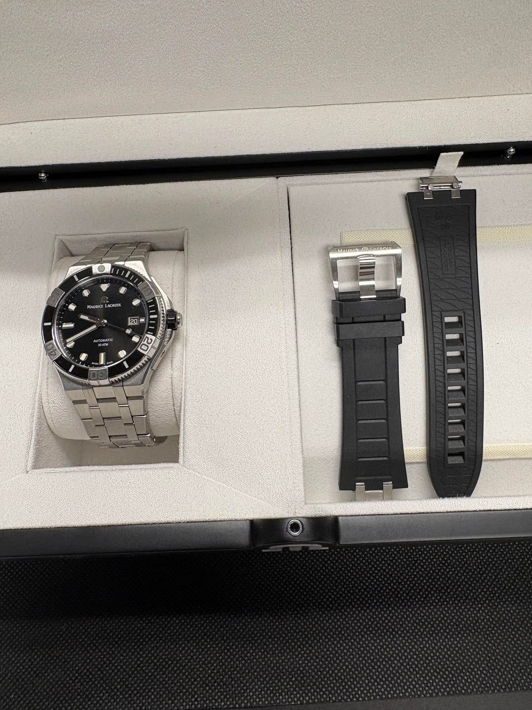 Hi; I am selling my mint Maurice LaCroix Aikon 43mm Dive watch. Inside beats a rebadged Selitta movement. A compact 43mm case. Short lug to lug means most will find it fits great. The integrated bracelet has been unworn and unsized. The watch comes full kit, which includes a ML black rubber strap. Strap change is a breeze thanks to ML's tool less system. Includes warranty as this was bought from an AD No trades please. Best reasonable purchase offer considered. I am also selling some other watches. Just a collector trying to sell a watch and buy another, maybe!
