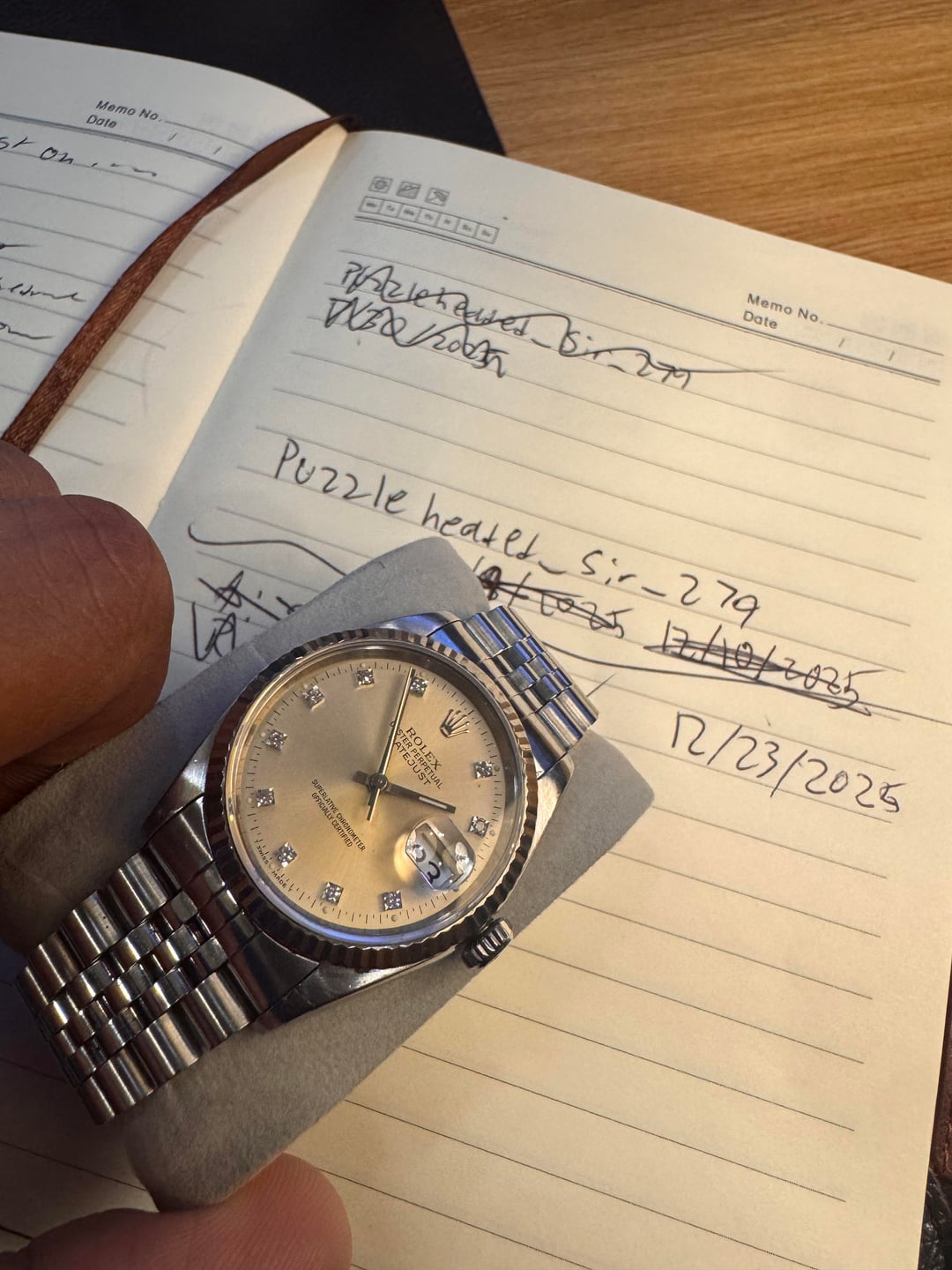 Offering a beautiful Rolex Datejust 16234 (36mm) featuring a factory diamond dial that has developed a stunning natural patina — silver at its base, but transforming in different lighting to reveal warmth, depth, and character. It’s the kind of dial aging collectors truly appreciate: elegant, honest, and impossible to replicate today. Paired with the classic stainless steel case and 18k white gold fluted bezel, this Datejust blends luxury heritage with timeless everyday wearability. Price: $5980 + shipping ⸻ Key Details • Reference: 16234 • Size: 36mm • Dial: Factory diamond dial with beautiful patina • Bezel: 18k white gold fluted • Movement: Automatic • Condition: Excellent vintage condition with honest aging • Wear: handling marks consistent with the age of this watch. Polish is available What’s Included • Rolex Datejust 16234 • Bracelet • Watch only (unless yours has box/papers — I can update) Location & Shipping • Located in Charlotte, NC • Fully insured U.S. shipping available • Local meetups welcome ⸻ About Me (Casetowrist) For over 10 years, I’ve helped collectors secure the right watch with transparency, professionalism, and a smooth buying experience. Authentication at a local watchmaker is always welcome (buyer covers fee). Instagram: @casetowrist Website: Casetowrist.com