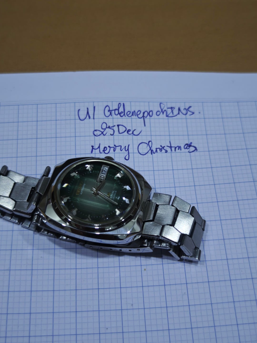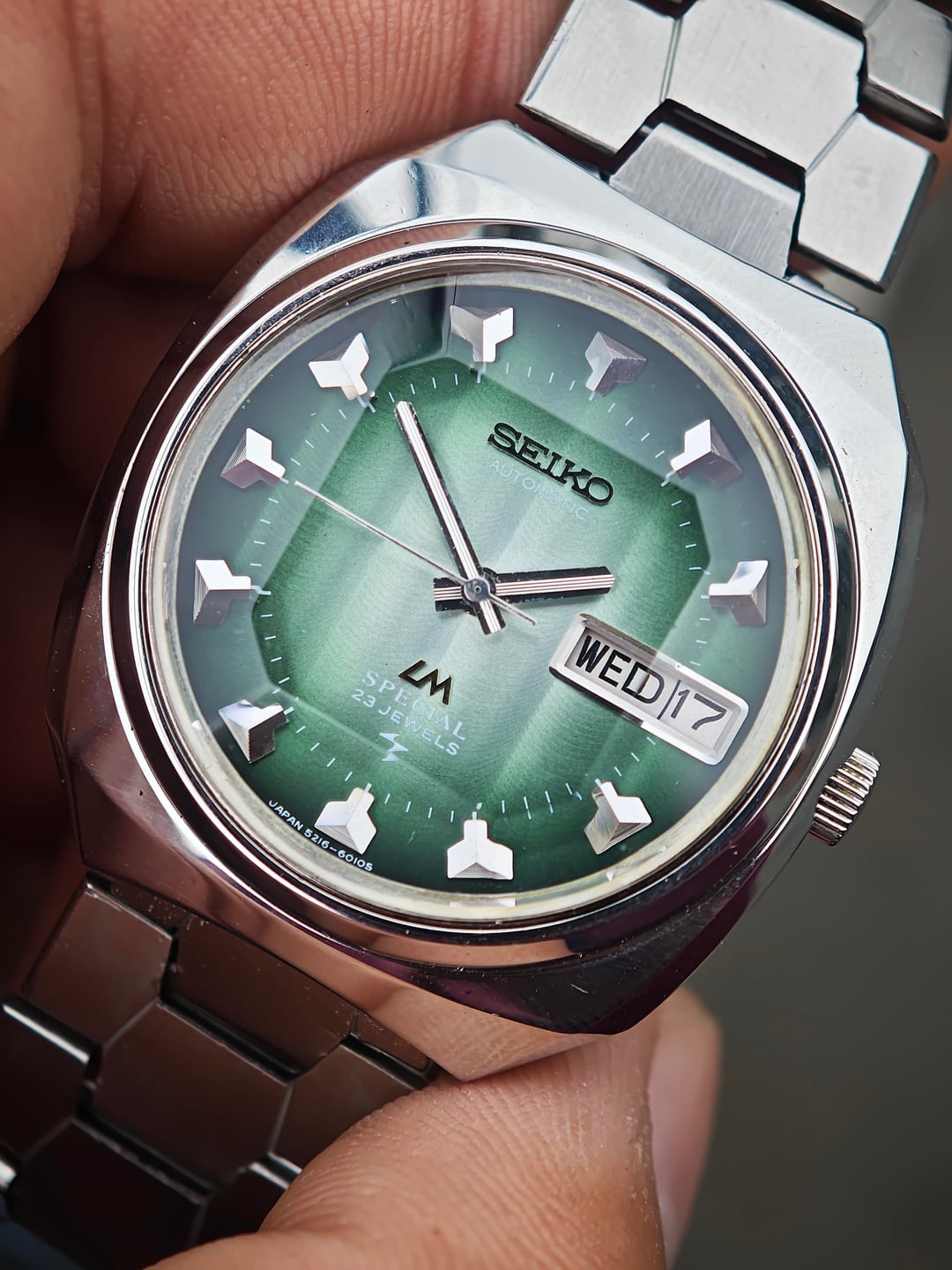 Up for sale Seiko LM Special Green Sharkteeth 5216-6010S Details: • Reference: 5216-6010S • Movement: Seiko 5216A – automatic, hand-wind, hacking • Dial: Original Wave Green dial with sharp faceted markers • Case: Excellent condition with crisp edges • Crystal: Clean overall • Bracelet: Original Green Sharkteeth Bracelet fit 17cm (6.7inch) or with clap extender 19.5cm (7.6inch) • Functions: Freshly Serviced; Running well; day/date quickset works correctly A classic 1970s Seiko design with standout presence and one of the most attractive LM Special dials of the era. Price: $450 shipped (tax/duty included) Payment: PayPal F&F or G&S (+4.6%)