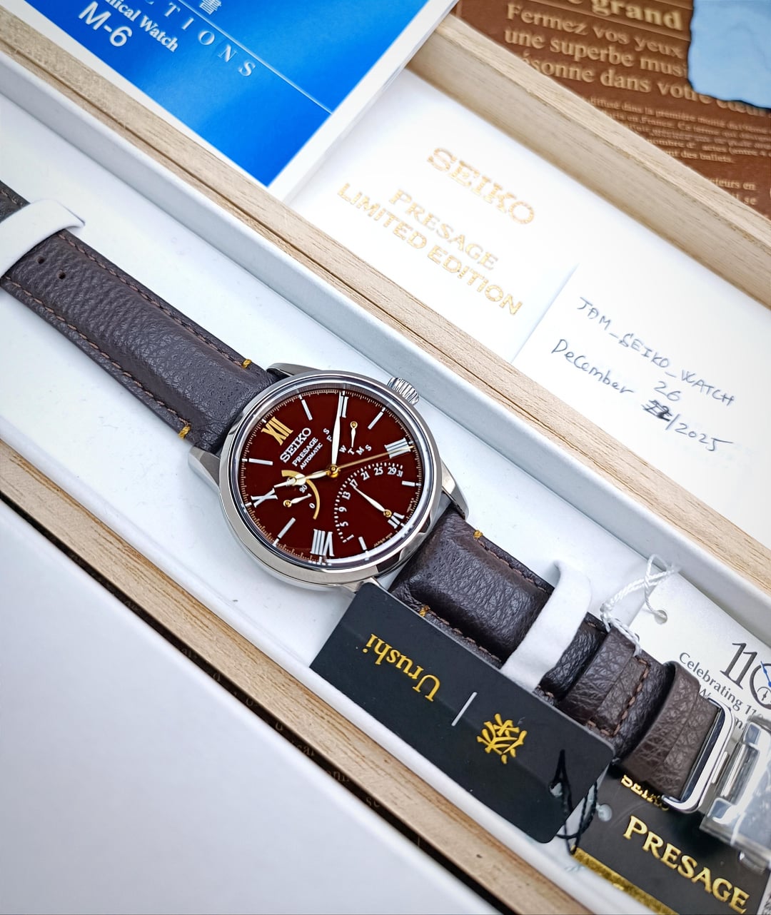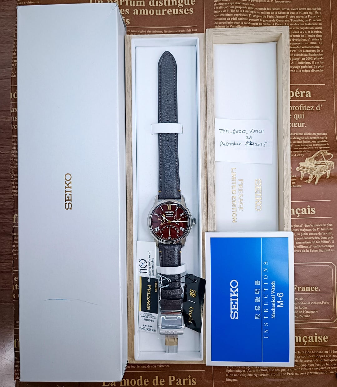 Hello, ra/WatchExchange, For sale is a Seiko Presage 110th Anniversary Limited Edition – SARD019, part of the Craftsmanship Series featuring a beautifully executed Urushi lacquer dial. Condition: Like-new, full kit, worn only 1–2 times, in excellent condition. Comes complete with box, booklet, and tag. Specifications Reference: SARD019 Movement: Automatic Seiko 6R24 Accuracy: approx. +10 / -10 seconds per day Power Reserve: ~45 hours Case Material: Stainless steel with DiaShield coating. Size: 40.2mm diameter × 48.0mm lug-to-lug × 12.8mm thickness. Crystal: Dual-curved sapphire with inner AR coating. Strap: Genuine Seiko calf leather Water Resistance: 10 bar / 100m Magnetic Resistance: Yes Caseback: Exhibition style with LIMITED EDITION engraving + individual serial number. Full Kit: Box, booklet, watch tag. 📸 Album / ⏱ Timestamps: Included in the post! Feel free to PM me if you're interested or have any questions! Price, Payment & Shipping Price: $1399 (shipping not included) — No trades. Payment: WISE, PayPal F&F or G&S (+4.6% fee). Shipping: FedEx Express worldwide 2–4 days —($60–$80+). Thanks for looking!