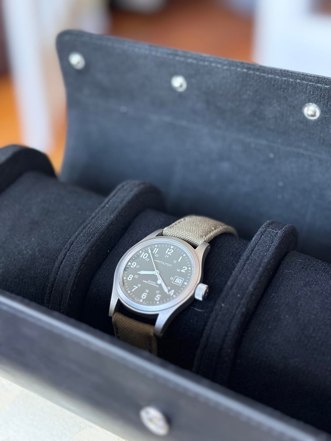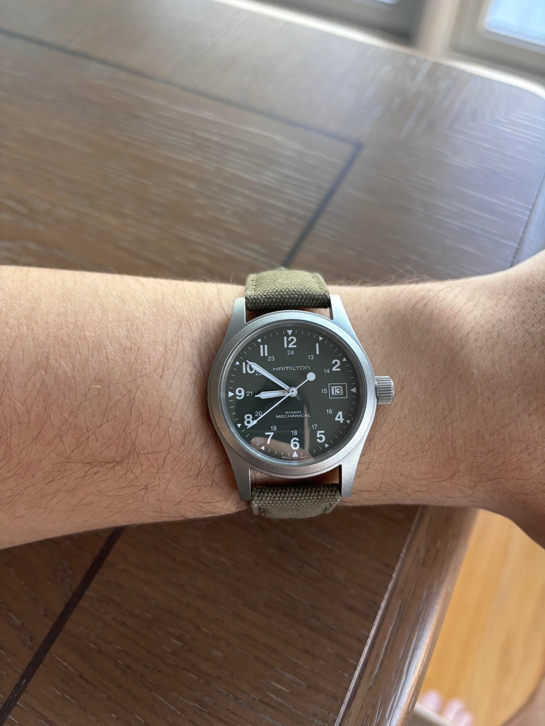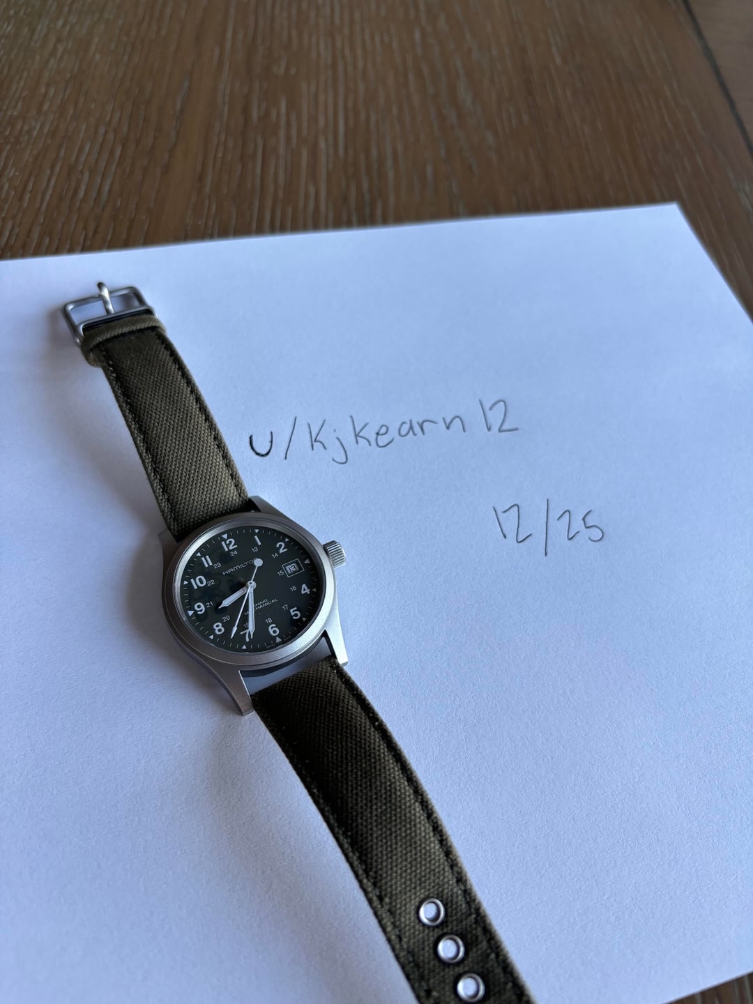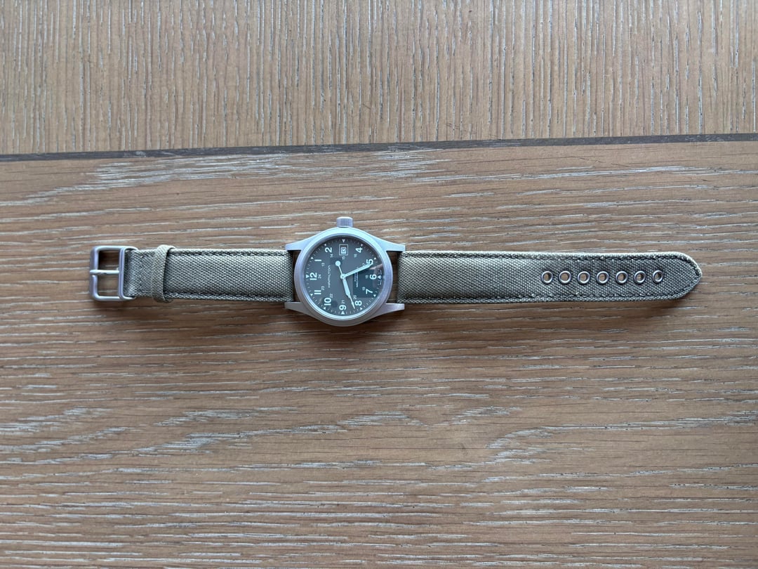 Hello all, Today I am selling my Hamilton Khaki Field Mechanical. For those who are unfamiliar specs are as follows: Movement • Manual-winding mechanical movement • Caliber: Hamilton H-50 with extended power reserve (~80 hours)  Case • Case material: Stainless steel  • Case diameter: 38 mm  • Case thickness: ~9.5 mm  • Case back: Solid stainless steel  • Bezel: Fixed stainless steel  Crystal • Scratch-resistant sapphire crystal  Strap • Green canvas/textile strap  • Lug width: 20 mm  • Buckle: Stainless steel tang buckle  Performance • Power reserve: Approx. 80 hours  • Water resistance: 5 ATM / 50 m • Functions: Hours, minutes, central seconds, date This sale is watch only for $350 Payment can be taken through through PayPal G&S Always open to trades Merry Christmas
