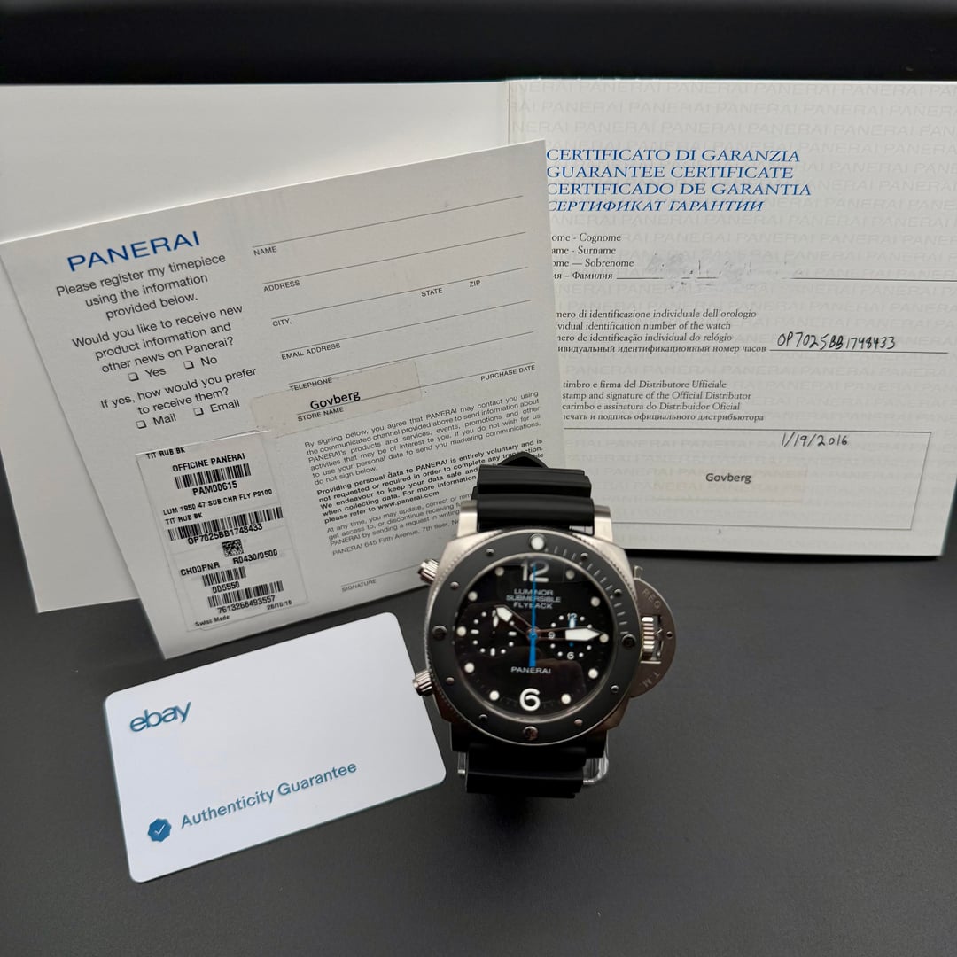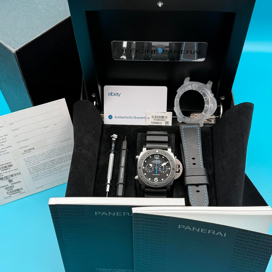 **Panerai Luminor Submersible 1950 Flyback Chronograph PAM00615 (2016) | Full Set $8250** [Timestamp](https://imgur.com/a/kfuB9mC) | [All Pictures](https://imgur.com/a/oNrLfL3) Up for sale is my 2016 Panerai Luminor Submersible Flyback Chronograph (PAM00615), featuring the bold 47mm brushed titanium case, deep blue dial, and the in-house P.9100 flyback chronograph movement. This is a full set in excellent condition with no visible wear. The lightweight titanium case, professional dive rating, and flyback chronograph make this one of the most desirable modern Submersibles. What’s Included • Panerai PAM00615 Watch • OEM rubber strap • Additional OEM leather strap • Bezel guard • Panerai tools • Inner box • Outer box • Booklets / instruction manuals • Warranty papers (dated 2016) • Certification card **Asking Price: $8250** (including insured Priority Overnight shipping CONUS) out of Los Angeles, CA area Open to trades with Omega Speedmaster and Seamaster models. Payment via bank wire or Zelle I'm a full time engineer at a tech startup and very new to Reddit and this community. Please feel free to reach out with any questions or requests for additional photos or videos, I would be happy to make sure you are comfortable doing a transaction with me. No returns unless the watch is materially misrepresented