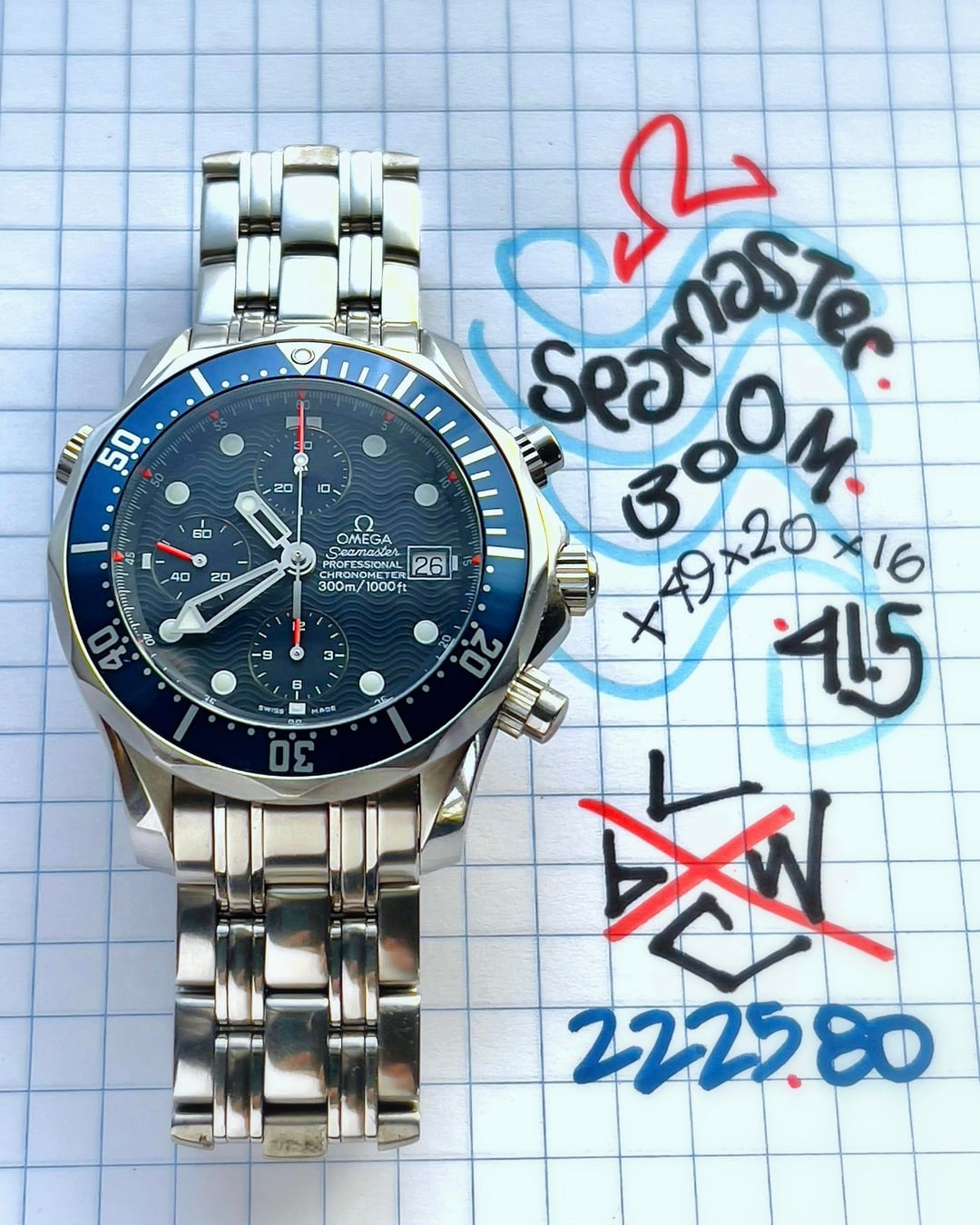 Omega Seamaster Professional Chronograph 300m ref. 2225.80 Automatic caliber 1164 The Seamaster has a rich maritime history and this 300m Professional with screw down crown is one of The time tools built for racing over oceans. This neo-vintage diver Chrono is not only easy on the wrist but also offers some wabi-sabi appeal to the eyes with an marine blue insert and vibrant red tip seconds hand that has nicely faded a neon flamingo hue. Overall very excellent condition for age with light marks desk diver rash. While no records, the timegrapher data shows a healthy watch. Lastly, for comfortable fit, your wrist should be 7.25in and under. The total measurement of this with is 7.4in with head and bracelet laid out. It is possible for us to source more links. To measure your wrist: Take string or wire and wrap around the bone of your wrist ; mark it or cut and measure the string Timestamp pix Videos and timegrapher: https://drive.google.com/drive/folders/1PemjImJSZDqC6_ZKCF0Nz1Py75SLhqOC?usp=sharing Specifications: 41.5mm case X 20 lug width X 49h X 16cc with sapphire Box and papers: no \* video is the best way to view the watch if in-person test drive is not available. Due to the different characteristic of the cameras and gadgets used, the color of the watch you purchase may not be the same as shown on this website or on our Instagram. \* will consider trades that make sense but please consider time, shipping, and trade value—not market. \* local special: can possibly accommodate at ButterScotch in Downtown Long Beach by appointment \* All sales final unless the watch is misrepresented or lost in transit (always fully insured) \* Link to \[feedback here\](https://www.reddit.com/r/WatchExchangeFeedback/search?q=soycowboy&restrict\_sr=1&sort=new) & \[watchcharts here\](https://watchcharts.com/repcheck/user/soycowboy?source=reddit&type=feedback) \* Asking a \*negotiable\* \*\*$2225\*\* via bank wire, Zelle, venmo, or possibly paypal with super strong references or if I know you. Price includes fully insured Fedex shipping in the USA— hand delivery in Long Beach with drinks or coffee on me ;). Cheers, Stephen
