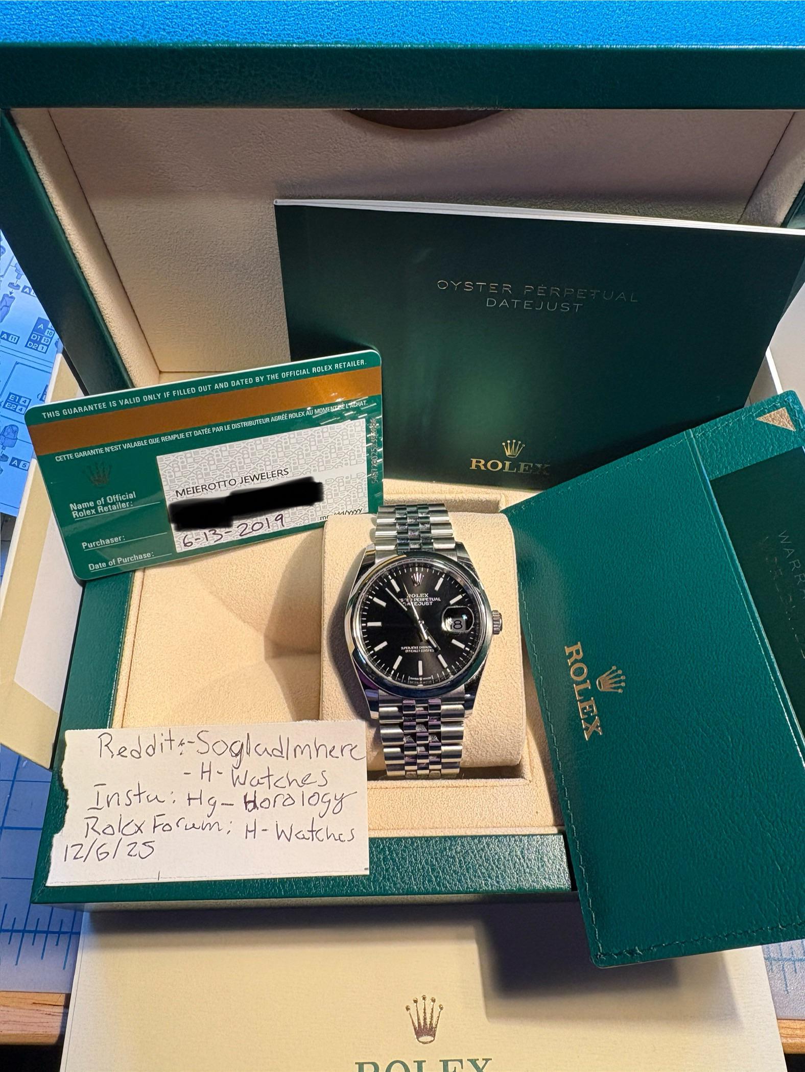 [WTS] Rolex Datejust 36mm – Ref. 126200 – Black Dial – Jubilee Bracelet Full set Price: $7800 shipped CONUS Payment: Wire Transfer, Zelle, PayPal friends and Family More photos: https://imgur.com/a/bpG4k2D[more photos](https://imgur.com/a/bpG4k2D) Up for sale is my personal Rolex Datejust 36 (Ref. 126200) with the black dial on a Jubilee bracelet. It’s a fantastic, versatile piece, but it’s time for it to go to a new home. Condition: The watch has been worn and shows normal signs of use. I do not believe in polishing watches, so I’ve left that decision to the next owner. No deep gouges or damage—just honest wear. Crystal is clean. Specs: • Model: Rolex Datejust 36 • Reference: 126200 • Dial: Black • Bracelet: Jubilee (full bracelet included) • Movement: Rolex 3235 • Purchased: 2019 • Comes with: Inner and our box, warranty card, manual, tags, extra links. This is a full set. I’ve got lots of history and reviews on the Rolex Forum. I have other transactions on watchexchange as well. My instagram is hg_horology Rolex Forums Reviews Rolex forum profile H-Watches https://www.rolexforums.com/member.php?u=142400 Sale Rolex Datejust - https://www.rolexforums.com/showthread.php?t=662866&highlight=Paige Sale - https://www.rolexforums.com/showthread.php?t=643352&highlight=Paige Sale - https://www.rolexforums.com/showthread.php?t=642775&highlight=Paige Sale - https://www.rolexforums.com/showthread.php?t=590945&highlight=Paige Buyer - https://www.rolexforums.com/showthread.php?t=561851&highlight=Paige Sale - https://www.rolexforums.com/showthread.php?t=561022&highlight=Paige