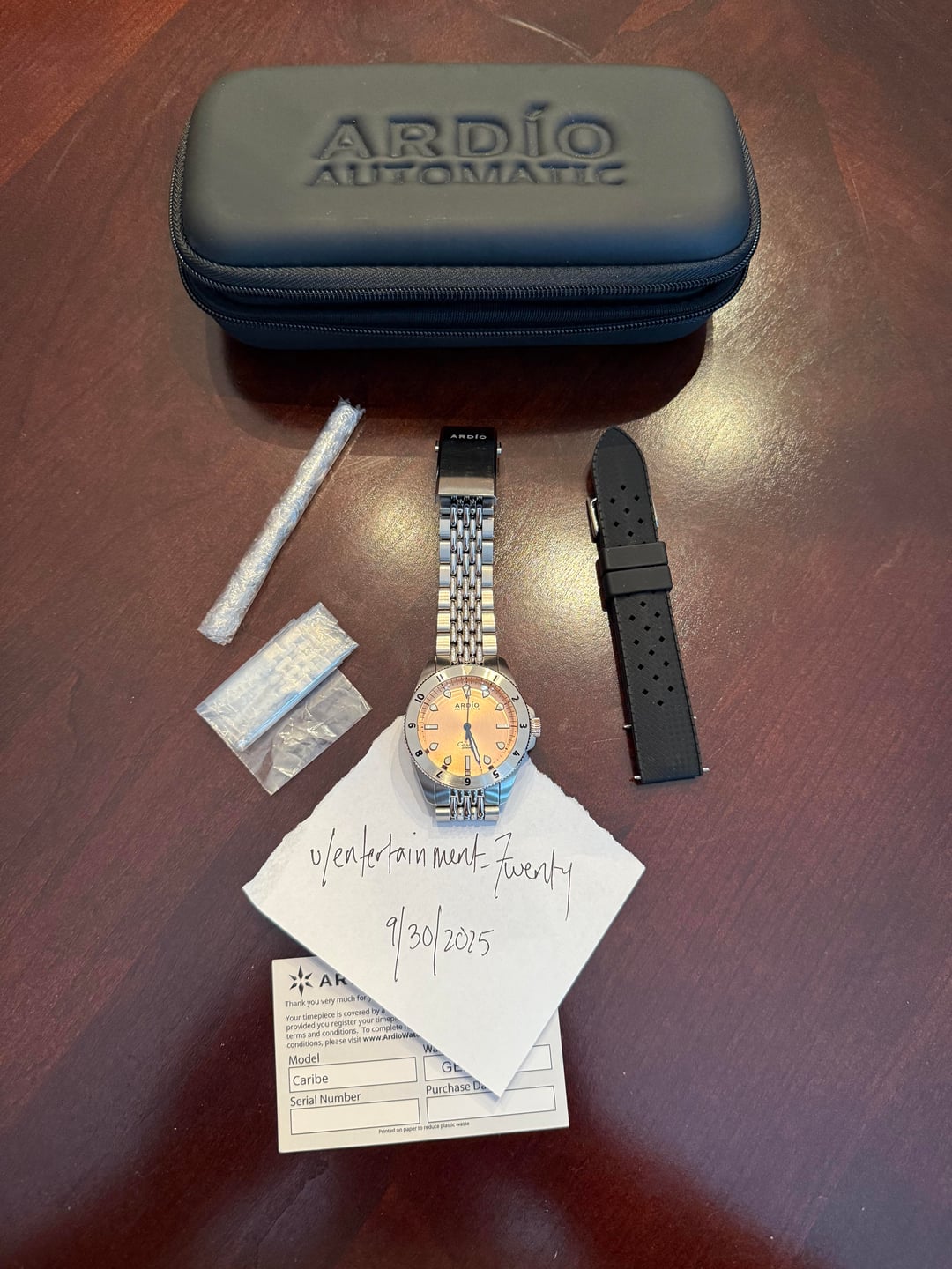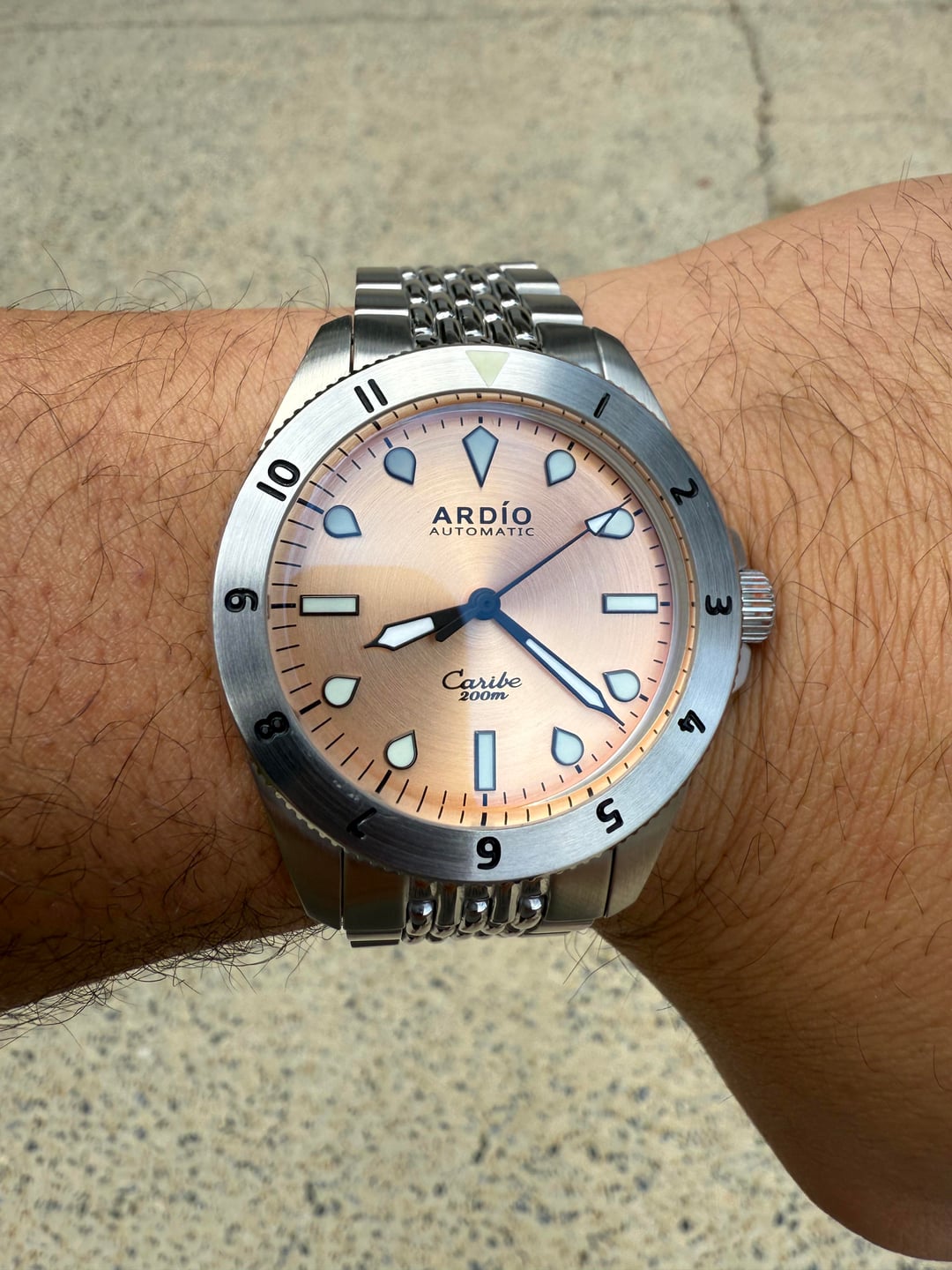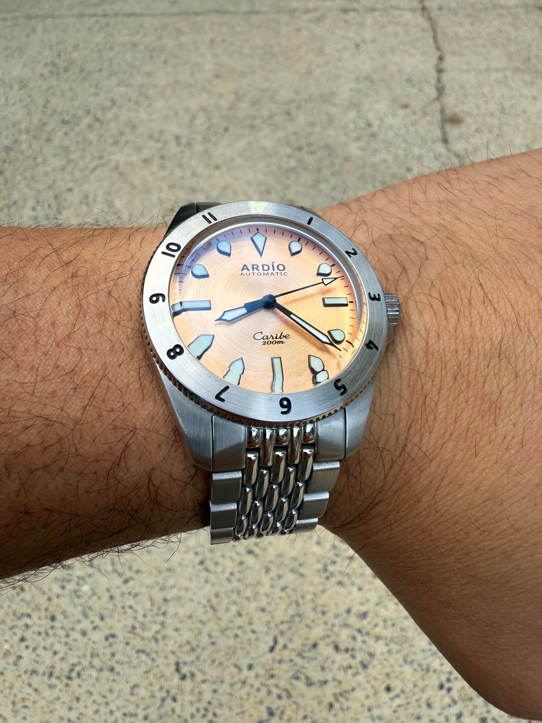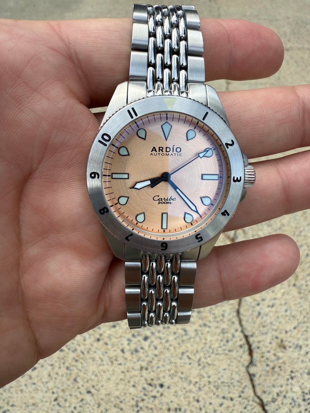 Putting this back up for sale. Let's find it a new home! Up for sale is a very gently used Ardio Caribe brass dial 40mm. I bought it new from Ardio in March 2024 and includes the Ardio beads of rice stainless quick-release bracelet with on-the-fly micro adjust clasp. Watch is in excellent condition and punches well above its weight in build and quality. Currently sized for 7.25in wrist and includes 2 additional links, black Ardio tropic strap, spring bar tool, warranty card, and travel pouch. [Full album including videos](https://imgur.com/a/5XFs3S1) Asking $250 OBO ~~$299~~ ~~$325~~ ~~$350~~ and price include CONUS shipping and will accept PayPal F&F or Zelle. Please post a comment here before messaging or I may not respond. Happy to share any additional pics or timestamps for anyone interested. Thanks for looking!