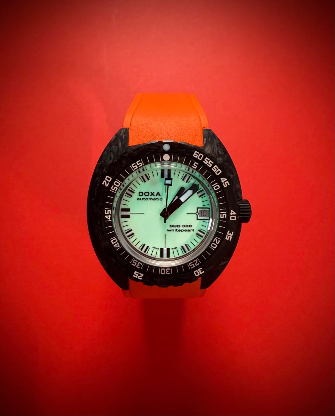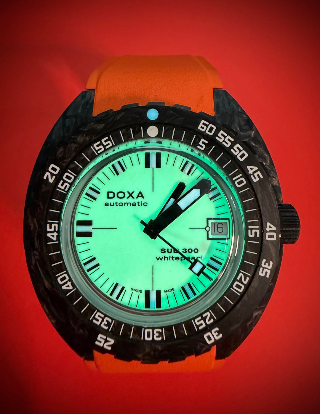 You want lume? Well, look no further. Presenting the Doxa Sub 300 Carbon in whitepearl. The watch comes with box, manual, OEM white rubber strap and paired currently in this orange strap. This watch simply pops on the wrist and is extremely light and comfortable to wear. The buckle has a slight raise and does not sit fully flush when locked in from natural usage (see image) but it has absolutely no issues with use and wear. Price is $3,500 - no trades. US only (apologies to the international members in the community).