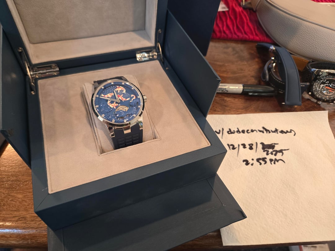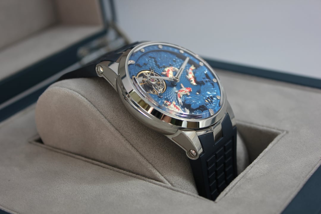 **Summary**: For sale is a very interesting Chinese watch from Haofa. This model's standout feature is the intricate, revolving guilloche dial, on which several playful carp swim. Moreover, the exposed balance wheel and dial are located on a mobile plate, which revolves around the center point of the dial face once every 60 minutes. In other words, the carp swim around the dial--a classic Chinese motif symbolizing harmony and fortune. This watch's interesting rotating dial is achieved using a modern variant of the classic carousel design of Bahne Bonniksen, who designed it in the1890s to compete with Abraham Breguet's technically brilliant but complicated tourbillon mechanism. Bonniksen's resulting design, named "carousel", [was patented in 1895](https://patents.google.com/patent/US549287A/en) and survives to this day as one of the few mechanisms invented to address the variance in accuracy caused by gravity. Very few watch manufacturers have attempted a modern carousel caliber. The only ones (to my knowledge) who have done so are Haofa and Shanghai Watch Factory. This watch comes with "full kit" -- shopping bag, outer cardboard case, inner display case, accessories bag, etc. **Price**: $910. Shipping is $25 in continental US via USPS Priority Mail, signature required. Local sale in Los Angeles area welcome. I accept Zelle, Venmo, and Paypal (+4%). **Timestamp**: [https://imgur.com/a/qNMsyBq](https://imgur.com/a/qNMsyBq) **Overall condition**: Like new / extremely light marks on case. Worn a small handful of times -- less than five times. See detail photos for reference. **Dial**: 43mm. **Crystal**: sapphire. **Movement**: Haofa in-house caliber, no. 125.02K **Strap/bracelet**: proprietary 22mm width strap, rubber (FKM or silicone), spring-loaded butterfly clasp. **Accuracy**: regulated by Sangamon Watches to to achieve excellent accuracy. The timegrapher photo is a "best case" reading across 1 minute in dial-up position; your experienced accuracy may vary. But the accuracy snapshot gives you a good idea of what to expect--well within the ISO 3159 chronometer standard. **Miscellaneous**: I posted a brief review of this watch on r/Chinesewatches [here](https://www.reddit.com/r/ChineseWatches/comments/1p3d1nc/haofa_carousel_model_1951_carp_on_rotating/). **Official listing from manufacturer**: [https://haofatourbillon.com/products/haofa-carrousel-tourbillon-koi-fish-watch-1951?variant=40979514327217](https://haofatourbillon.com/products/haofa-carrousel-tourbillon-koi-fish-watch-1951?variant=40979514327217) **Haofa b-roll showing rotation of dial**: [https://www.youtube.com/watch?v=lfijgqs2zsU](https://www.youtube.com/watch?v=lfijgqs2zsU)