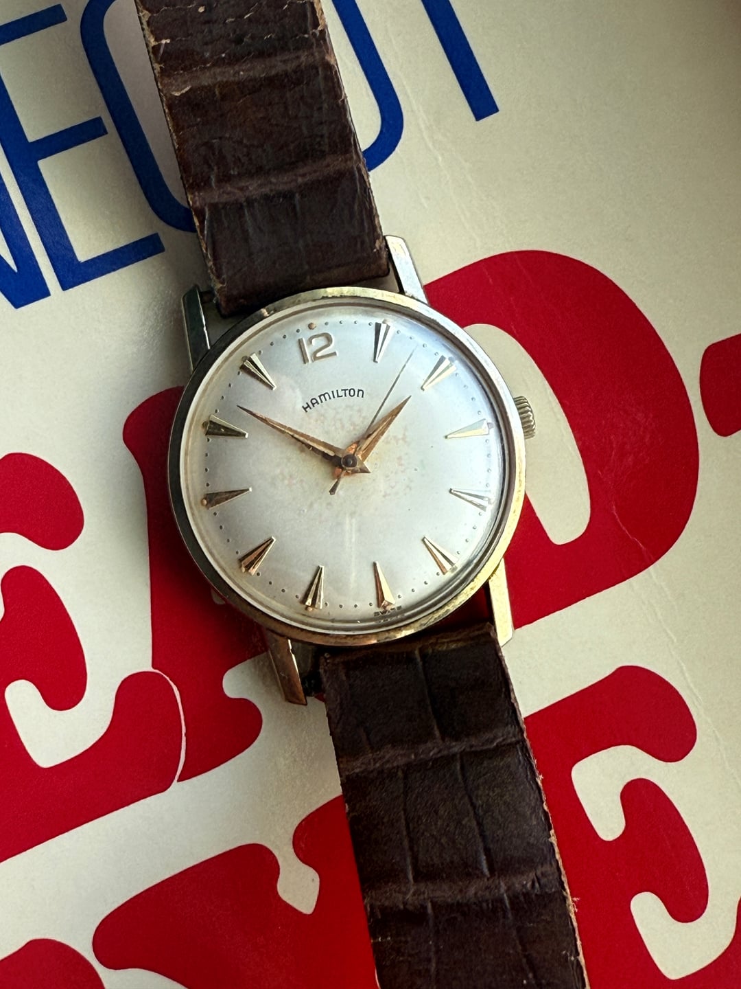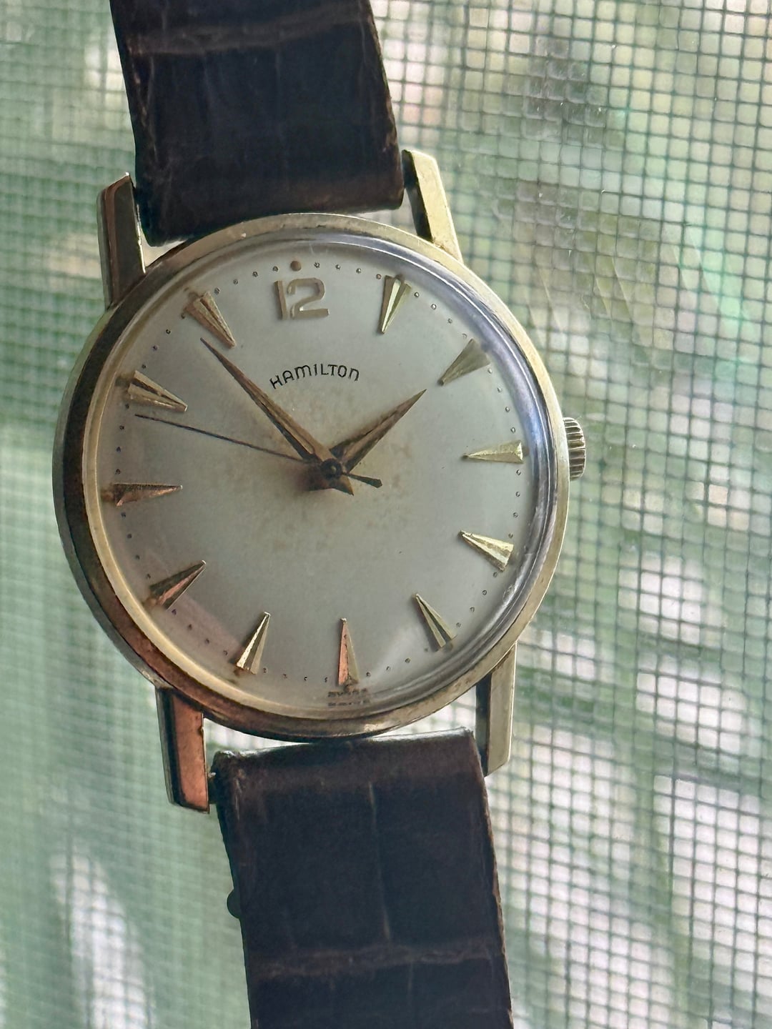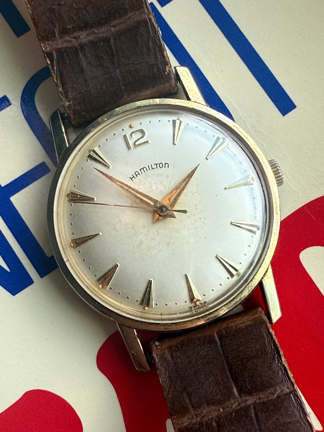 This vintage Hamilton from the 1950s features a Cal. 671 (ETA 1081) movement. The watch winds and sets smoothly. It's keeping reasonable time 24 hours after winding it, though that's anecdotal, no timegrapher data. Good cosmetic condition. 10K plated. The dial has some lovely light patina in a tight pattern around the center of the dial. Original signed crown. **$115 shipped.**