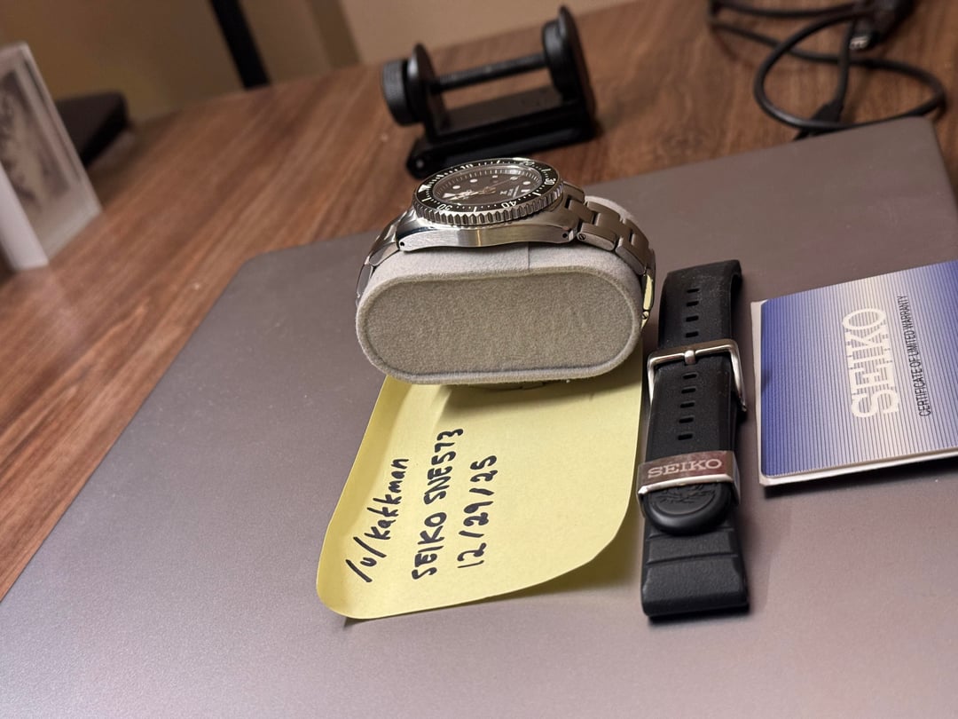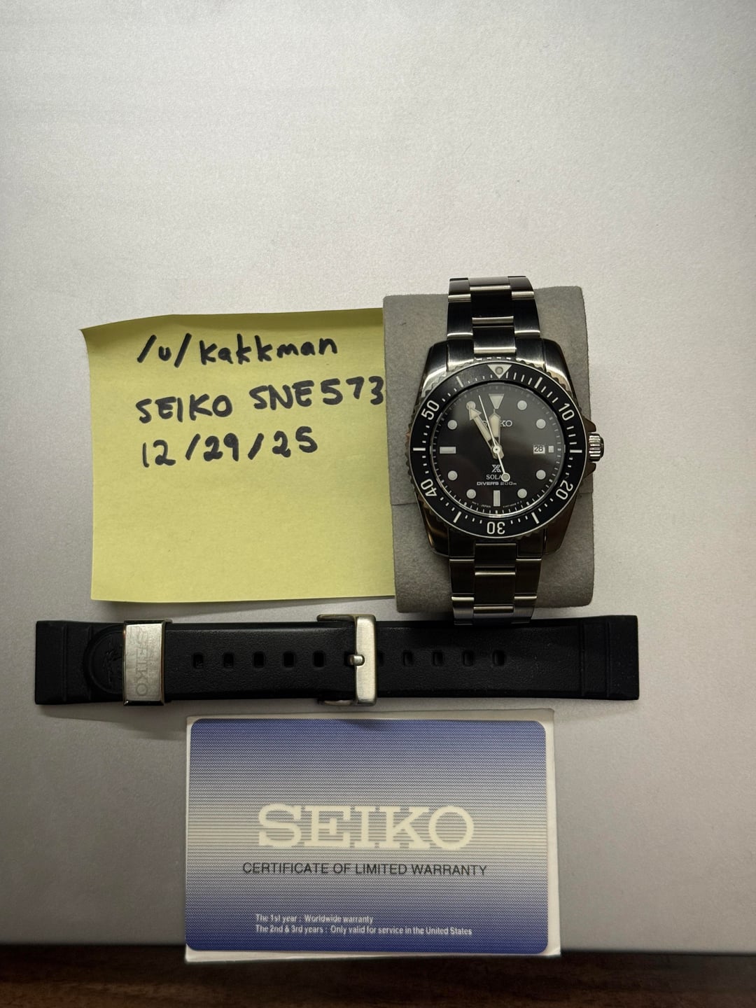 Available for sale! Asking $350 shipped CONUS. Seiko SNE573 38.5mm Very solid pre-owned condition. • Case has minor wear • Crystal is clean • Bezel has small blemish near 20 that is hard to spot. • Long Island Watches Oyster bracelet is brand new • Original Rubber strap included shows some wear. Comes with watch, steel and rubber bracelets and Seiko warranty card. Shipping from Chicago, IL. Open to local transaction as well. Please DM with any questions.
