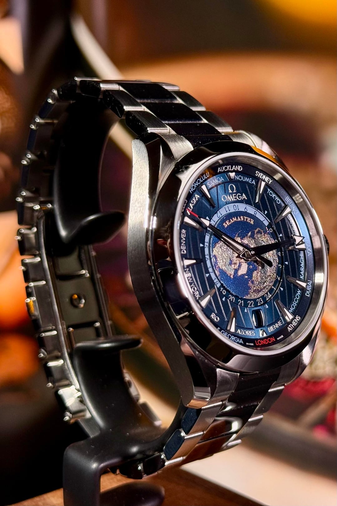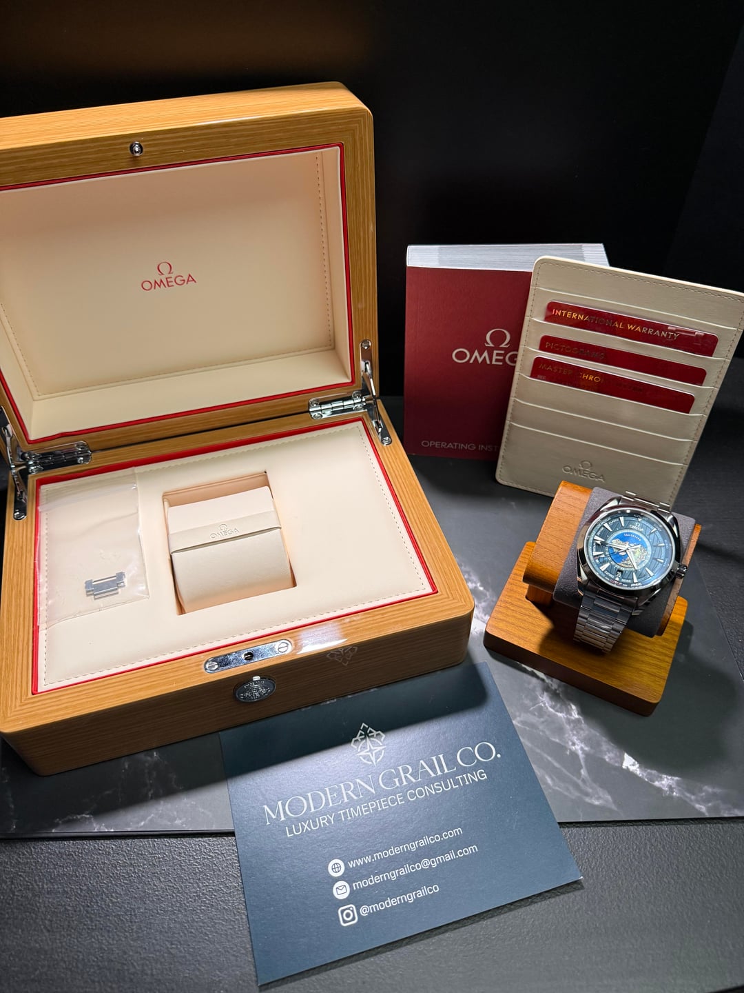 Up for sale is the iconic Omega Aqua Terra Worldtimer ref. 220.10.43.22.03.001, one of the most impressive and technically fascinating watches Omega currently makes. The laser ablated world map dial is absolutely stunning in person, with incredible depth and detail that photos barely do justice. Powered by Omega’s Master Chronometer Worldtimer movement, this piece lets you track global time at a glance while remaining incredibly wearable on the wrist. The 43mm case wears comfortably thanks to the twisted lugs, and the blue dial and steel bracelet combo makes it equally suited for daily wear or travel. A true one watch collection candidate for someone who appreciates both design and engineering. Reference #: 220.10.43.22.03.001 In very good condition with only minor hairlines on the bracelet consistent with careful use. Includes inner and outer box, extra link, and all three cards Asking - $6900 plus shipping within the CONUS Other comparable pieces are going for 7300 + tax and up on Chrono24 Timestamp: [https://imgur.com/a/OruUwdh](https://imgur.com/a/OruUwdh) Watches are shipped fully insured with FedEx Priority Overnight. To protect your purchase, all watches will be shipped to the nearest FedEx shipping location and will require a signature on pick-up. Wire or Zelle preferred. I’m new to selling on Reddit and happy to do a FaceTime to show you the watch and answer any questions! Follow us on Instagram moderngrailco or visit our website at [www.moderngrailco.com](http://www.moderngrailco.com/)