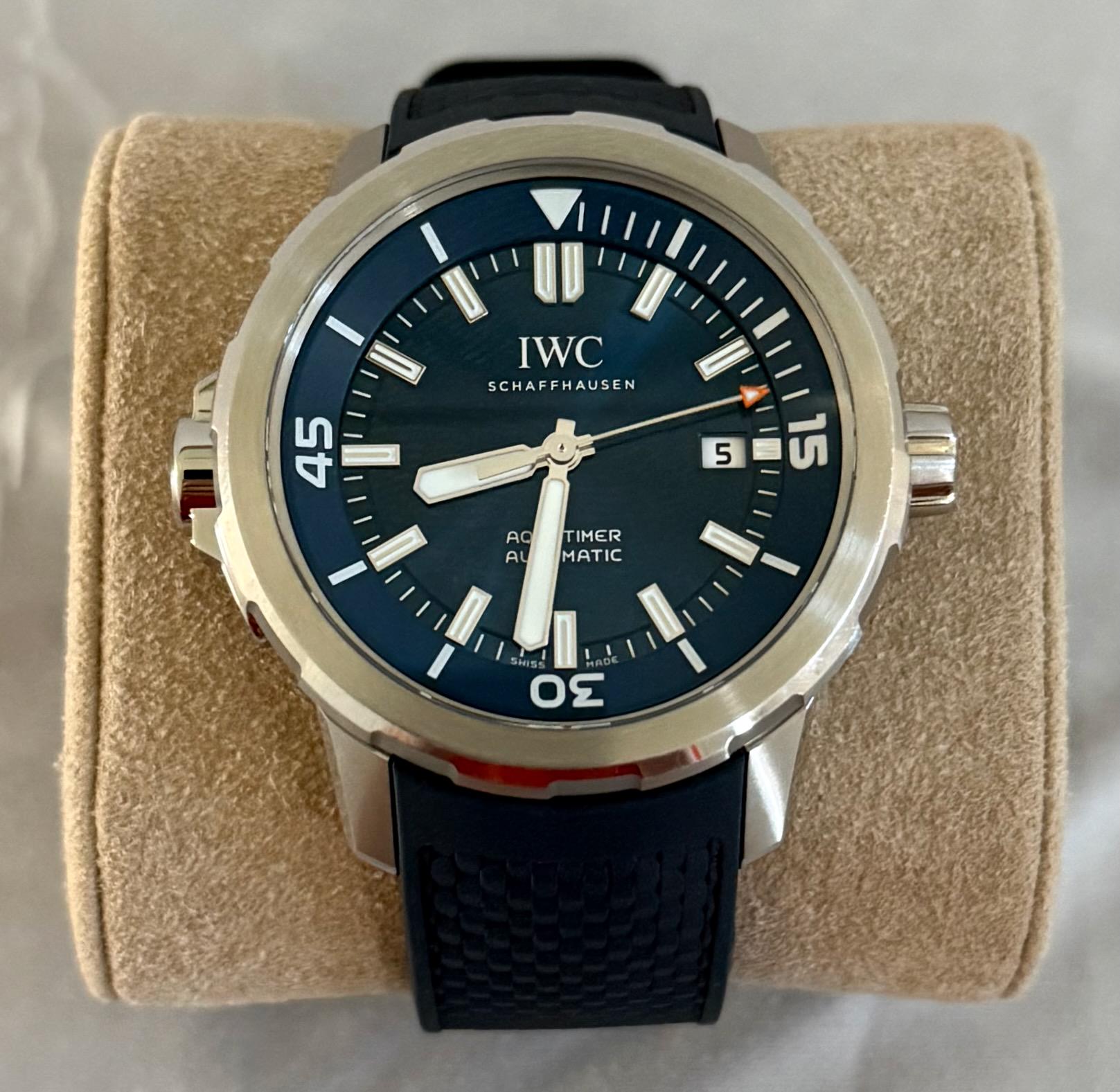 I WILL NOT INITIATE CHAT WITH YOU Photos, video, and timestamp - [https://imgur.com/a/VdD51EF](https://imgur.com/a/VdD51EF) IWC Aquatimer Automatic men’s dive watch reference IW328801. This watch is under IWC factory warranty until September 28, 2030. This model features the blue dial and the original IWC rubber strap with signed buckle. The watch has been worn very lightly and shows only minimal signs of careful use. Any surface marks are minor and mainly visible only on close inspection. The crystal is clear with no scratches, chips, or cracks. The bezel rotates smoothly. The screw down crown operates correctly. The movement is keeping accurate time. Includes: Outer and inner boxes, Papers and warranty card, Hang tag, IWC cleaning cloth Asking $3600 shipped Happy to facetime or answer any questions
