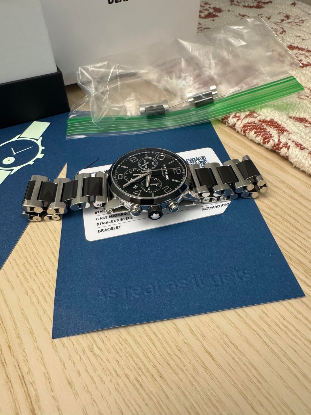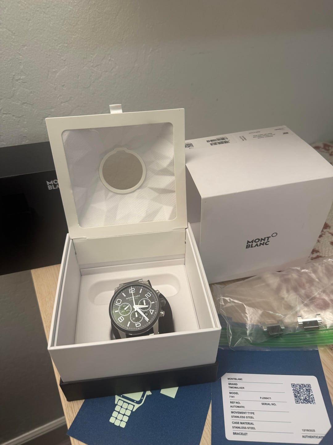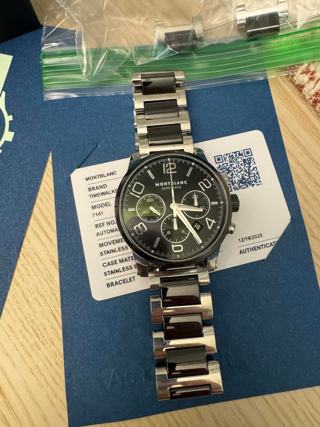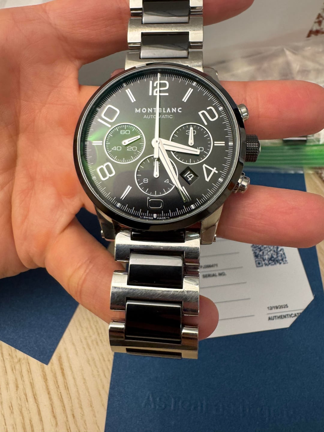 [Video](https://imgur.com/a/FkgHEqN) [Timestamp+Album](https://imgur.com/gallery/mb-voak1dy) Hey everyone, feel free to reach out. Montblanc is part of the Richemont Group, one of the world’s largest luxury conglomerates, also behind IWC, Cartier, Panerai, and Vacheron Constantin. The TimeWalker collection was influenced by Italian designer Giuliano Baldino, whose touch is evident in the bold case design, skeletonized lugs, and refined finishing. Montblanc watches are known for their solid construction, smooth chronograph pushers, and Swiss-made craftsmanship. This piece features a sporty yet refined two-tone ceramic and stainless steel case with a 43mm diameter. Shorter lugs allow for comfortable wear on a variety of wrist sizes, making it suitable for nearly anyone. The automatic chronograph movement is fully functional, and the watch carries a strong wrist presence with excellent build quality. Condition: Good overall. The watch shows normal wear including minor scratches and scuffs consistent with use. Crystal is clean, movement is fully functional, and all features operate as they should. Authentication: Will come with an official eBay Authentication card, confirming the watch has passed a rigorous multi-point inspection and is 100% authentic. Details: • Brand: Montblanc • Model: TimeWalker Automatic Chronograph • Reference: 103094 • Dial: Black • Case Size: 43 mm • Case Material: Ceramic & Stainless Steel (Two-Tone) • Movement: Swiss automatic chronograph • Origin: Swiss-made • Warranty: N/A Included: • Montblanc smartwatch box • eBay Authentication card • No booklet . Llinks Price: $1,500 Shipped Payment: Will accept PayPal Friends & Family, Zelle, or Bank Transfer. Shipping: USPS Priority Conus Only