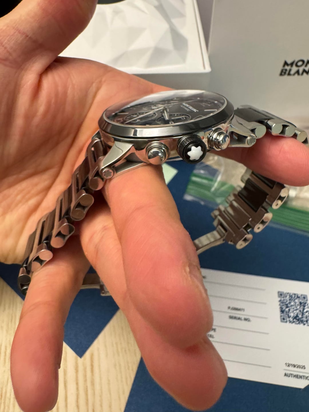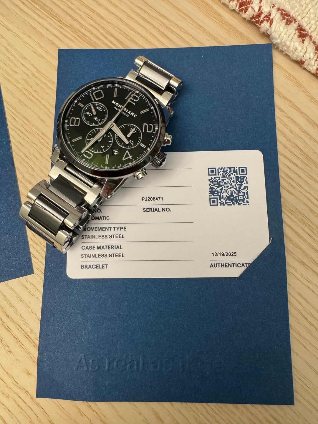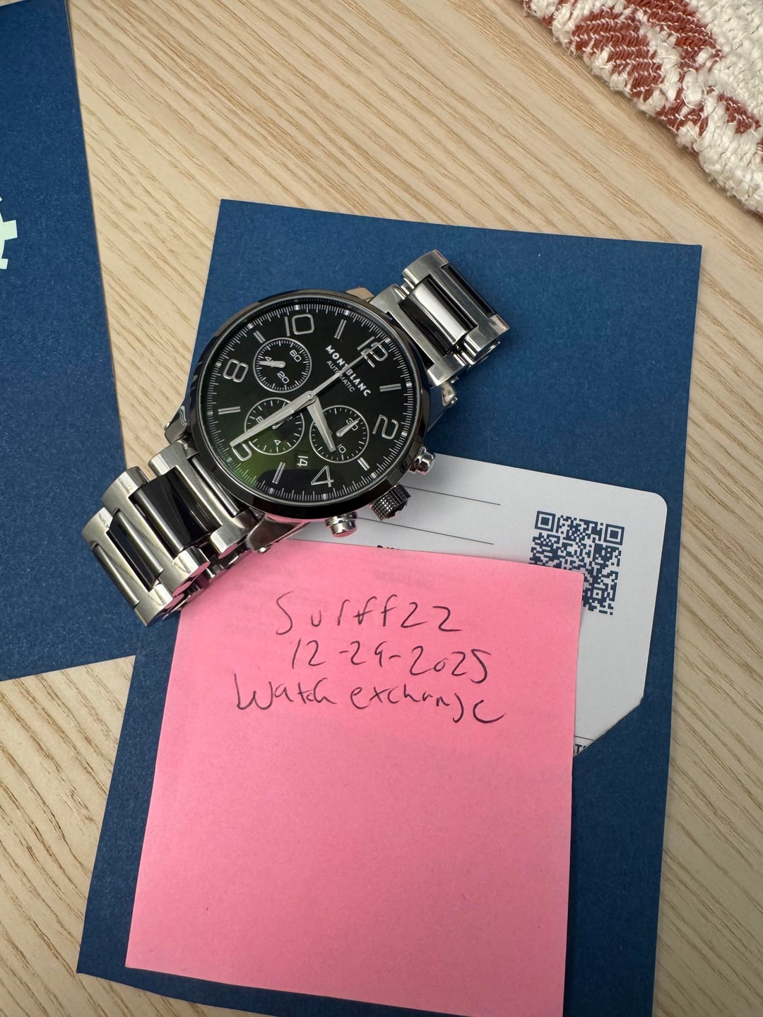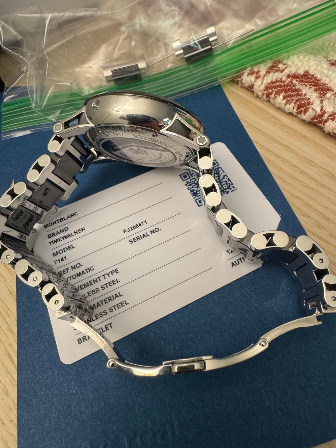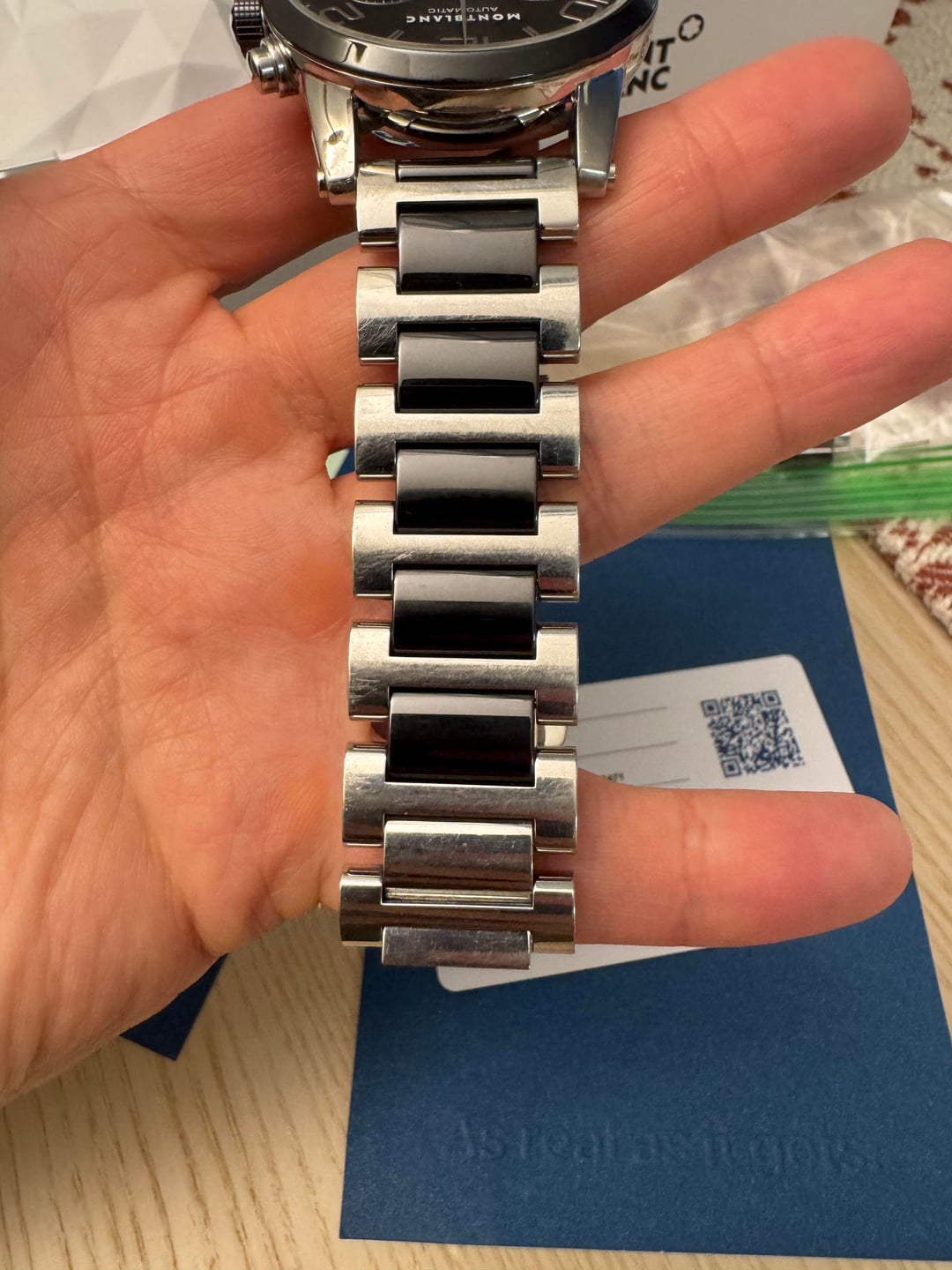 [Video](https://imgur.com/a/FkgHEqN) [Timestamp+Album](https://imgur.com/gallery/mb-voak1dy) Hey everyone, feel free to reach out. Montblanc is part of the Richemont Group, one of the world’s largest luxury conglomerates, also behind IWC, Cartier, Panerai, and Vacheron Constantin. The TimeWalker collection was influenced by Italian designer Giuliano Baldino, whose touch is evident in the bold case design, skeletonized lugs, and refined finishing. Montblanc watches are known for their solid construction, smooth chronograph pushers, and Swiss-made craftsmanship. This piece features a sporty yet refined two-tone ceramic and stainless steel case with a 43mm diameter. Shorter lugs allow for comfortable wear on a variety of wrist sizes, making it suitable for nearly anyone. The automatic chronograph movement is fully functional, and the watch carries a strong wrist presence with excellent build quality. Condition: Good overall. The watch shows normal wear including minor scratches and scuffs consistent with use. Crystal is clean, movement is fully functional, and all features operate as they should. Authentication: Will come with an official eBay Authentication card, confirming the watch has passed a rigorous multi-point inspection and is 100% authentic. Details: • Brand: Montblanc • Model: TimeWalker Automatic Chronograph • Reference: 103094 • Dial: Black • Case Size: 43 mm • Case Material: Ceramic & Stainless Steel (Two-Tone) • Movement: Swiss automatic chronograph • Origin: Swiss-made • Warranty: N/A Included: • Montblanc smartwatch box • eBay Authentication card • No booklet . Llinks Price: $1,500 Shipped Payment: Will accept PayPal Friends & Family, Zelle, or Bank Transfer. Shipping: USPS Priority Conus Only