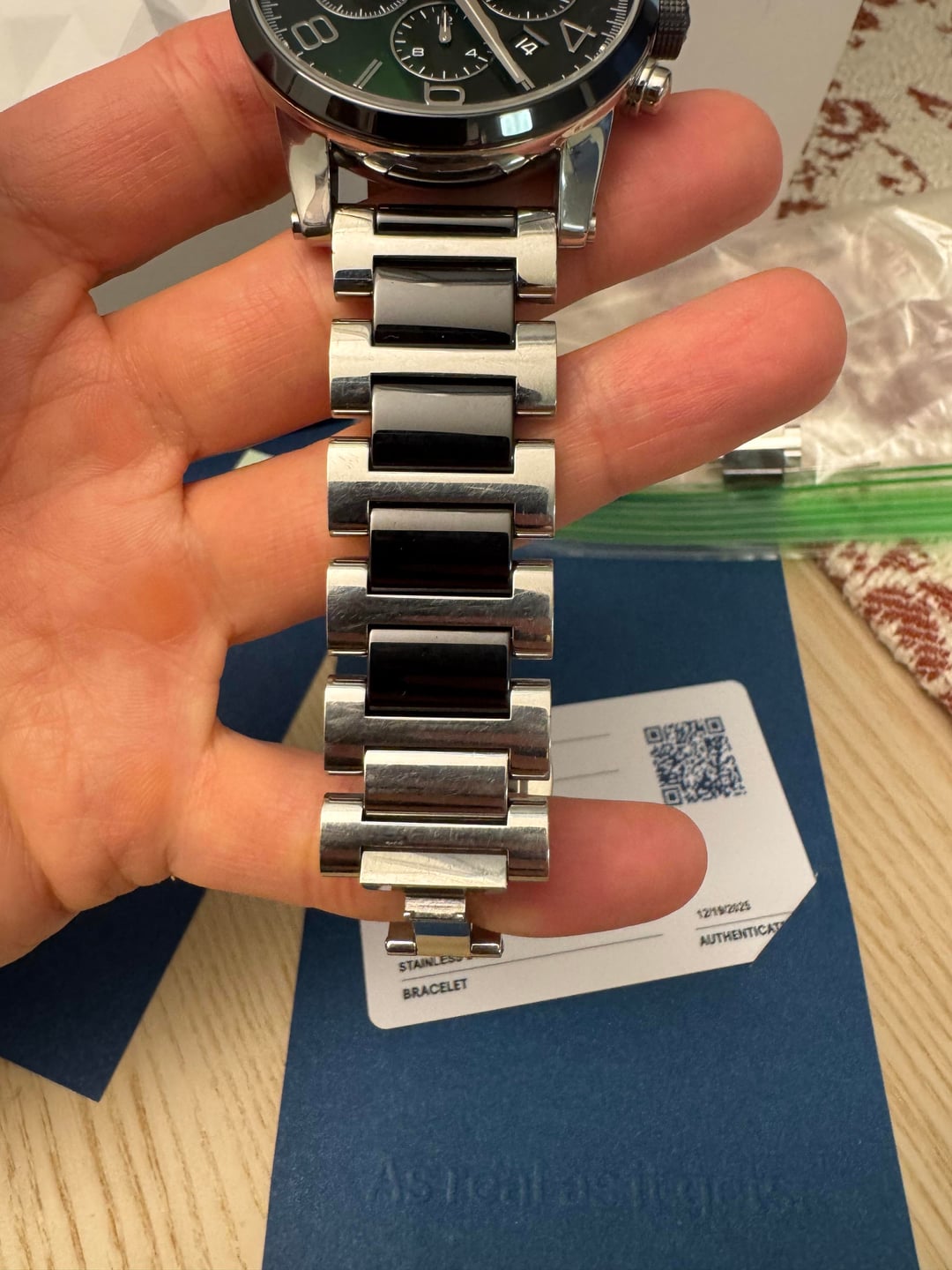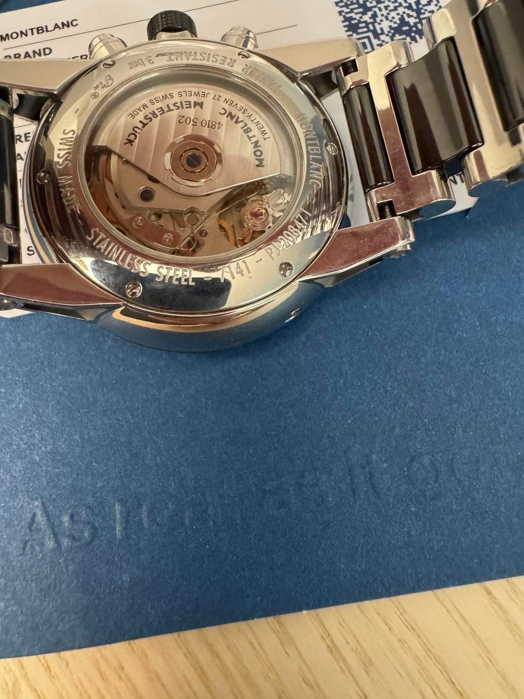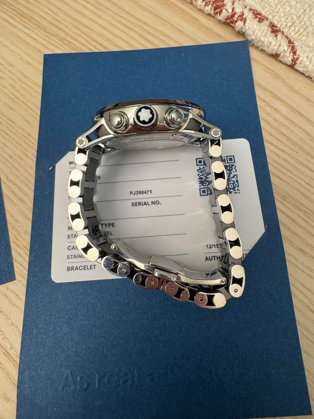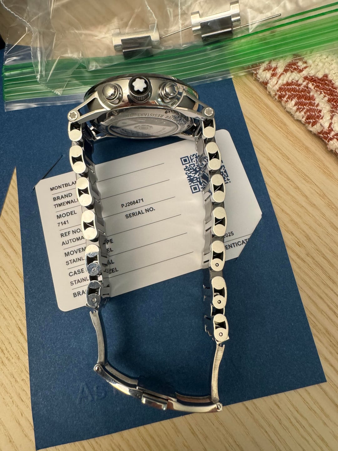 [Video](https://imgur.com/a/FkgHEqN) [Timestamp+Album](https://imgur.com/gallery/mb-voak1dy) Hey everyone, feel free to reach out. Montblanc is part of the Richemont Group, one of the world’s largest luxury conglomerates, also behind IWC, Cartier, Panerai, and Vacheron Constantin. The TimeWalker collection was influenced by Italian designer Giuliano Baldino, whose touch is evident in the bold case design, skeletonized lugs, and refined finishing. Montblanc watches are known for their solid construction, smooth chronograph pushers, and Swiss-made craftsmanship. This piece features a sporty yet refined two-tone ceramic and stainless steel case with a 43mm diameter. Shorter lugs allow for comfortable wear on a variety of wrist sizes, making it suitable for nearly anyone. The automatic chronograph movement is fully functional, and the watch carries a strong wrist presence with excellent build quality. Condition: Good overall. The watch shows normal wear including minor scratches and scuffs consistent with use. Crystal is clean, movement is fully functional, and all features operate as they should. Authentication: Will come with an official eBay Authentication card, confirming the watch has passed a rigorous multi-point inspection and is 100% authentic. Details: • Brand: Montblanc • Model: TimeWalker Automatic Chronograph • Reference: 103094 • Dial: Black • Case Size: 43 mm • Case Material: Ceramic & Stainless Steel (Two-Tone) • Movement: Swiss automatic chronograph • Origin: Swiss-made • Warranty: N/A Included: • Montblanc smartwatch box • eBay Authentication card • No booklet . Llinks Price: $1,500 Shipped Payment: Will accept PayPal Friends & Family, Zelle, or Bank Transfer. Shipping: USPS Priority Conus Only