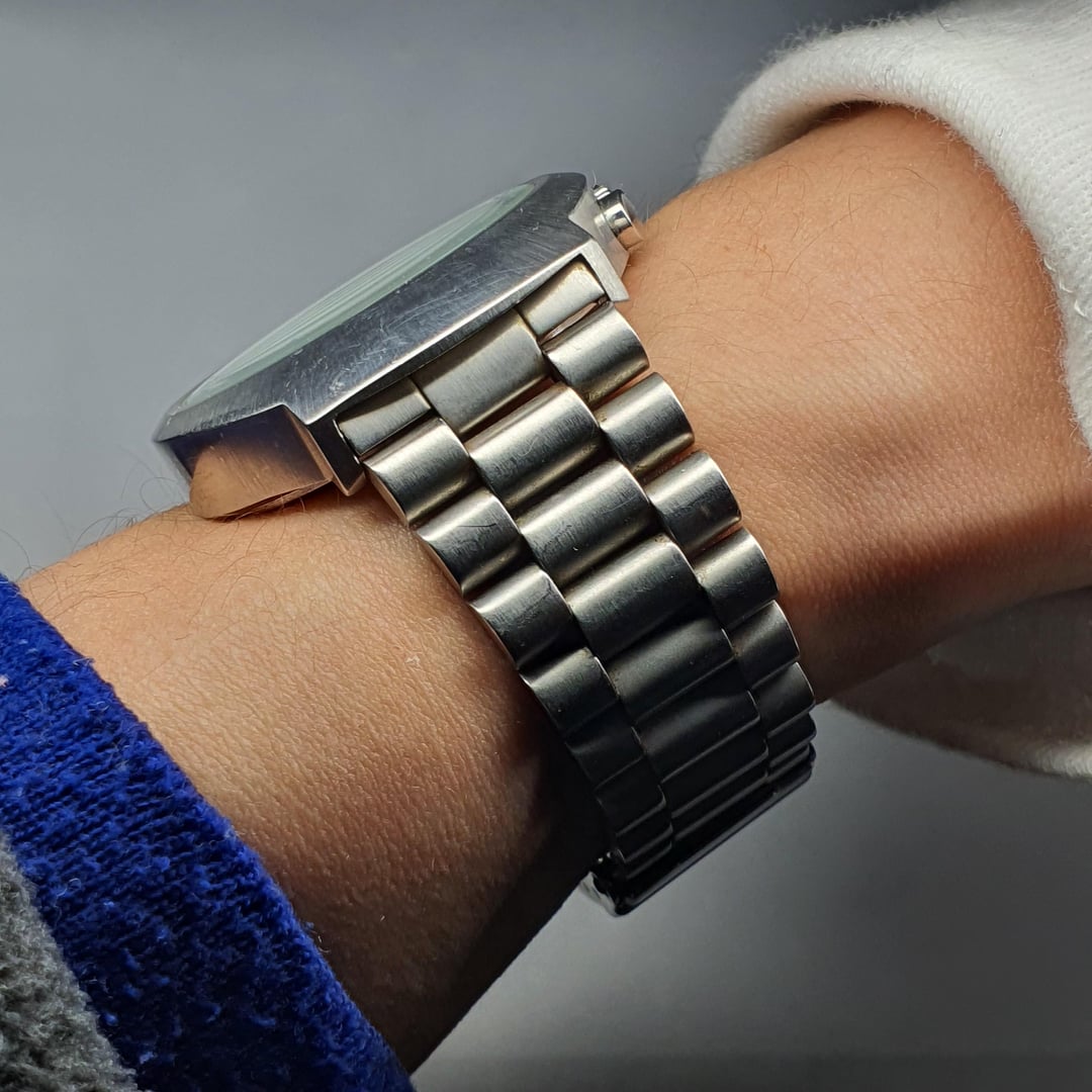 Hey WatchEx! For sale is this vintage Technos '70s-Style Chronograph. Technos was founded in Switzerland by Joseph Gunzinger and was trademarked in 1924 by his son when he took over the company. During the quartz crisis, like many Swiss brands, Technos found themselves in financial trouble and in 1970 the company was sold to General Watch Co. who transferred Technos to a new premises where they also integrated Certina in 1980. Japan was one of Technos' largest markets so in 1982 it was sold to its long-time Japanese importer, Heiwado & Co. This watch, reference number TGM690, was produced during Heiwado & Co ownership and made exclusively for the Japanese domestic market. Judging by the case back design, it points to a '90s release before the company and all its rights were sold again in 2002 to Technos Relógios S.A. who represented Technos watches since 1956 in Brazil, where Technos now thrives. The design looks like it was inspired by their own genuine Swiss-made 1970s chronograph ref.10767 and other '70s space-age chronographs. The dial has a retro, checkered minute track, evocative of racing. The monochrome hands are very much in the Seiko style from the mid '70s like the 6138-0020 or the 6139-7080. The orange chronograph hands pop nicely as the accent. The internal bezel is raised from the dial while the subdials have concentric circle texturing. The subdial on the right is a 24h dial. Due to the 40mm diameter, the stainless steel case has a lot of presence without being overbearing. I have a relatively small wrist at 6 inches as reference. The case features radial brushing and high-polish pushers and crown. The single domed crystal gives some nice vintage distortions at extreme angles. It houses the SII (Seiko) calibre VD54B movement that feels good when setting the time. All the time keeping and chronograph functions are working with no issues. The original stainless steel presidential-style bracelet has solid links and a secure double locking clasp that can accommodate up to roughly a 17.5cm wrist. The condition is great with minor general wear. Brand new battery installed. Looking for $235 net (buyer pays Paypal or Wise fee) + shipping Dimensions are: 40.2mm x 49mm x 11mm Lug Width 22mm (according to my callipers) Bought in Japan. \*Returns accepted but all return postage costs are the buyer's responsibility in all circumstances and any re-import fees that I have to pay when receiving the watch will be deducted from the refund amount.
