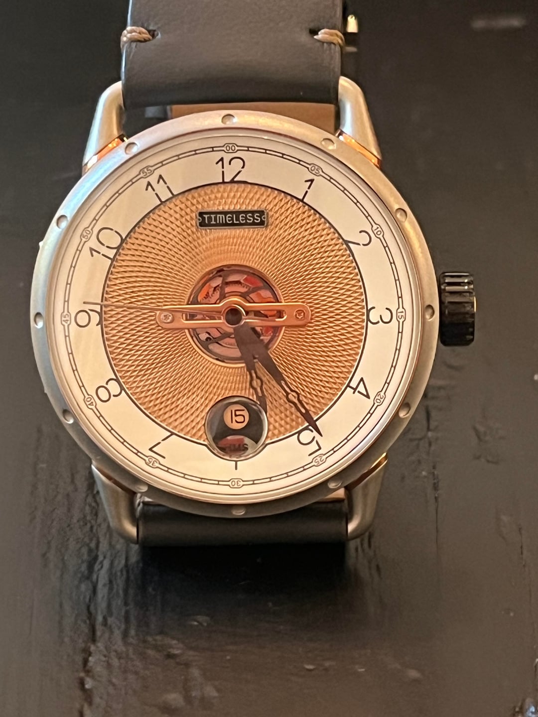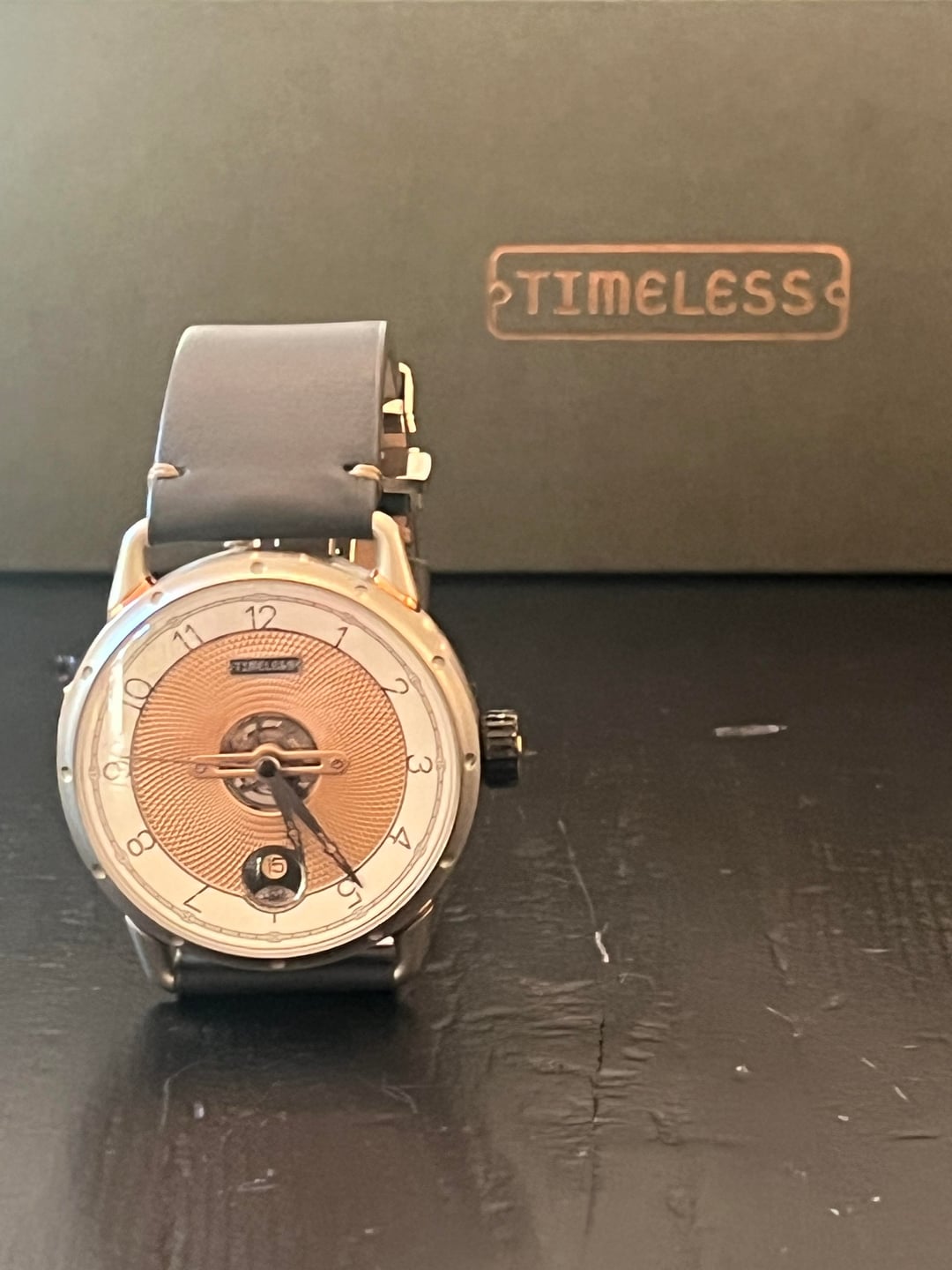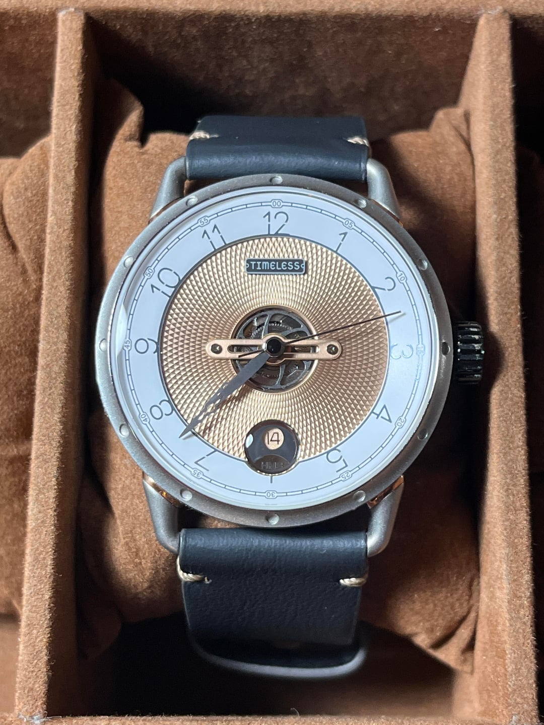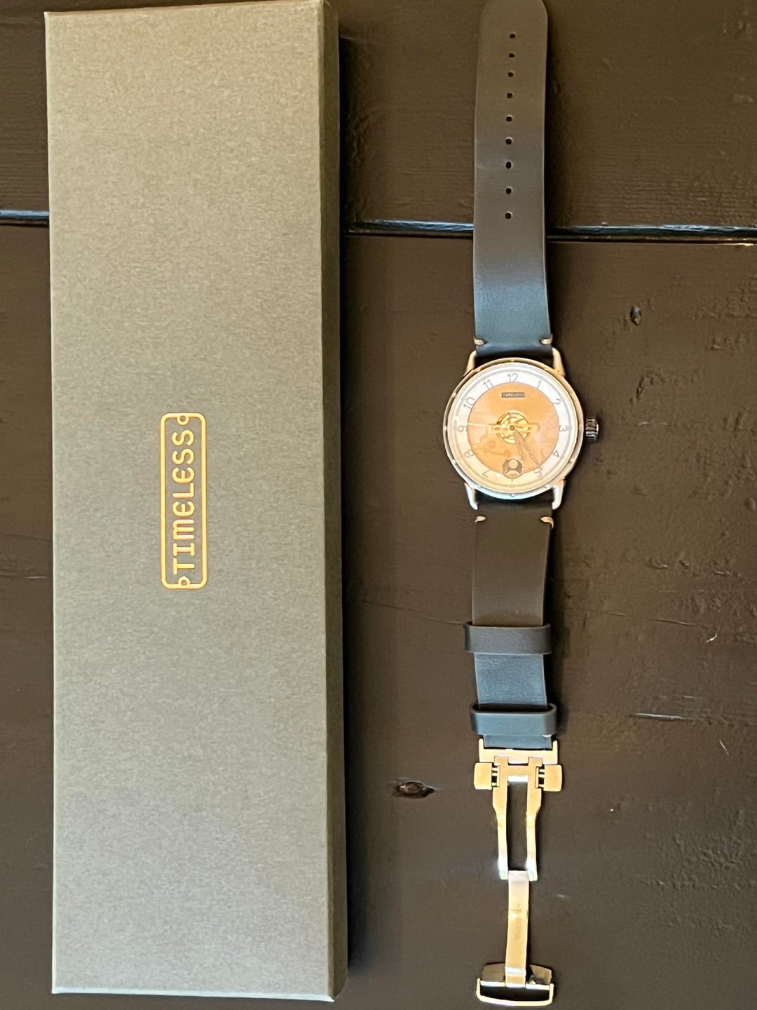 Up for sale is a real sleeper of a Swiss watch: The Timeless HMS003. Shortlisted for the GPHG Challenge Prize in 2023, this industrial-chic watch is full of delightful touches. The guilloché-style dial (it is CNC, not handmade) attracts, reflects, and plays with natural light in unexpected ways. The industrial lugs get a touch of whimsy with gold accents at the case. The PVD crown is nicely adorned with the Timeless logo (also accented with gold). The sloping outer/hour ring adds color and texture to the dial. The central skeletoning gives a glimpse at the STP 1-11 movement and allows you to watch the movement wind while setting it. The date window is nicely integrated and unobtrusive. Finally, the deployant clasp on the lush bracelet is well-engineered for a snug fit. Mael Oberkampf and his wonderful team have really thought of everything! This limited (1/40), numbered version was the very one nominated by the GPHG. It is unlikely you will see another one around. My watch is in excellent condition. With the exception of light wear on the deployant clasp and creasing to the strap, I cannot see a flaw. Price: **$1525**. I am happy to use PayPal (F&F preferred but G&S fine; buyer pays fees), Venmo, or Zelle. I would prefer CONUS but would be willing to discuss elsewhere. This is a particularly good deal for US buyers. The watch is nearly sold out and would cost about 25% more with the weak dollar and higher tariffs. I would prefer a US sale but feel free to reach out if you are somewhere else. Happy shopping!