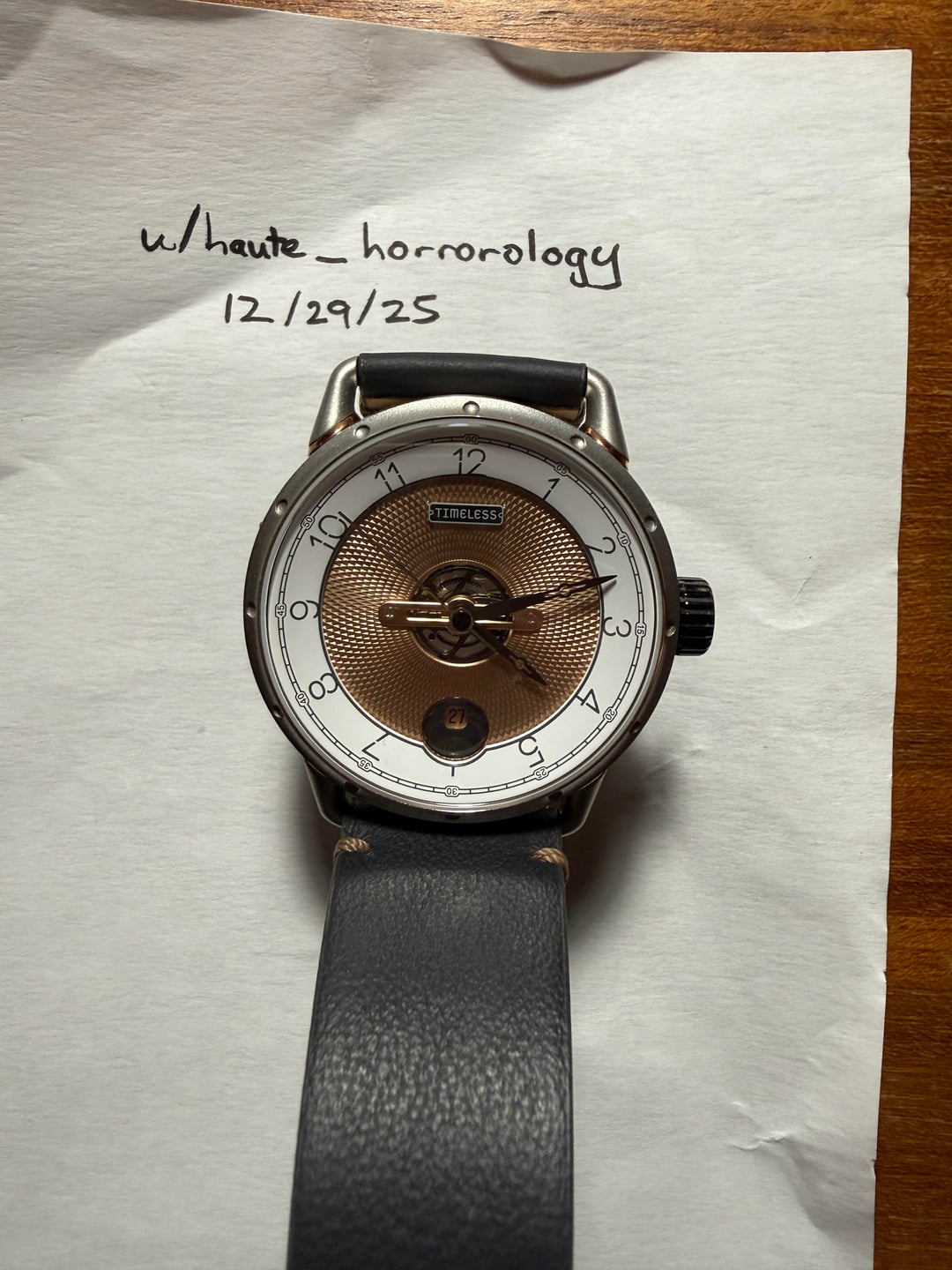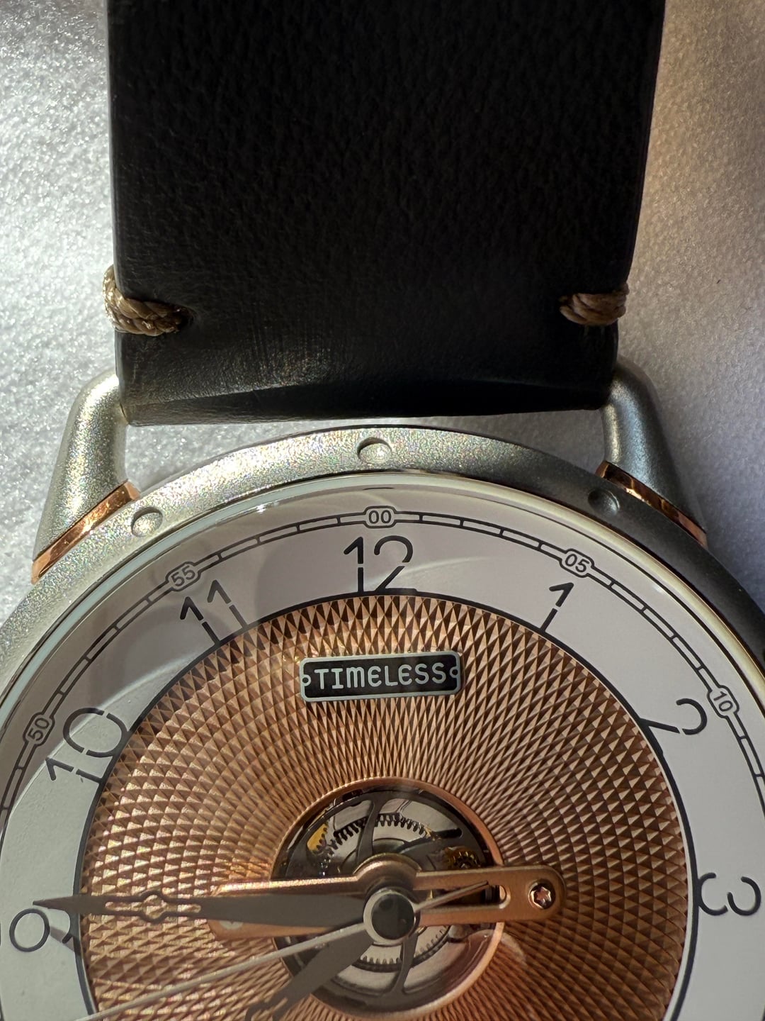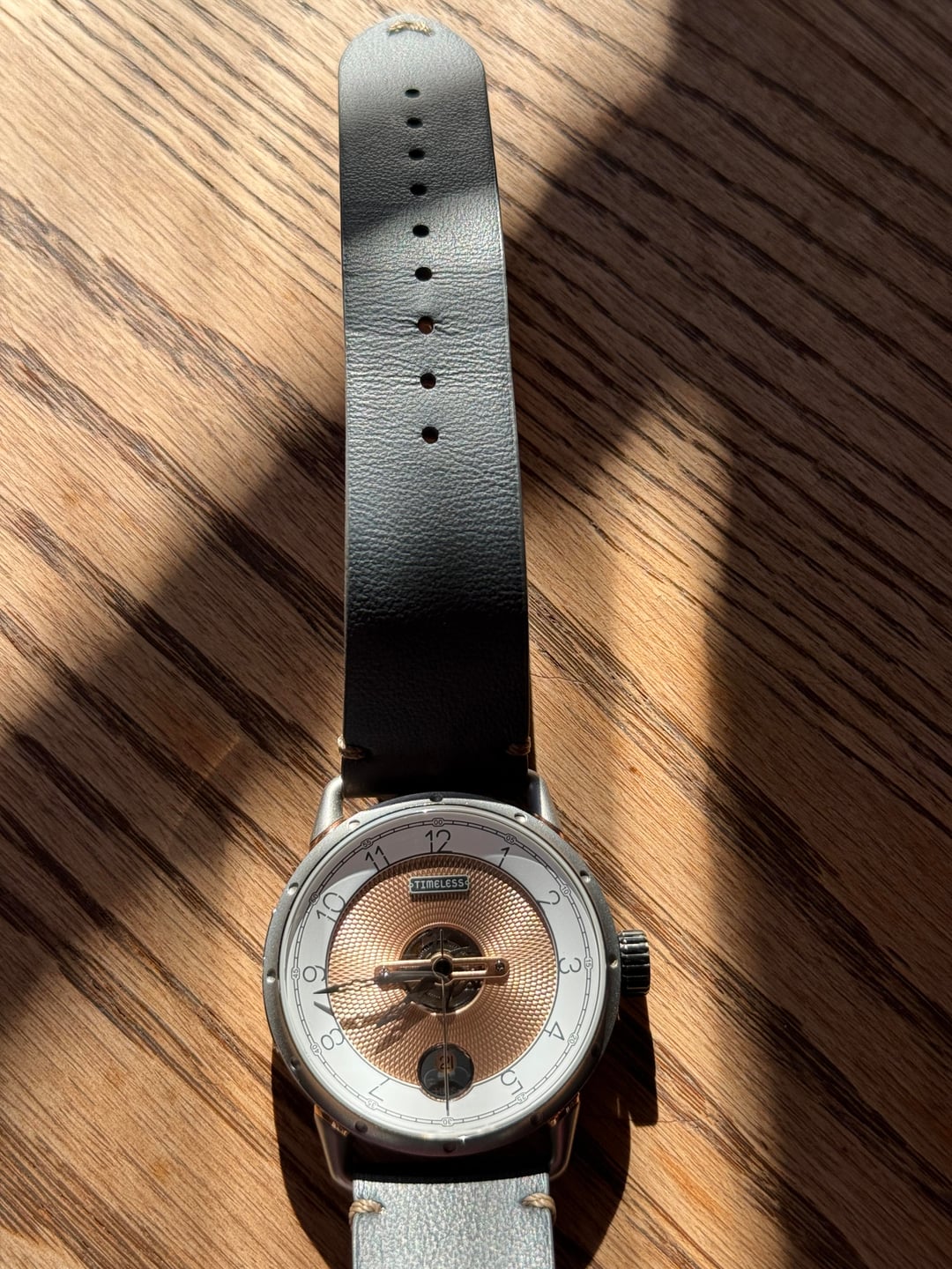 Up for sale is a real sleeper of a Swiss watch: The Timeless HMS003. Shortlisted for the GPHG Challenge Prize in 2023, this industrial-chic watch is full of delightful touches. The guilloché-style dial (it is CNC, not handmade) attracts, reflects, and plays with natural light in unexpected ways. The industrial lugs get a touch of whimsy with gold accents at the case. The PVD crown is nicely adorned with the Timeless logo (also accented with gold). The sloping outer/hour ring adds color and texture to the dial. The central skeletoning gives a glimpse at the STP 1-11 movement and allows you to watch the movement wind while setting it. The date window is nicely integrated and unobtrusive. Finally, the deployant clasp on the lush bracelet is well-engineered for a snug fit. Mael Oberkampf and his wonderful team have really thought of everything! This limited (1/40), numbered version was the very one nominated by the GPHG. It is unlikely you will see another one around. My watch is in excellent condition. With the exception of light wear on the deployant clasp and creasing to the strap, I cannot see a flaw. Price: **$1525**. I am happy to use PayPal (F&F preferred but G&S fine; buyer pays fees), Venmo, or Zelle. I would prefer CONUS but would be willing to discuss elsewhere. This is a particularly good deal for US buyers. The watch is nearly sold out and would cost about 25% more with the weak dollar and higher tariffs. I would prefer a US sale but feel free to reach out if you are somewhere else. Happy shopping!
