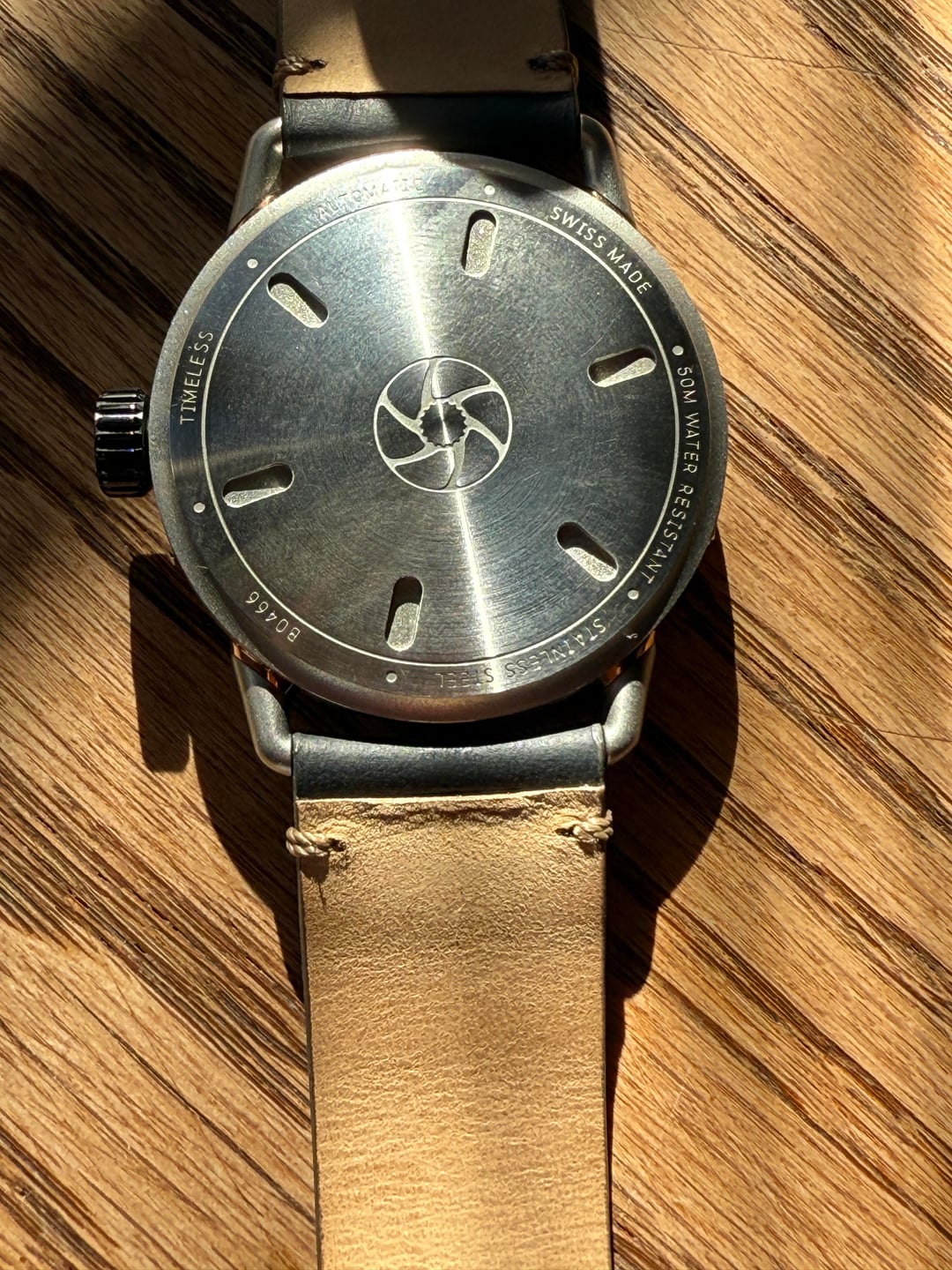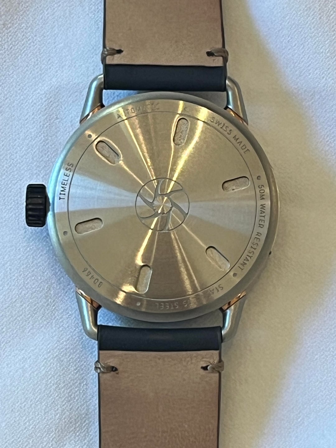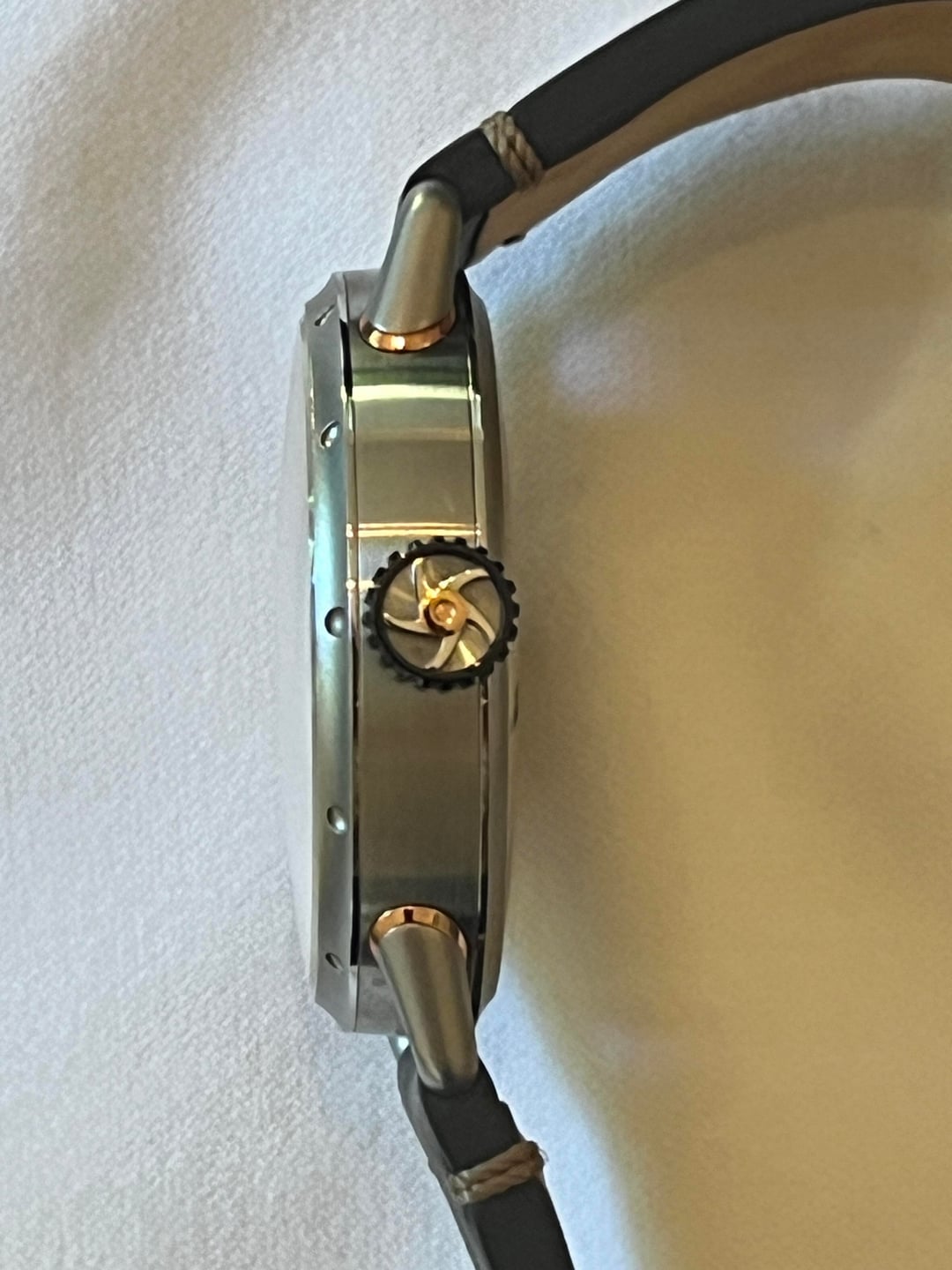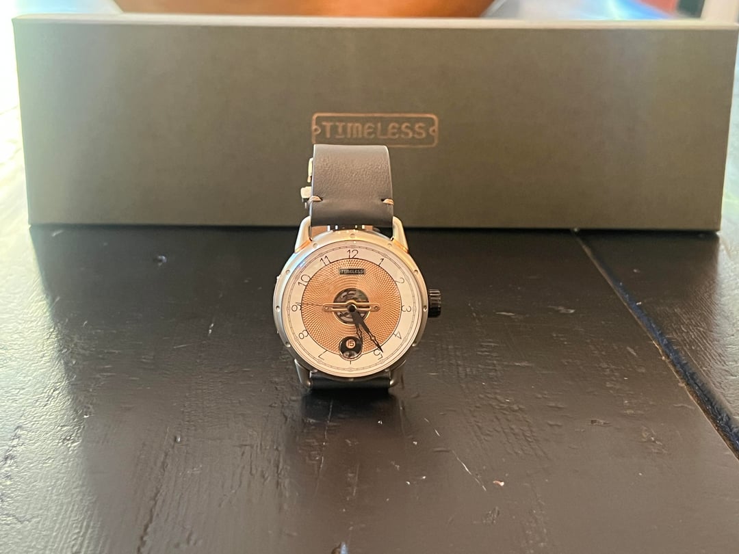 Up for sale is a real sleeper of a Swiss watch: The Timeless HMS003. Shortlisted for the GPHG Challenge Prize in 2023, this industrial-chic watch is full of delightful touches. The guilloché-style dial (it is CNC, not handmade) attracts, reflects, and plays with natural light in unexpected ways. The industrial lugs get a touch of whimsy with gold accents at the case. The PVD crown is nicely adorned with the Timeless logo (also accented with gold). The sloping outer/hour ring adds color and texture to the dial. The central skeletoning gives a glimpse at the STP 1-11 movement and allows you to watch the movement wind while setting it. The date window is nicely integrated and unobtrusive. Finally, the deployant clasp on the lush bracelet is well-engineered for a snug fit. Mael Oberkampf and his wonderful team have really thought of everything! This limited (1/40), numbered version was the very one nominated by the GPHG. It is unlikely you will see another one around. My watch is in excellent condition. With the exception of light wear on the deployant clasp and creasing to the strap, I cannot see a flaw. Price: **$1525**. I am happy to use PayPal (F&F preferred but G&S fine; buyer pays fees), Venmo, or Zelle. I would prefer CONUS but would be willing to discuss elsewhere. This is a particularly good deal for US buyers. The watch is nearly sold out and would cost about 25% more with the weak dollar and higher tariffs. I would prefer a US sale but feel free to reach out if you are somewhere else. Happy shopping!