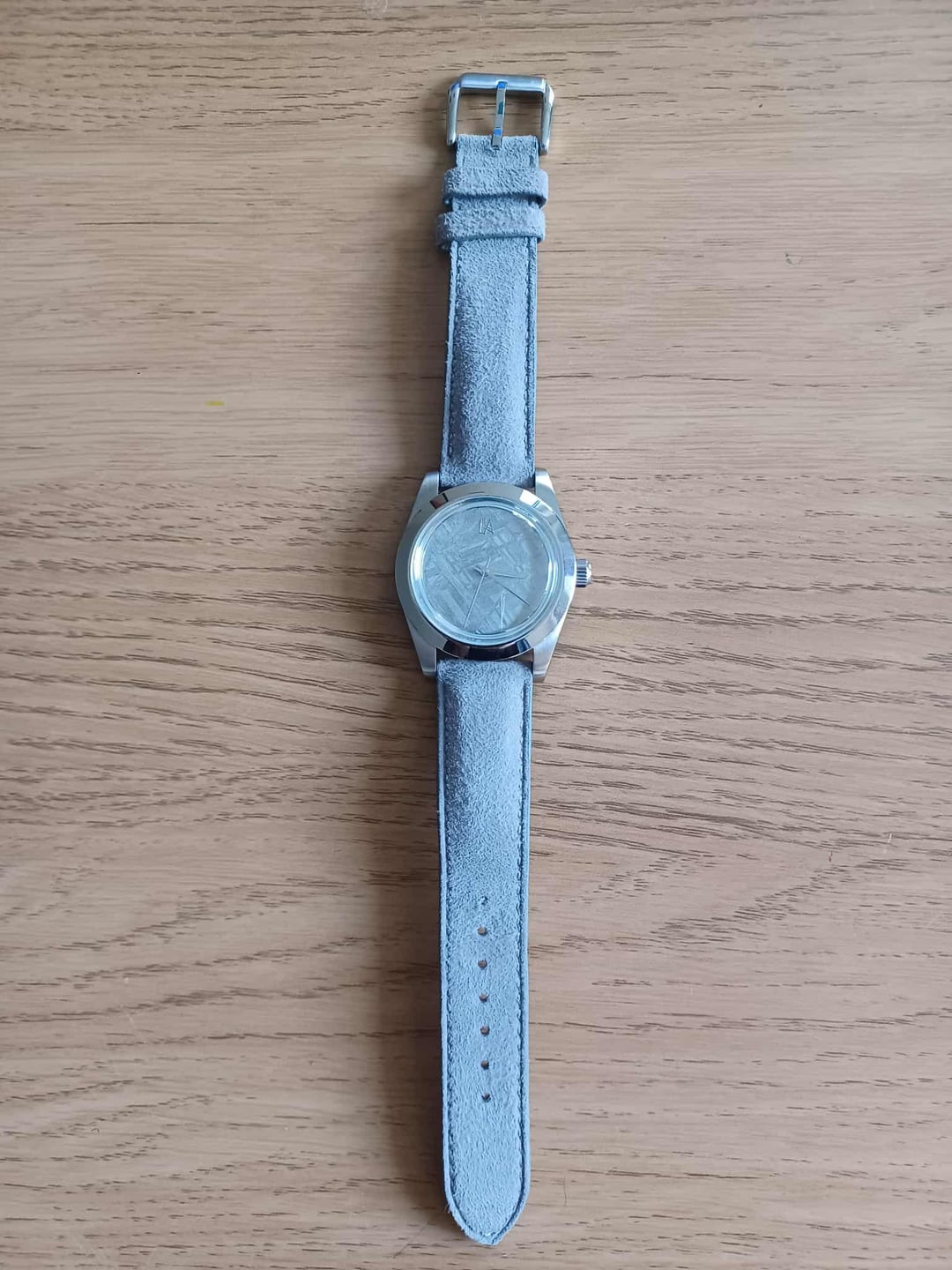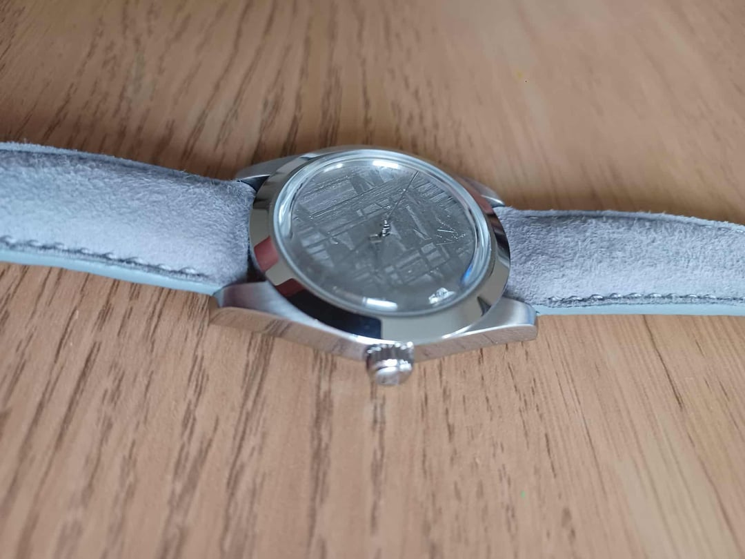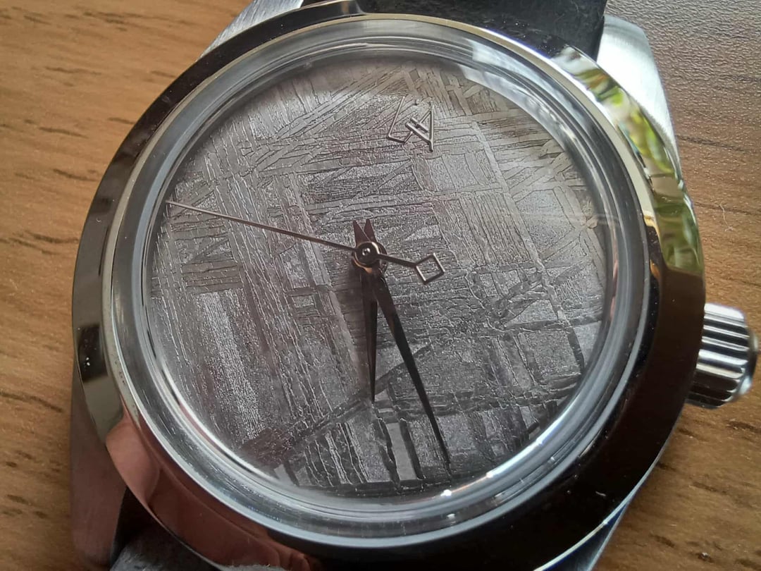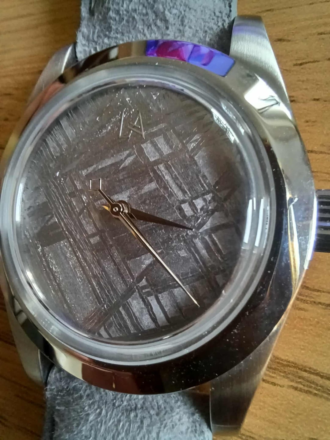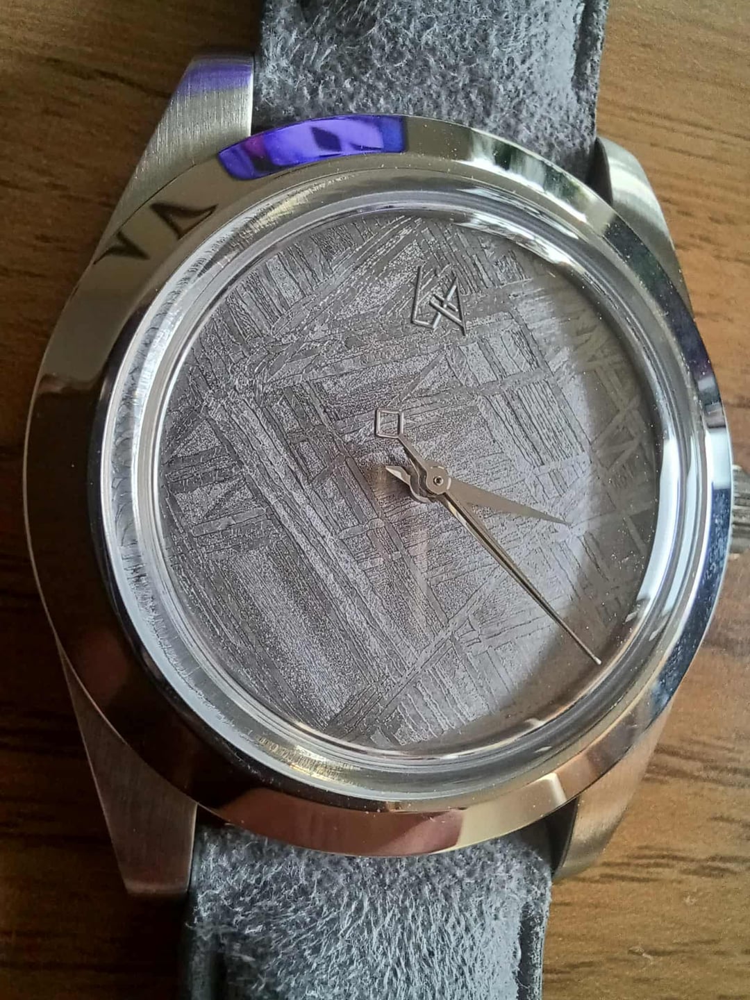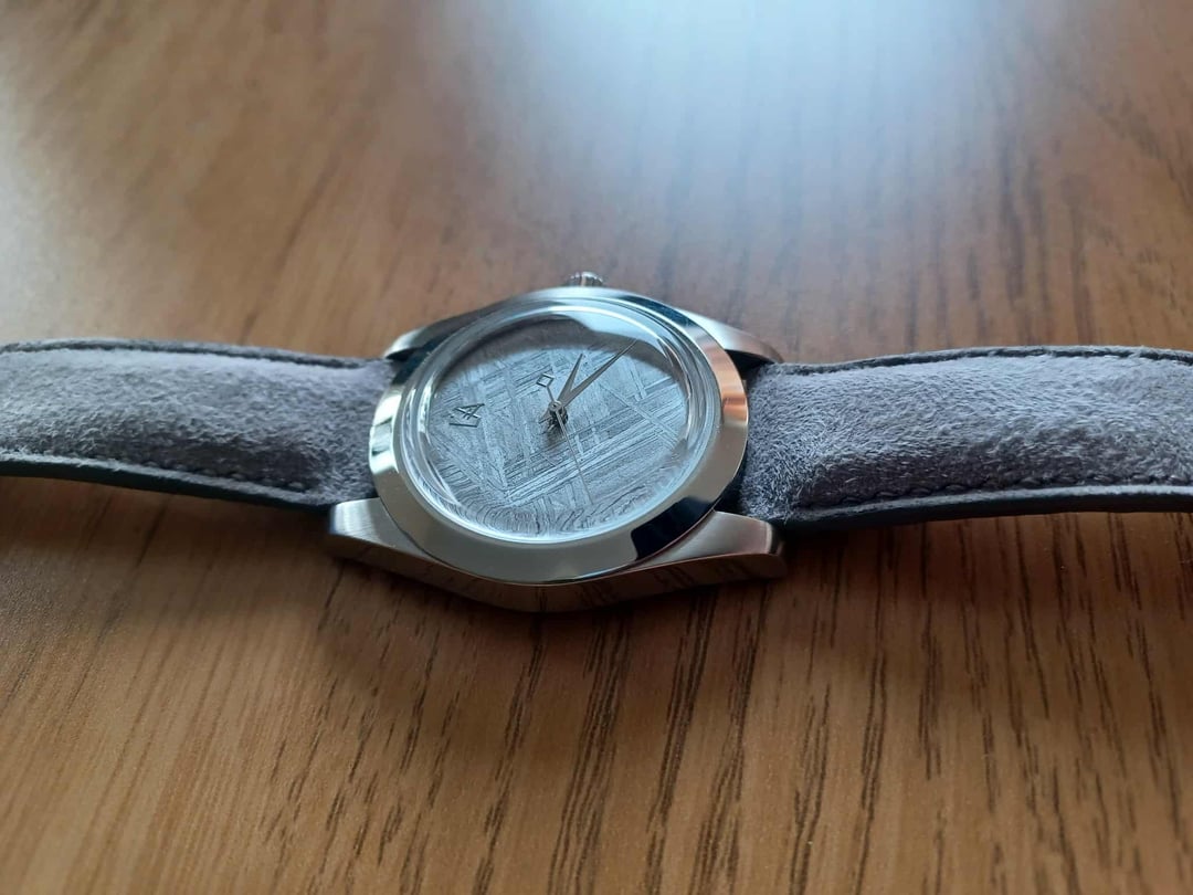 £430 + shipping Paypal payment UK located Muonionalusta meteorite 38mm ultra-thin stainless steel case with a 9mm profile Technical Specs: Movement: NH35 Automatic Case: Artisan Maison, 38mm, Ultra-Thin (9mm) Crystal: Domed Sapphire Dial: Genuine Muonionalusta Meteorite from Sweden Strap: Grey Suede Leather