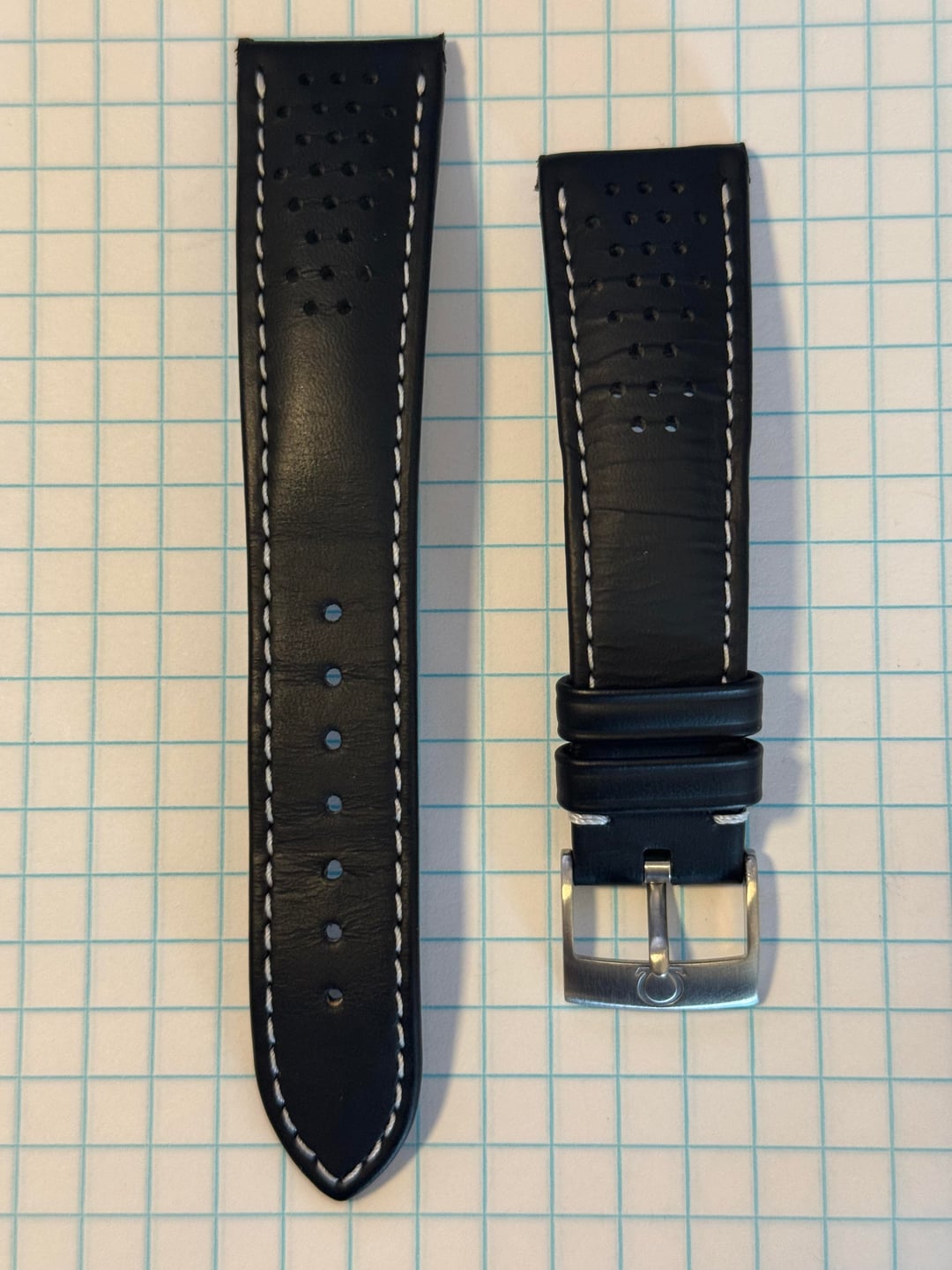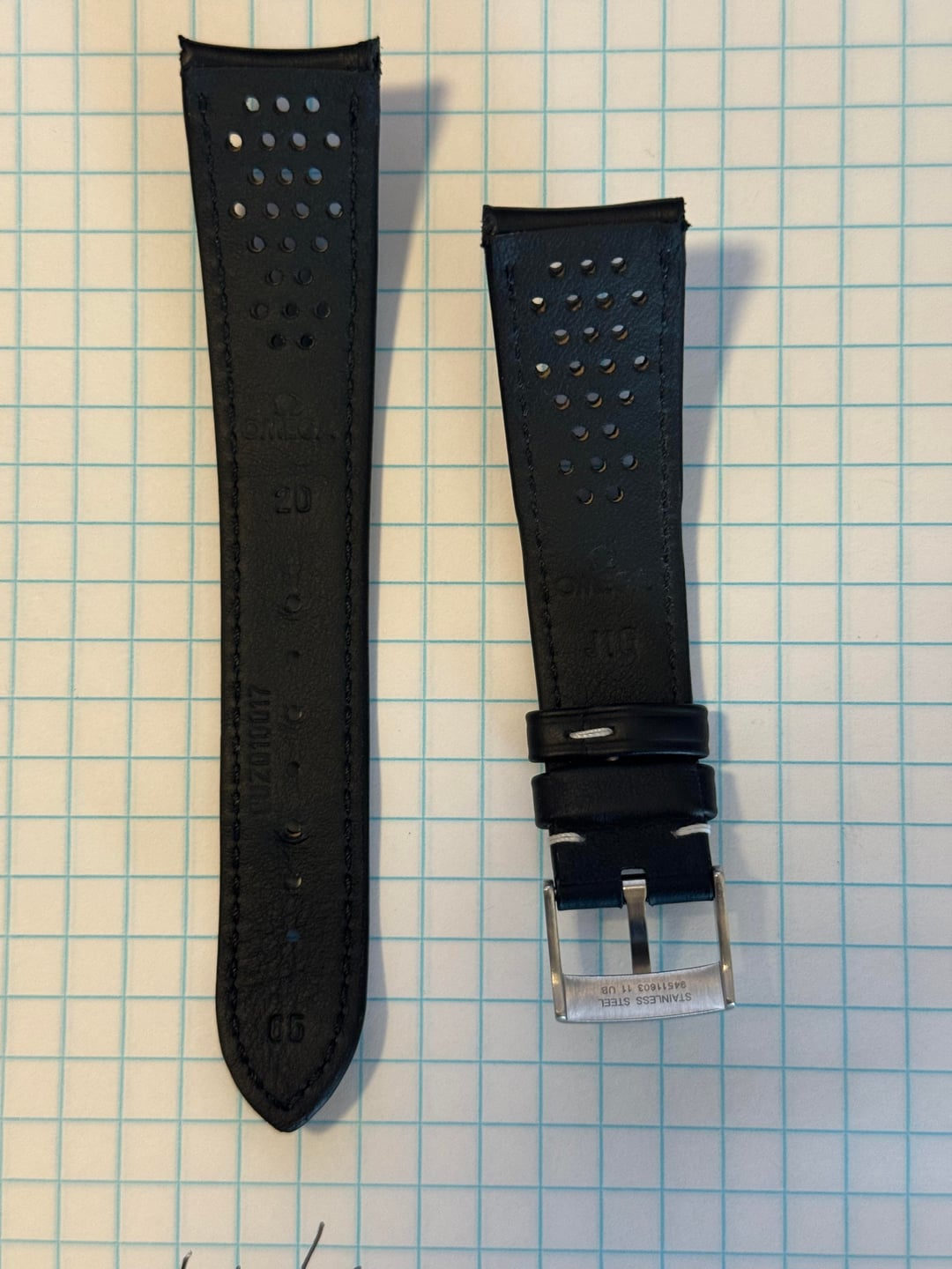 Omega OEM 20mm strap, reference 032CUZ010017, buckle reference 94511603 [https://www.omegawatches.com/en-us/omega-two-piece-strap-black-leather-strap-032cuz010017w](https://www.omegawatches.com/en-us/omega-two-piece-strap-black-leather-strap-032cuz010017w) Key Details: Width: 20mm at lugs (tapers to 16mm at buckle)[ ](https://www.swisswatchspares.com/product-page/copy-of-omega-rally-speedmaster-20mm-98000024-black-leather-deployment-strap?utm_source=chatgpt.com) Model: Black perforated leather strap for Omega Condition: Has been worn, but condition is good. Lots of life left for the next owner. Some fraying at the top of straps where spring bar passes through the holes. Not really noticeable during use. Please see pictures for condition. Price: $150 shipped (CONUS). **No trade please.** Accept paypal ff/venmo/zelle