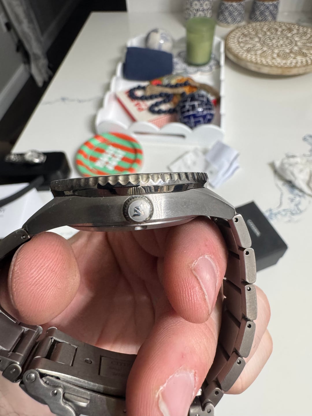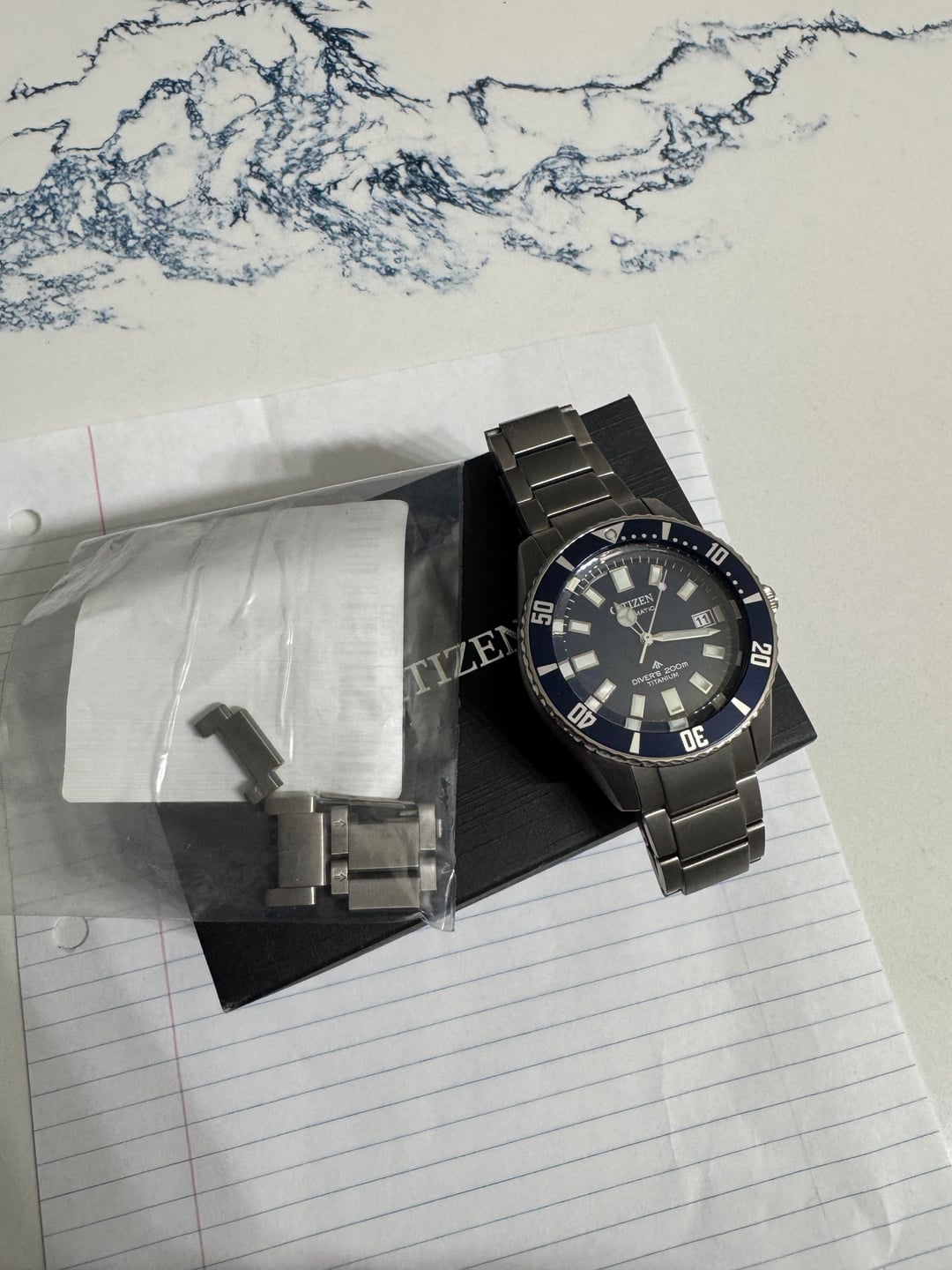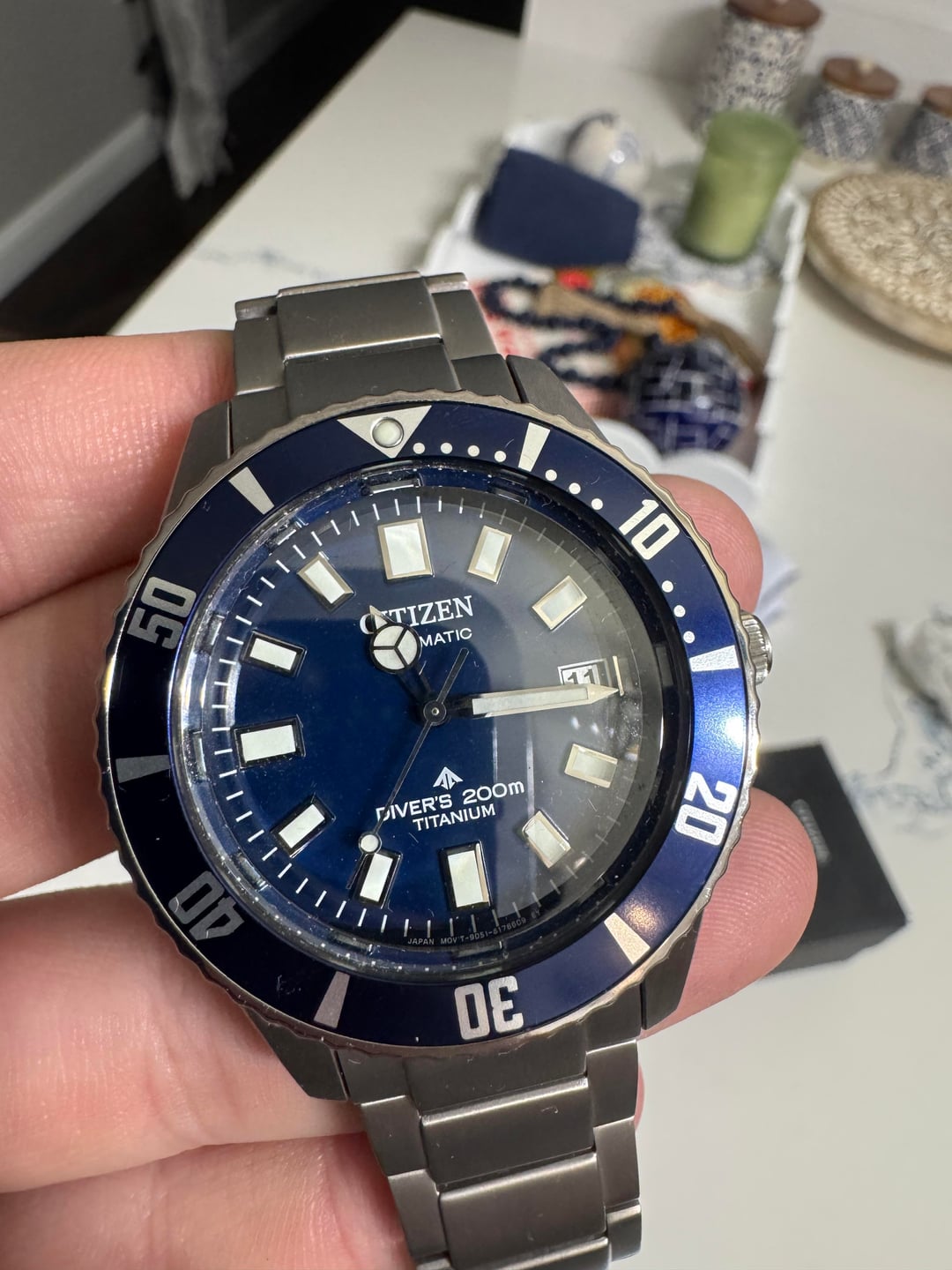 Up for sale is my Citizen Promaster Fujitsubo diver in Blue. Watch is good condition with some marks on some of the links and desk diver marks/scratches on the clasp. Watch is make of Titanium and is 41mm wide, has a LTL of 48.7mm, thickness of 12mm, has 200m of WR and is running the Miyota 9051. Great watch really light but need to let go to fund another purchase. Comes with box and links only, no papers. Not the original scuba tank box either this is how I got the watch. Asking $299 OBO fully shipped located in NJ. Can take Zelle, Venmo and PayPal If you have any questions feel free to ask!