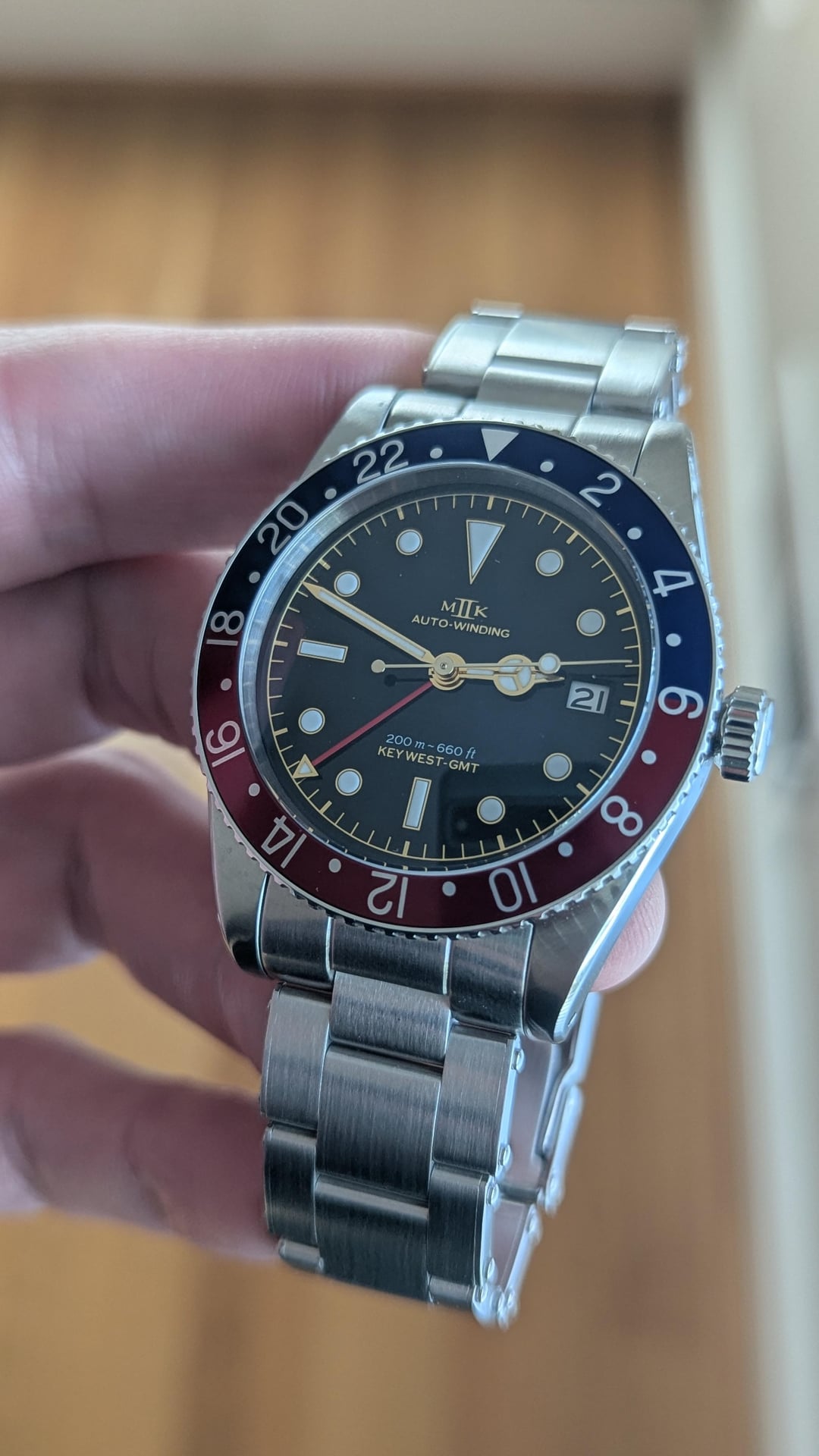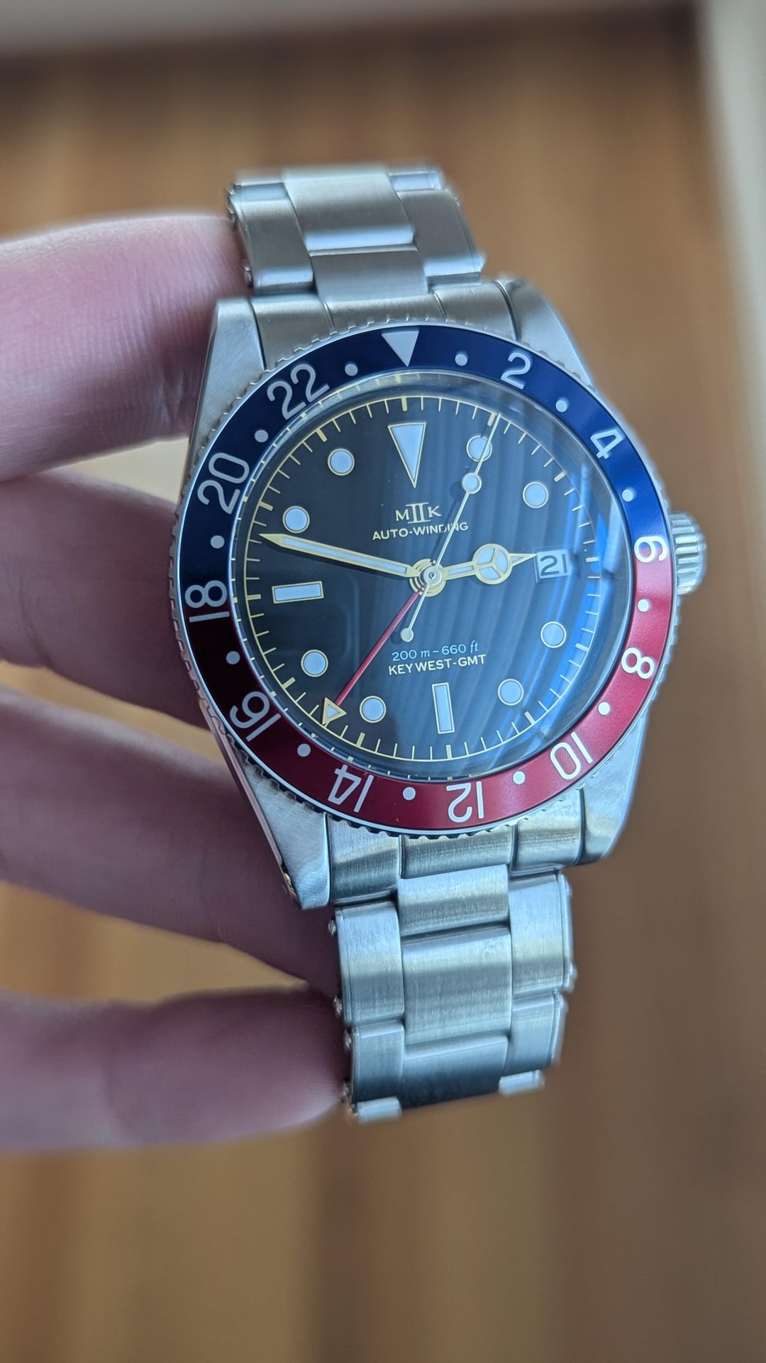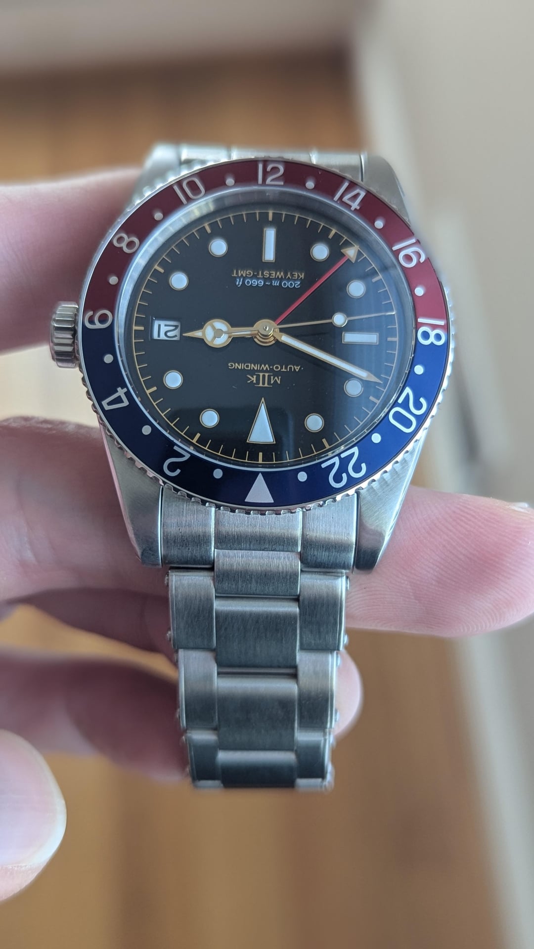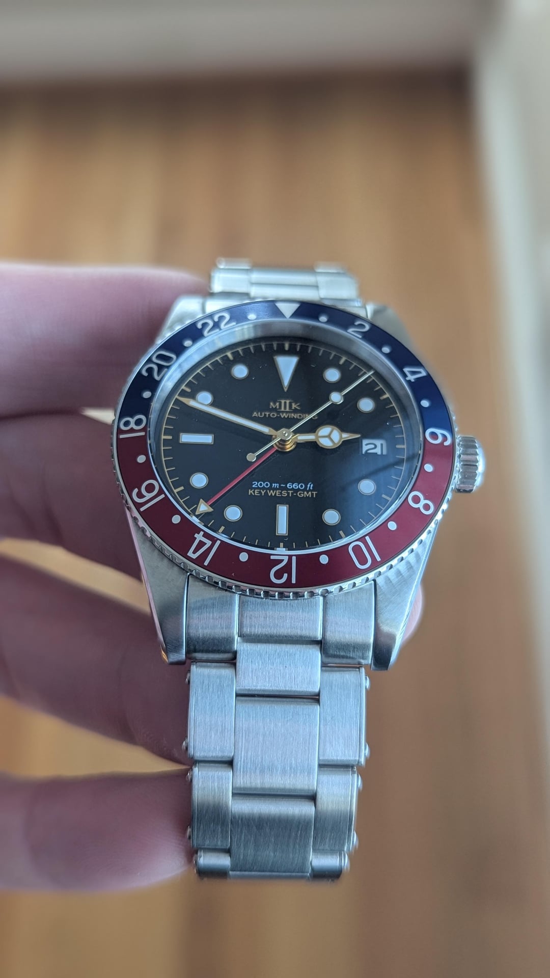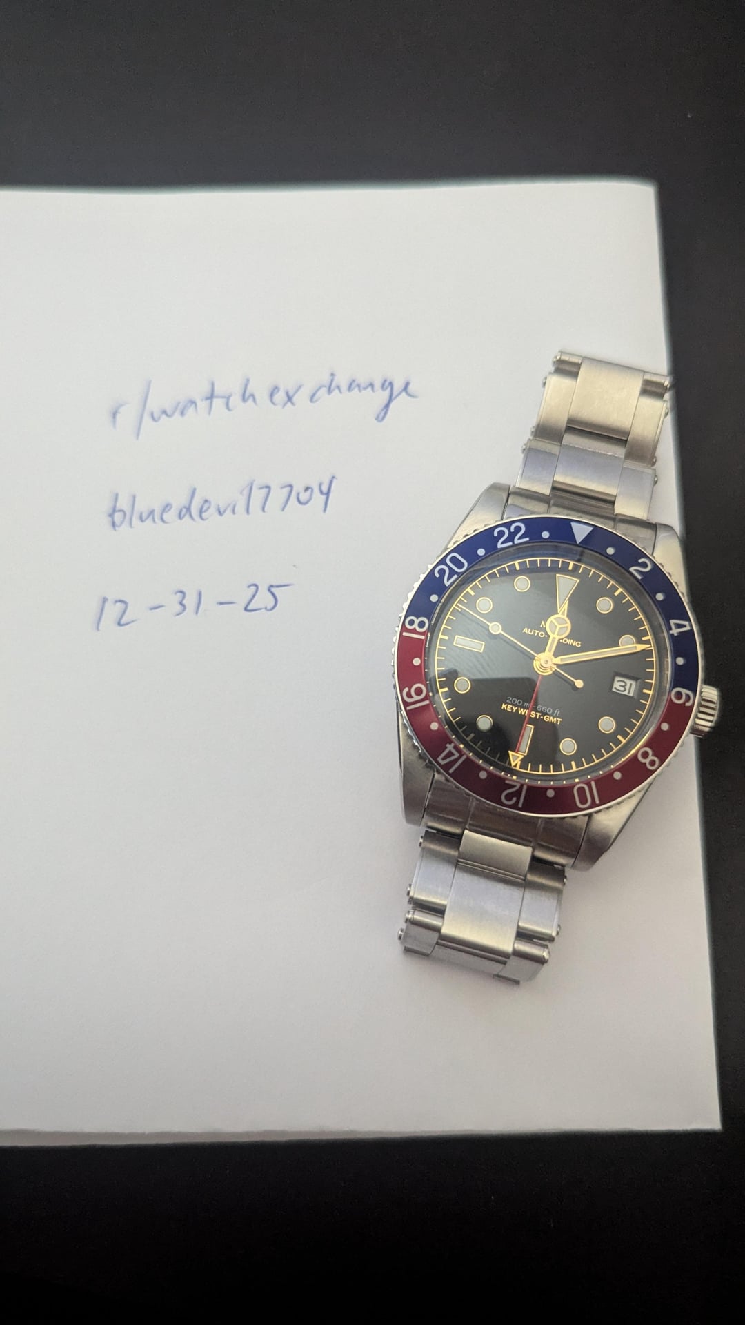 For sale is a MKII Key West GMT. This is the version with the Black Gilt Dial and pepsi (blue/red) bezel. If you're looking at this post, you're likely aware of the watch. This is one of the most faithful Rolex GMT Master homages. The build quality is impressive, and the gilt dial is simply breathtaking in person. Below are specifications from the MKII website: **Case Width**: 39.20 mm • **Case Length**: 47.96 mm • **Case Thickness**: 14.50 mm • **Lug Width**: 20.00 mm • **Weight**: 80 Grams • **Crystal**: Double domed sapphire crystal, with anti-reflective coating on interior surface only • **Luminous**: SuperLumiNova BGW9 • **Movement**: Swiss Made automatic 2893-2 by ETA SA • **Water Resistance**: 20 ATMs (200 meters) • **Case Finish**: Satin finished 316L stainless steel Condition: Other than some very minor swirls on the polished caseback, the watch, bezel, case, and bracelet are in mint/like new condition. Included is the watch, bracelet with all included links, MKII spring bar tool, box, and papers. Also included is an extra Erika's Originals Original MN navy blue and red strap that pairs great with the watch. **Price: $1725 NET via PayPal or Venmo. CONUS only. This will include expedited shipping. No trades at this time.** Album: [https://imgur.com/a/mDnApBI](https://imgur.com/a/mDnApBI) Timestamp: [https://imgur.com/a/XA4yIki](https://imgur.com/a/XA4yIki) I have plenty of references here as a seller and buyer. Thank you for looking and message me with any questions.