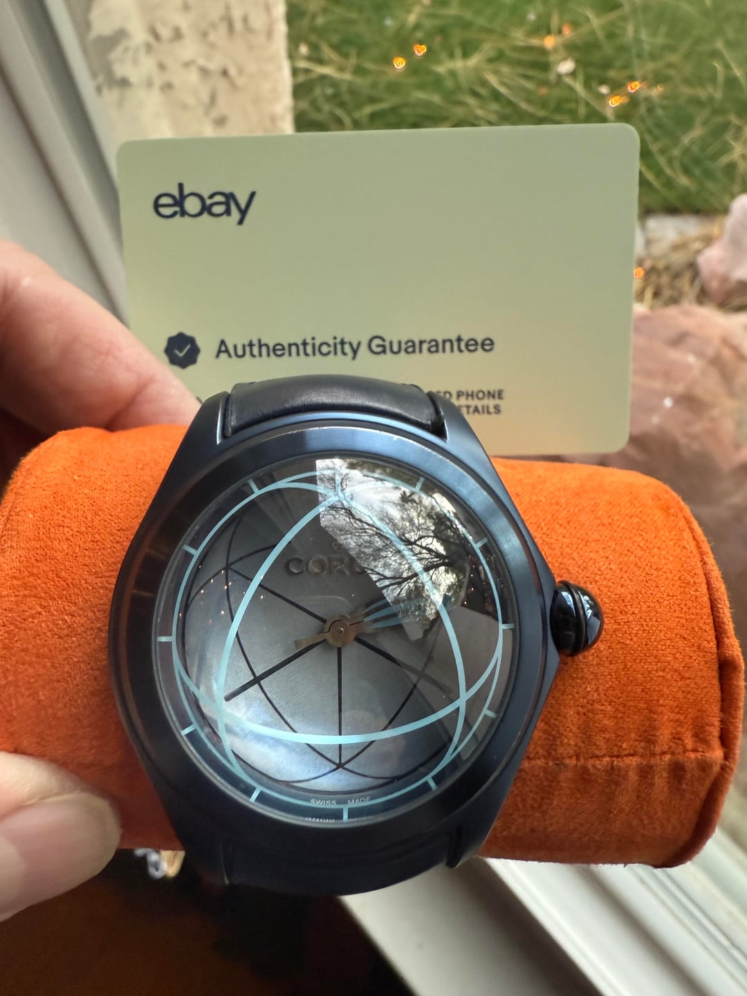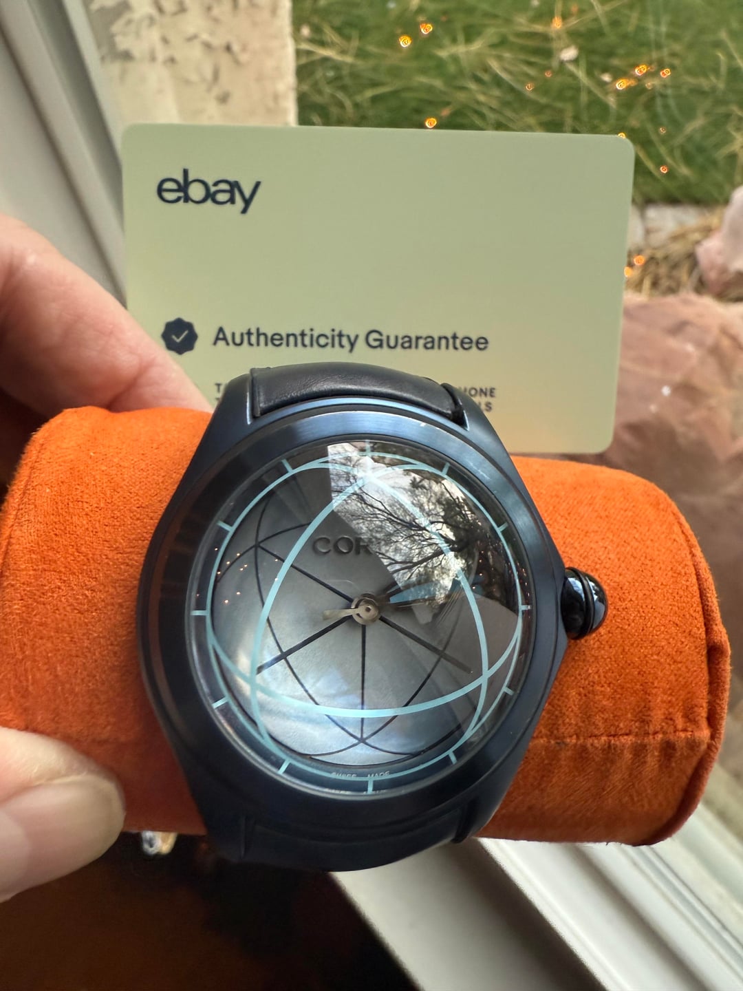 CORUM Bubble Optical Art $975 FSOT This Limited Edition Watch was designed by artist Nicolas Le Moigne it features 47mm caseand 24mm lugs. The is in good shape with some signs of wear, but nothing big. The watch comes with the OEM strap and an authentication card from eBay.