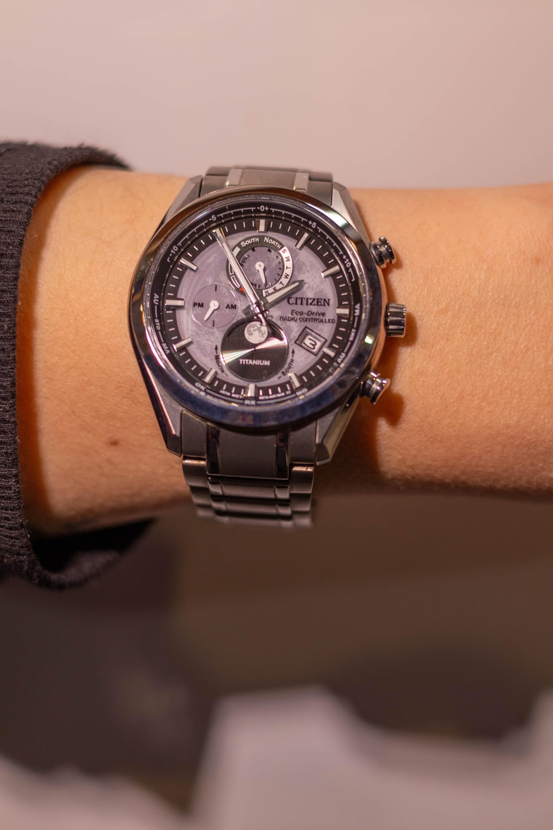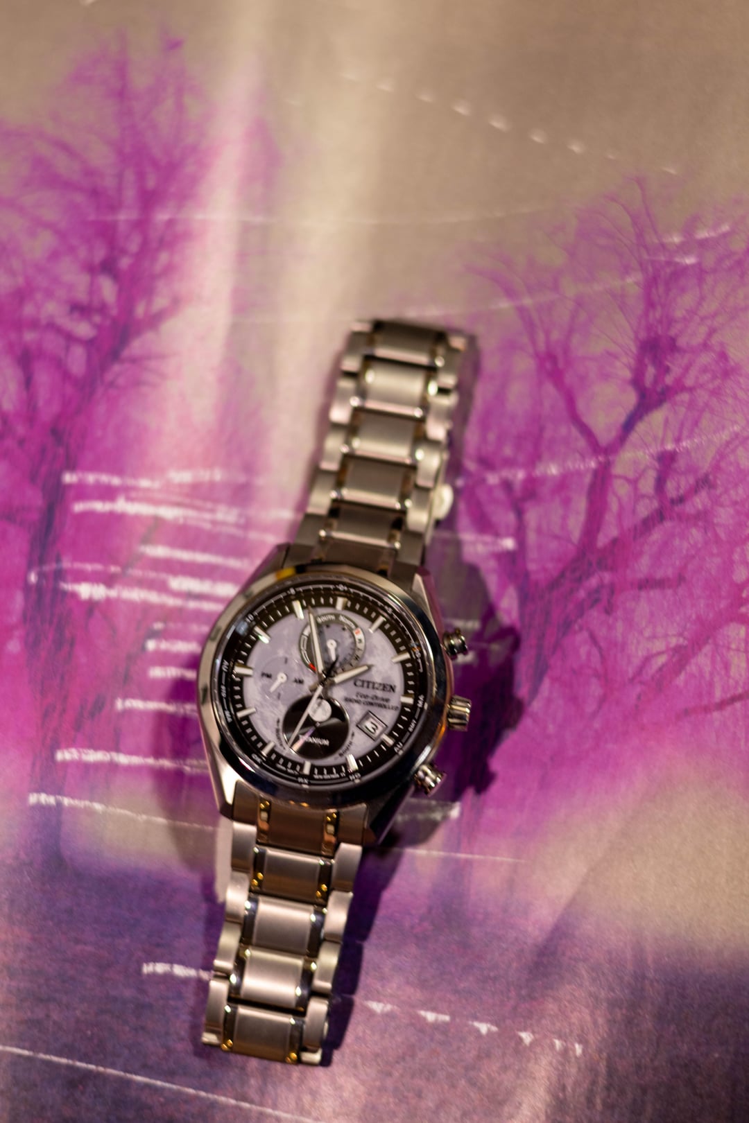 **Price:** $420 Shipped in the US. **Condition:** Excellent, probably the most practical complications on any watch in my collection but doesn't get worn enough. This piece uses Citizen's ECO Drive quartz solar charging, paired with radio-sync and GMT guide on the back, and a moonphase! Making for a watch that you can set it and forget it with insane time keeping accuracy. **Specs:** H874 Quartz Movement, 43mm Case, Water Resistant 10 Bar, Sapphire Crystal, watch is sized for a 7.25' wrist and includes 3 spare links.