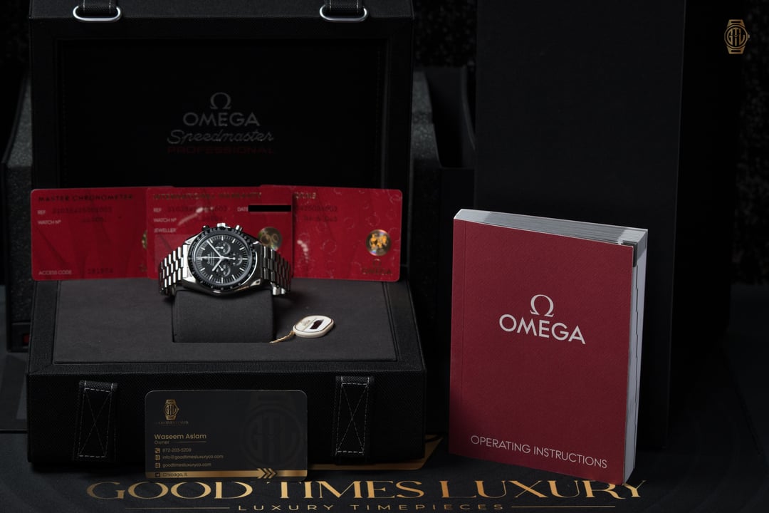 - Timestamp: https://imgur.com/a/MBt7wUt ******************************************************* * Reference: 310.30.42.50.01.002 * Condition: Excellent Pre-Owned Condition w/little to no signs of wear. * Box and Papers? Yes, Complete Set * Warranty Card Date: June 2025 (Under warranty until 2030) **Key Features:** * Case: 42 mm stainless steel case with asymmetrical lugs, true to the original Moonwatch design * Bezel: Black anodized aluminum bezel with tachymeter scale and “Dot Over Ninety” detail * Dial: Black stepped dial with applied Omega logo and vintage-inspired hour markers * Crystal: Sapphire crystal, faithful to the NASA-qualified Moonwatch specification * Movement: Omega Co-Axial Master Chronometer Calibre 3861, manual-winding * Power Reserve: Approximately 50 hours * Escapement: Co-Axial escapement for long-term precision and reduced friction * Accuracy: Master Chronometer certified by METAS, resistant to magnetic fields up to 15,000 gauss * Caseback: Sapphire case back showcasing the intricate details of the movement * Bracelet: Stainless steel bracelet with five-arched links, redesigned for improved comfort * Water Resistance: 50 meters / 167 feet * Heritage: Direct descendant of the Speedmaster worn during all six Apollo lunar landings ******************************************************* 💳 Payment options: * All Credit Cards accepted * Bank Wire * Zelle * Crypto For your convenience, you may divide payments into various forms of payment. ******************************************************* **💰Bank Wire: $7,995, CC: $8,315 includes fully insured UPS or FedEx Shipping** ******************************************************* 📍 Location: Chicago, IL 🚀 Shipping: Every package is insured for its full value and shipped via FedEx Overnight service to your nearest FedEx Office or Delivered straight to your door via UPS Next Day service. ********************************************************** 📞 Call/Text/Whatsapp 872-203-5209 ******************************************************* 📸 Instagram: @goodtimesluxury ⭐️ Check Reviews on Google and Trust Pilot 🌐 Google us: Good Times Luxury Chicago 👨🏻💻 Website: goodtimesluxuryco dot com About me 🙋🏻♂️: My name is Waseem Aslam, Owner of Good Times Luxury. Please don’t hesitate to contact me with any questions. I’m happy to jump on a facetime call to show the watch and answer any questions you may have until you’re confident in your purchase. Talk soon, thanks! *******************************************************