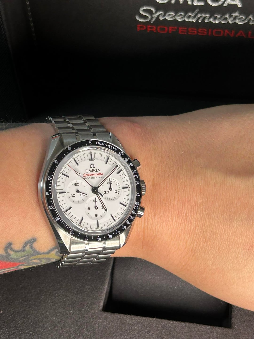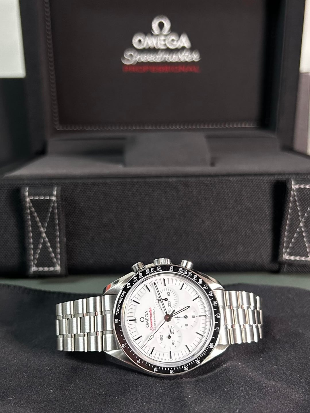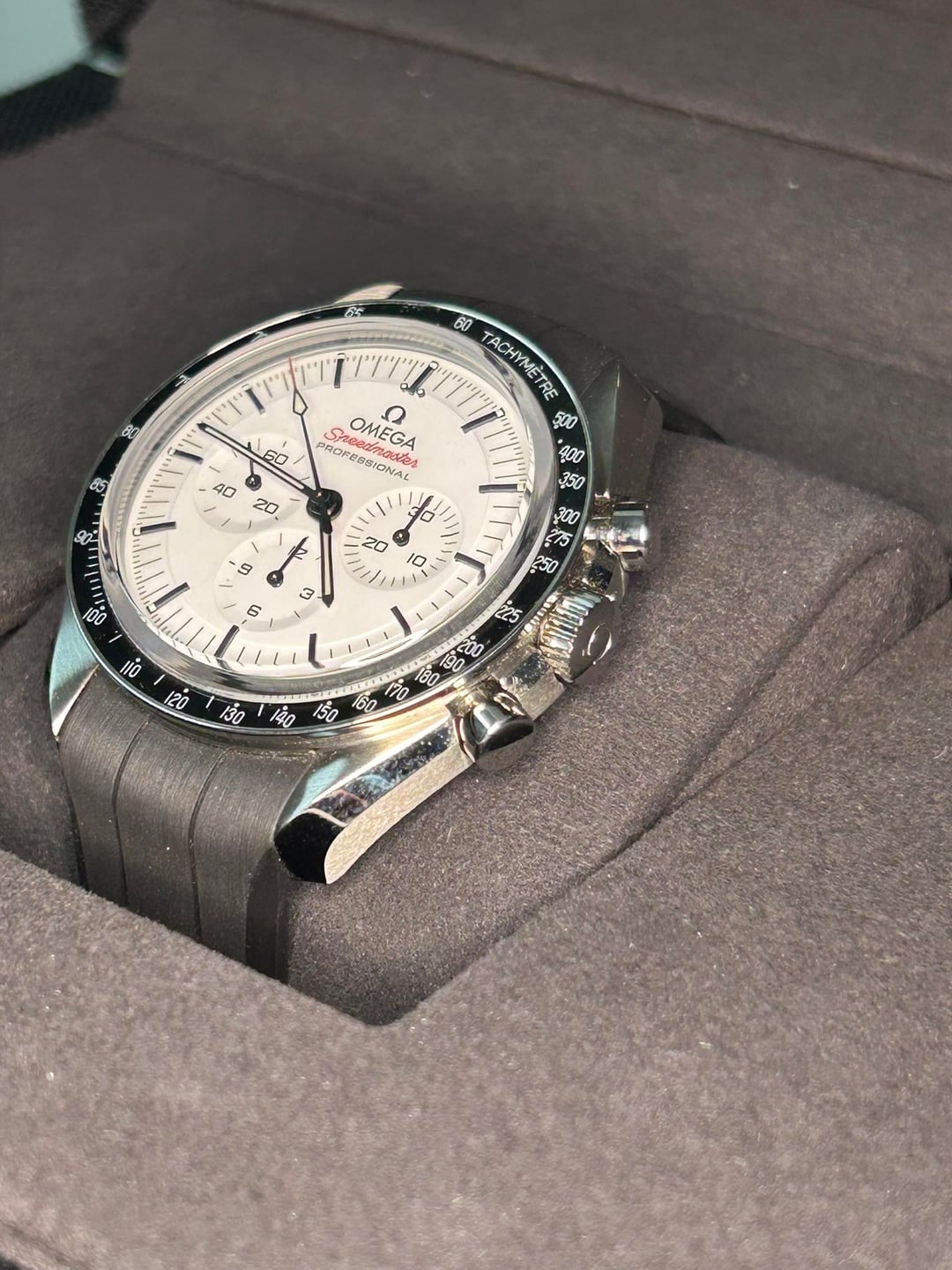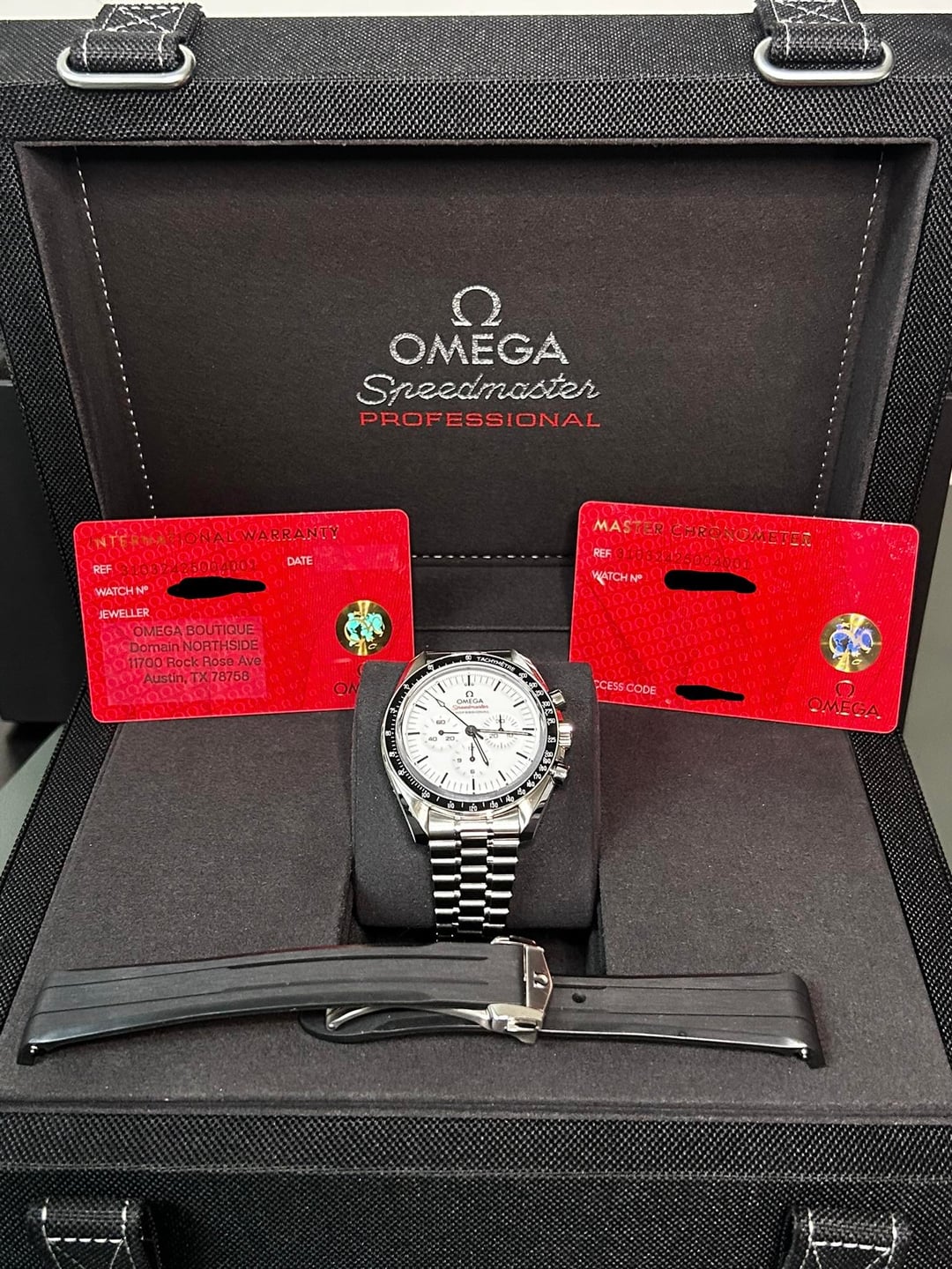 **Up for sale is my Omega Speedmaster Moonwatch Professional with the stunning white dial**, reference 310.30.42.50.04.001. This is the modern manual-wind Speedmaster with sapphire crystal front and back, powered by the OMEGA Co-Axial Master Chronometer Caliber 3861. **About This Watch:** Released in March 2024, this is the first regular production white dial Speedmaster Moonwatch Professional. It offers exceptional legibility and a fresh take on the iconic Moonwatch design. **Specifications:** * **Reference:** 310.30.42.50.04.001 * **Case Size:** 42mm diameter x 13.2mm height * **Case Material:** Stainless steel with brushed and polished finishes * **Movement:** OMEGA Co-Axial Master Chronometer Calibre (manual-wind) * **Power Reserve:** 50 hours * **Dial:** White lacquered with applied logo and indices * **Crystal:** Sapphire front and exhibition caseback ("sapphire sandwich") * **Water Resistance:** 50 meters * **Bezel:** Black aluminum tachymeter insert * **Bracelet:** Stainless steel with brushed and polished links, folding clasp * **MSRP:** $9,100 (watch) + $620 (OEM rubber strap with deployment) * **Price:** **$7,400** **Condition:** Excellent overall condition with minimal wear. The watch has been well cared for and shows very light signs of use. Crystal is clean, case and bracelet show minimal desk-diving marks. Movement running strong and keeping excellent time. Purchased brand new in November 2025 from the Omega Boutique in Austin, TX. **What's Included:** * Full kit with inner and outer boxes * Warranty card dated November 2025 and all papers * Original stainless steel bracelet (sized, extra links included) * Omega OEM rubber strap with deployment buckle (retails $600 separately) * Uncle Seiko 1.5 link (for when you want the perfect fit) * Manuals and booklets * Everything except the pictogram card (Omega no longer includes those, for environmental reasons) **Price:** **$7,400** shipped CONUS via FedEx fully insured **Payment:** Bank wire, Zelle, or PayPal Friends & Family (G&S +3% for established members with strong references) **Trades:** Not at this time **Shipping:** CONUS only from Florida, fully insured, direct to FedEx store with signature required for pickup. **Timestamp & Photos:** [https://imgur.com/a/UiP3Hol](https://imgur.com/a/UiP3Hol) This is an incredible opportunity to own one of the most iconic watches ever made in the unique white dial configuration. With over $9,600 in retail value between the watch and OEM rubber strap, plus the bonus Uncle Seiko link, you're getting serious value here. Two completely different looks for one watch – it's like having a watch collection that fits in one box. Happy to answer any questions, provide additional photos, and hop on FaceTime! Thanks for looking!