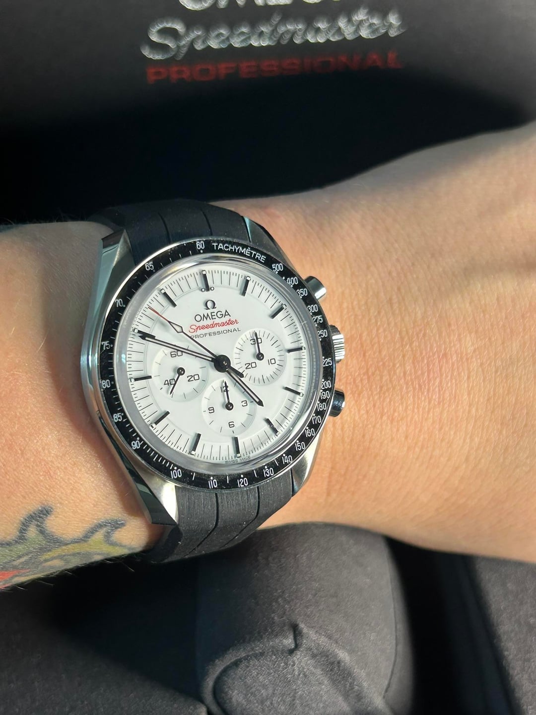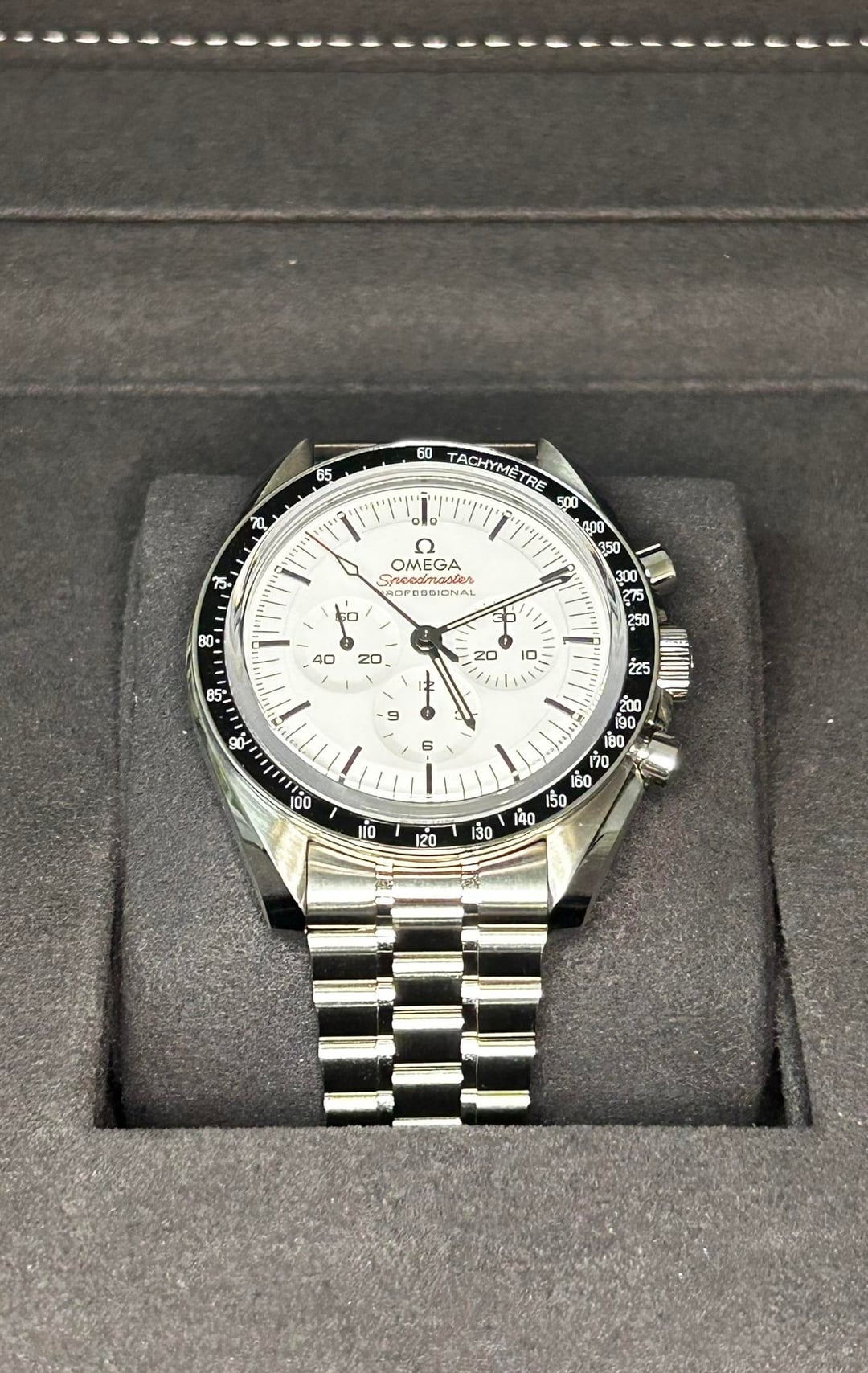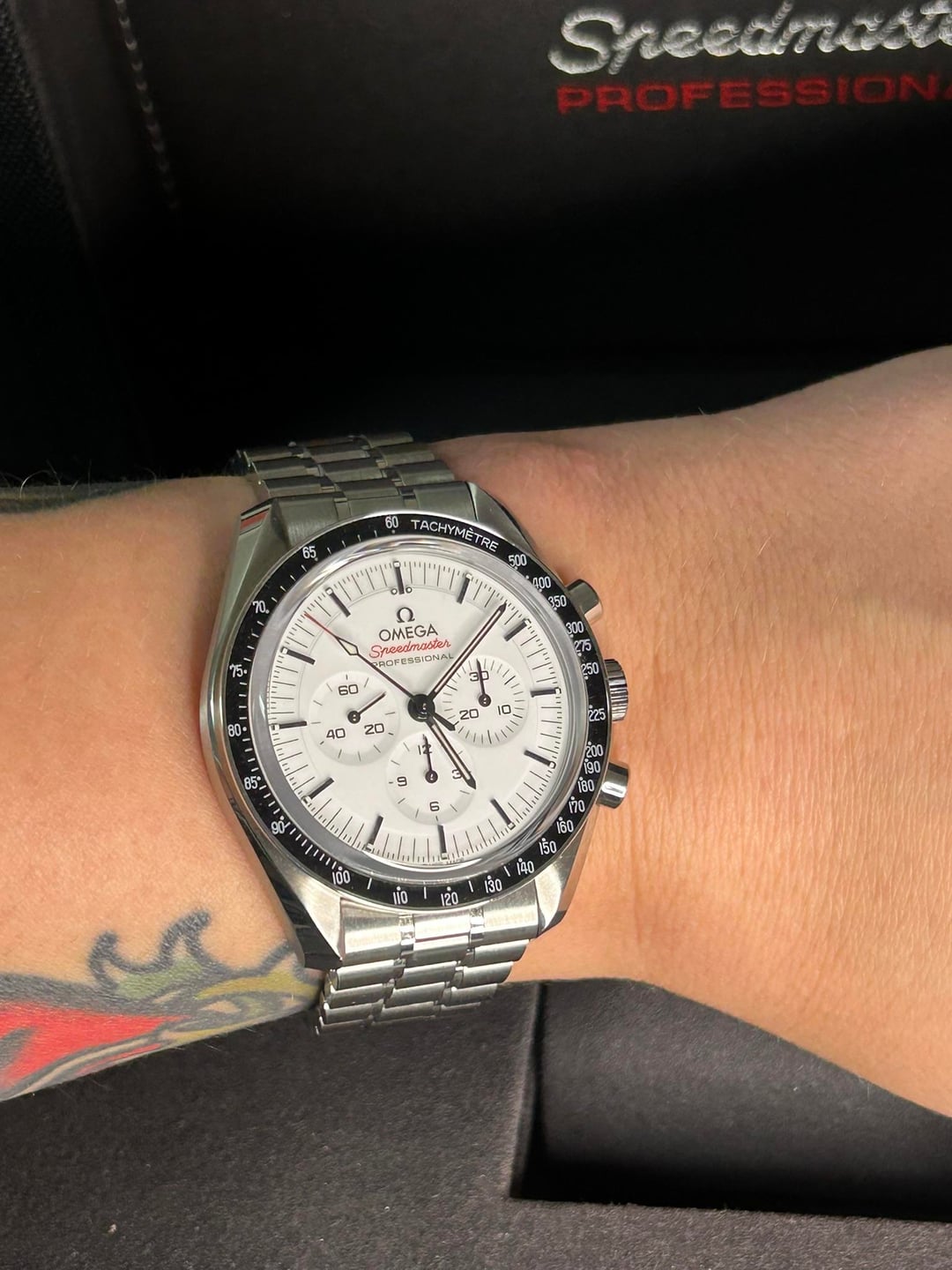 **Up for sale is my Omega Speedmaster Moonwatch Professional with the stunning white dial**, reference 310.30.42.50.04.001. This is the modern manual-wind Speedmaster with sapphire crystal front and back, powered by the OMEGA Co-Axial Master Chronometer Caliber 3861. **About This Watch:** Released in March 2024, this is the first regular production white dial Speedmaster Moonwatch Professional. It offers exceptional legibility and a fresh take on the iconic Moonwatch design. **Specifications:** * **Reference:** 310.30.42.50.04.001 * **Case Size:** 42mm diameter x 13.2mm height * **Case Material:** Stainless steel with brushed and polished finishes * **Movement:** OMEGA Co-Axial Master Chronometer Calibre (manual-wind) * **Power Reserve:** 50 hours * **Dial:** White lacquered with applied logo and indices * **Crystal:** Sapphire front and exhibition caseback ("sapphire sandwich") * **Water Resistance:** 50 meters * **Bezel:** Black aluminum tachymeter insert * **Bracelet:** Stainless steel with brushed and polished links, folding clasp * **MSRP:** $9,100 (watch) + $620 (OEM rubber strap with deployment) * **Price:** **$7,400** **Condition:** Excellent overall condition with minimal wear. The watch has been well cared for and shows very light signs of use. Crystal is clean, case and bracelet show minimal desk-diving marks. Movement running strong and keeping excellent time. Purchased brand new in November 2025 from the Omega Boutique in Austin, TX. **What's Included:** * Full kit with inner and outer boxes * Warranty card dated November 2025 and all papers * Original stainless steel bracelet (sized, extra links included) * Omega OEM rubber strap with deployment buckle (retails $600 separately) * Uncle Seiko 1.5 link (for when you want the perfect fit) * Manuals and booklets * Everything except the pictogram card (Omega no longer includes those, for environmental reasons) **Price:** **$7,400** shipped CONUS via FedEx fully insured **Payment:** Bank wire, Zelle, or PayPal Friends & Family (G&S +3% for established members with strong references) **Trades:** Not at this time **Shipping:** CONUS only from Florida, fully insured, direct to FedEx store with signature required for pickup. **Timestamp & Photos:** [https://imgur.com/a/UiP3Hol](https://imgur.com/a/UiP3Hol) This is an incredible opportunity to own one of the most iconic watches ever made in the unique white dial configuration. With over $9,600 in retail value between the watch and OEM rubber strap, plus the bonus Uncle Seiko link, you're getting serious value here. Two completely different looks for one watch – it's like having a watch collection that fits in one box. Happy to answer any questions, provide additional photos, and hop on FaceTime! Thanks for looking!