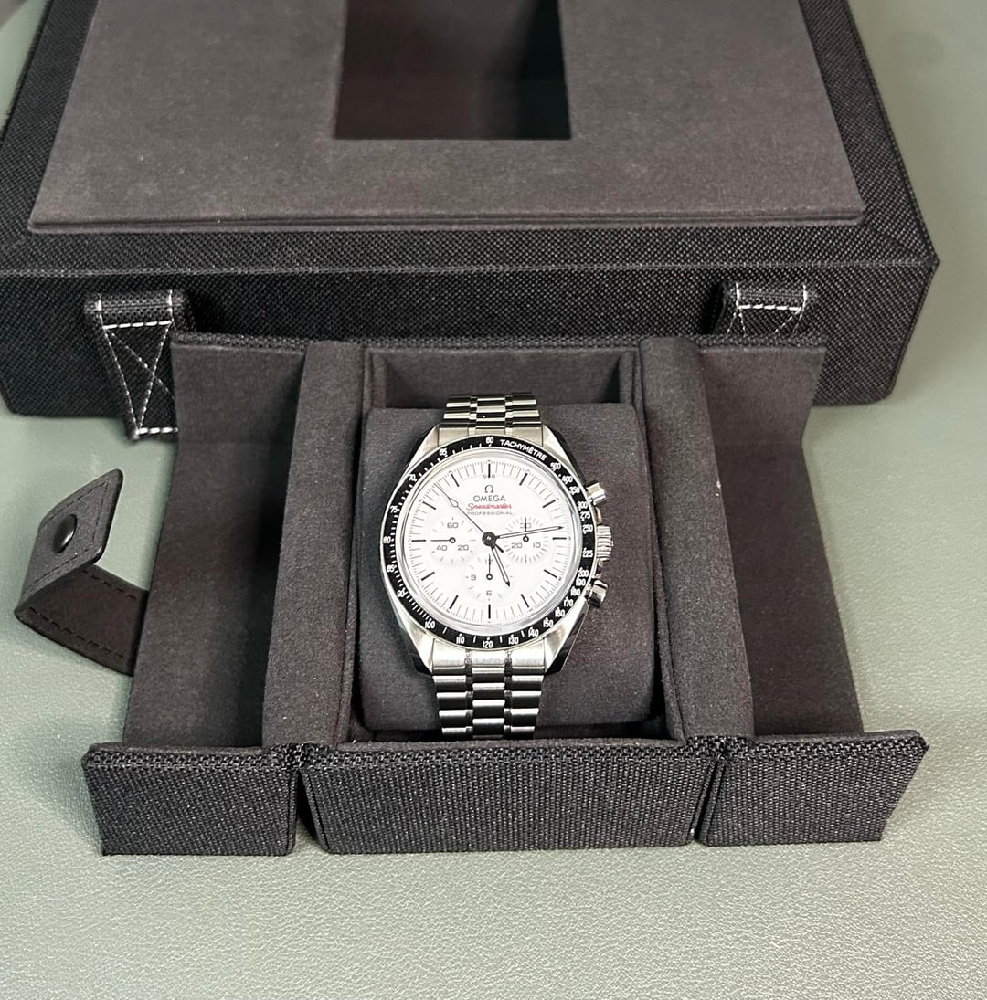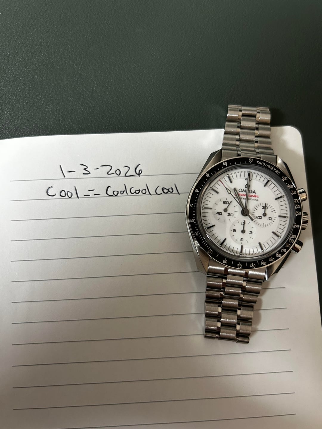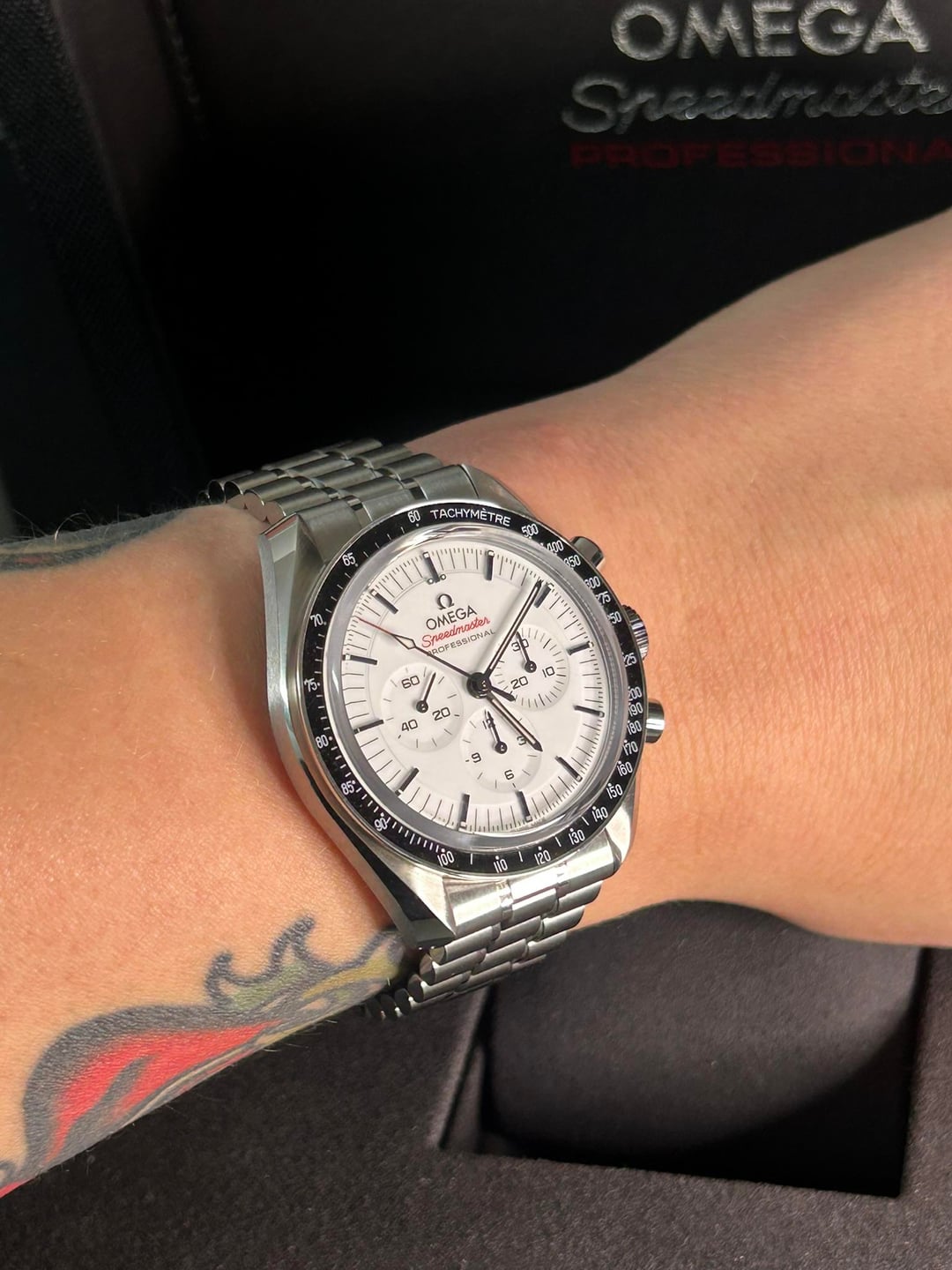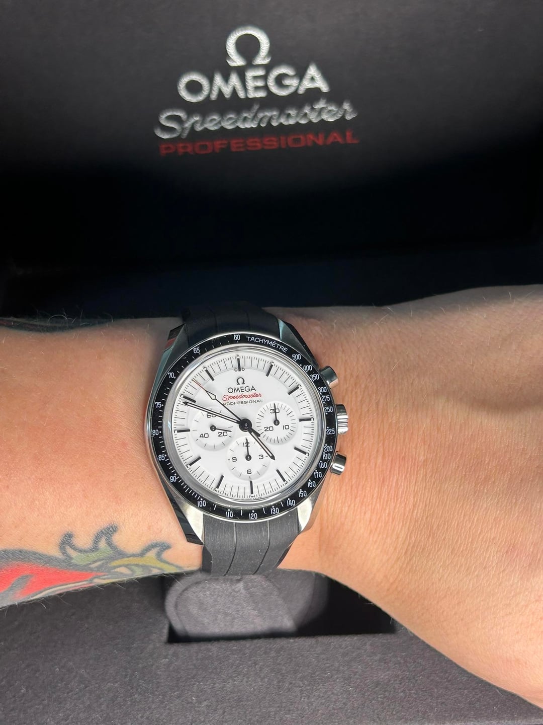 **Up for sale is my Omega Speedmaster Moonwatch Professional with the stunning white dial**, reference 310.30.42.50.04.001. This is the modern manual-wind Speedmaster with sapphire crystal front and back, powered by the OMEGA Co-Axial Master Chronometer Caliber 3861. **About This Watch:** Released in March 2024, this is the first regular production white dial Speedmaster Moonwatch Professional. It offers exceptional legibility and a fresh take on the iconic Moonwatch design. **Specifications:** * **Reference:** 310.30.42.50.04.001 * **Case Size:** 42mm diameter x 13.2mm height * **Case Material:** Stainless steel with brushed and polished finishes * **Movement:** OMEGA Co-Axial Master Chronometer Calibre (manual-wind) * **Power Reserve:** 50 hours * **Dial:** White lacquered with applied logo and indices * **Crystal:** Sapphire front and exhibition caseback ("sapphire sandwich") * **Water Resistance:** 50 meters * **Bezel:** Black aluminum tachymeter insert * **Bracelet:** Stainless steel with brushed and polished links, folding clasp * **MSRP:** $9,100 (watch) + $620 (OEM rubber strap with deployment) * **Price:** **$7,400** **Condition:** Excellent overall condition with minimal wear. The watch has been well cared for and shows very light signs of use. Crystal is clean, case and bracelet show minimal desk-diving marks. Movement running strong and keeping excellent time. Purchased brand new in November 2025 from the Omega Boutique in Austin, TX. **What's Included:** * Full kit with inner and outer boxes * Warranty card dated November 2025 and all papers * Original stainless steel bracelet (sized, extra links included) * Omega OEM rubber strap with deployment buckle (retails $600 separately) * Uncle Seiko 1.5 link (for when you want the perfect fit) * Manuals and booklets * Everything except the pictogram card (Omega no longer includes those, for environmental reasons) **Price:** **$7,400** shipped CONUS via FedEx fully insured **Payment:** Bank wire, Zelle, or PayPal Friends & Family (G&S +3% for established members with strong references) **Trades:** Not at this time **Shipping:** CONUS only from Florida, fully insured, direct to FedEx store with signature required for pickup. **Timestamp & Photos:** [https://imgur.com/a/UiP3Hol](https://imgur.com/a/UiP3Hol) This is an incredible opportunity to own one of the most iconic watches ever made in the unique white dial configuration. With over $9,600 in retail value between the watch and OEM rubber strap, plus the bonus Uncle Seiko link, you're getting serious value here. Two completely different looks for one watch – it's like having a watch collection that fits in one box. Happy to answer any questions, provide additional photos, and hop on FaceTime! Thanks for looking!
